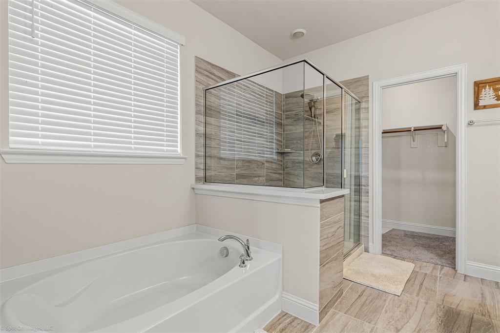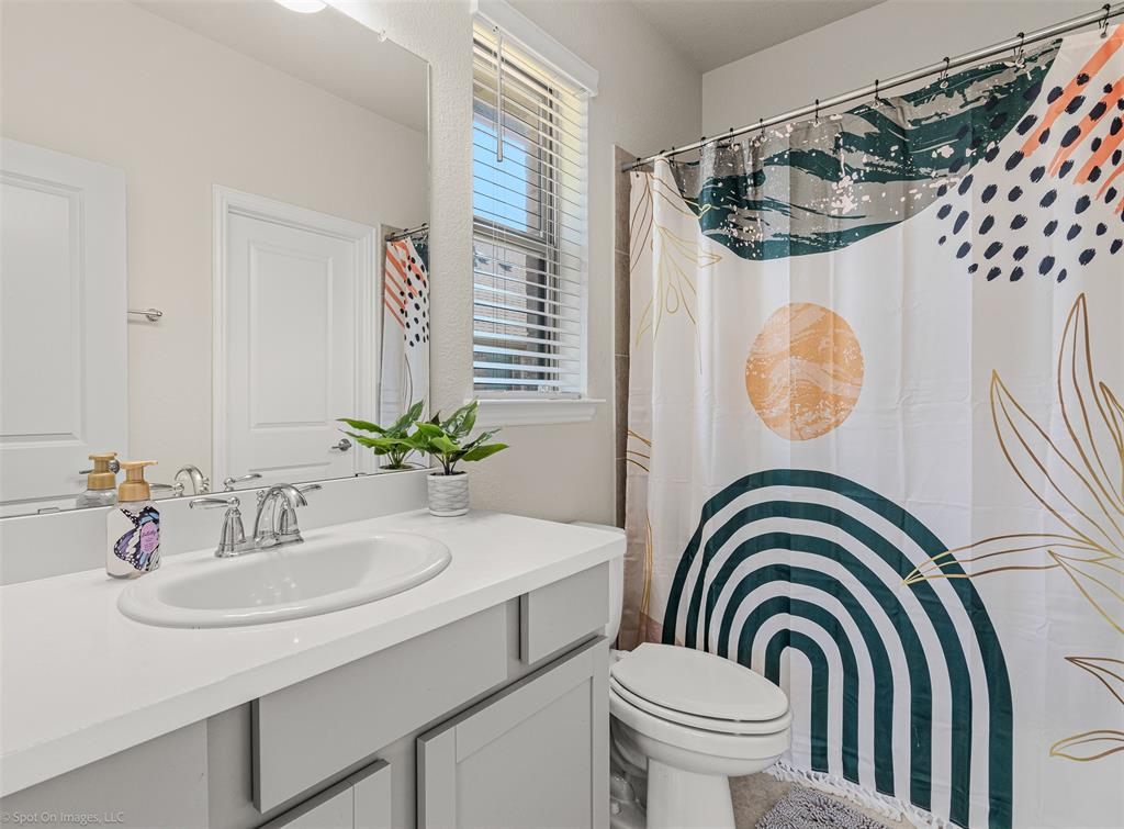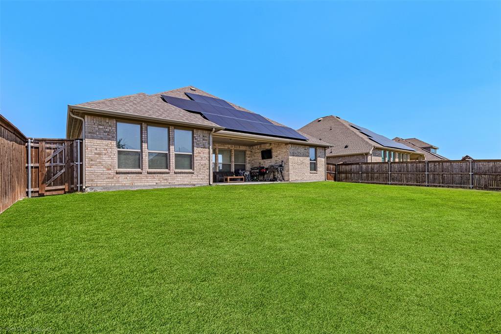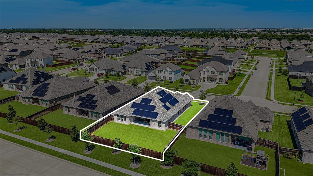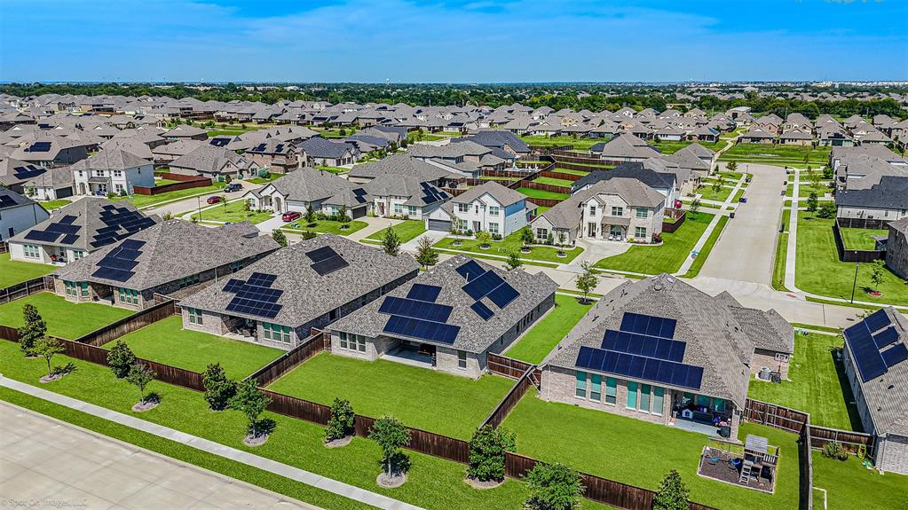 The private primary suite, tucked at the back, features two walk-in closets and a spa-like bath with soaking tub, separate shower, and dual vanities. Two additional bedrooms share a full bath in a split layout. Extras include a full-size utility room with a mud area, a powder bath for guests, and solar panels that generate surplus energy—keeping your bills very low. Just wait until you see the electric bills! Smart home devices include the Central AC Heating app, a no-touch water-saving kitchen faucet, a second full bath with a smart shower head radio, and a Tankless Water Heater.
