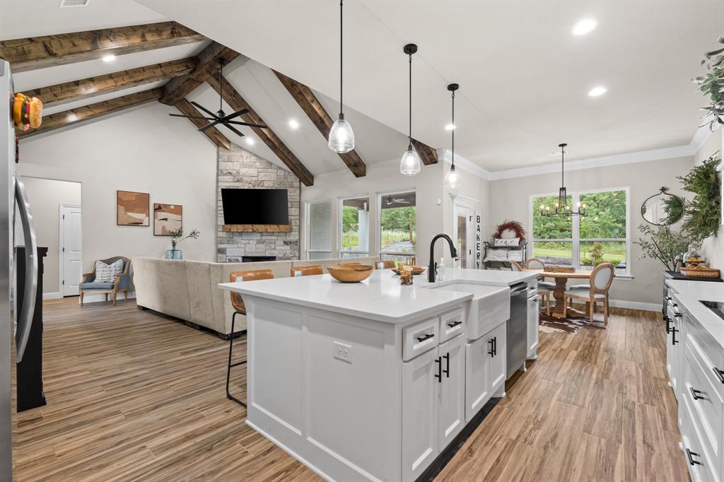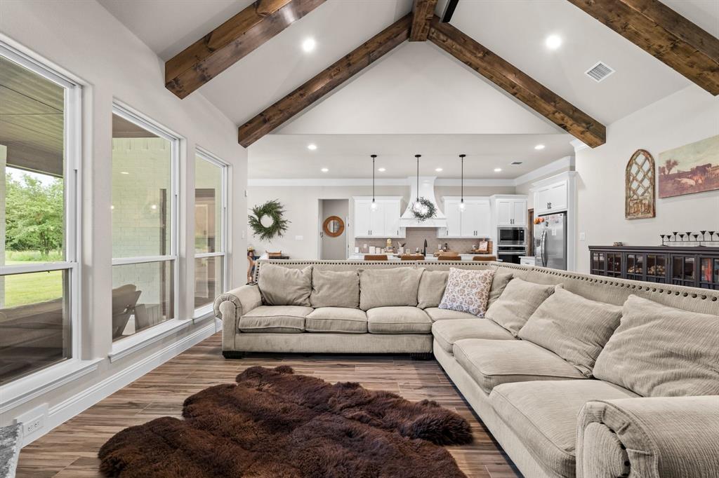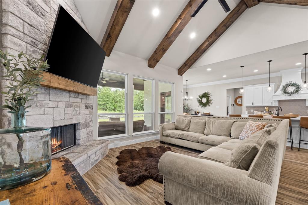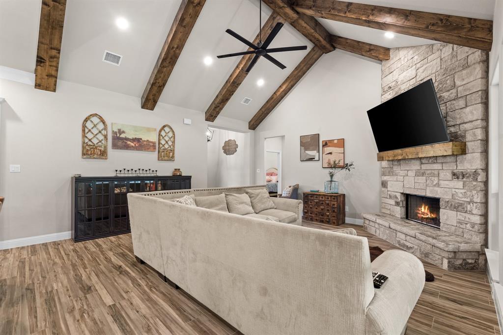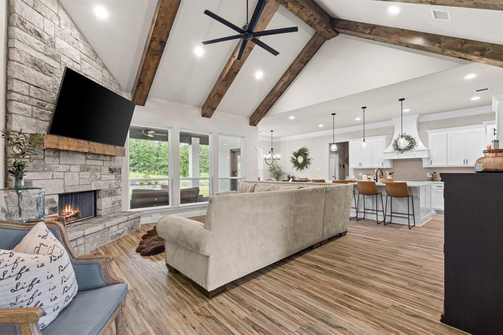 Blending craftsmanship with functionality, this home boasts a large living room featuring a striking floor-to-ceiling fireplace and plenty of open space—ideal for family gatherings or relaxing evenings. The expansive great room, accentuated by a beamed cathedral ceiling, wood tile floors, a floor-to-ceiling stone fireplace, and a wall of windows inviting in natural light, is perfect for entertaining or unwinding.