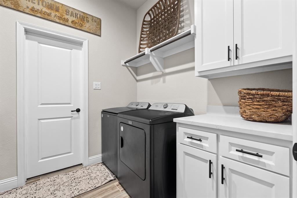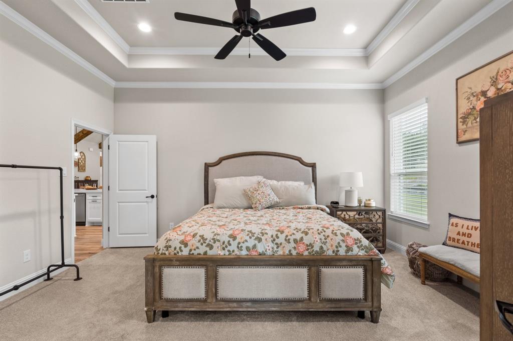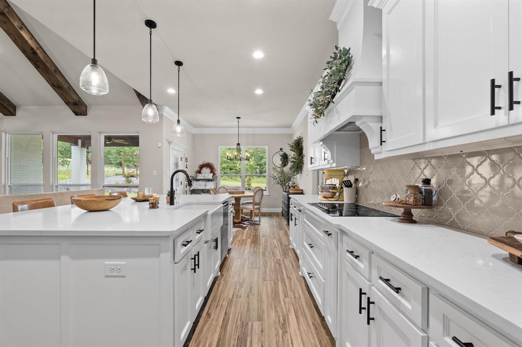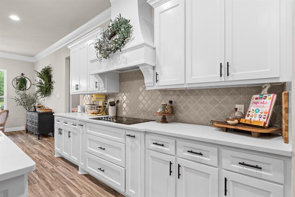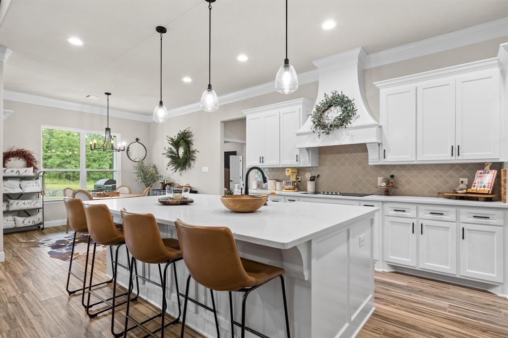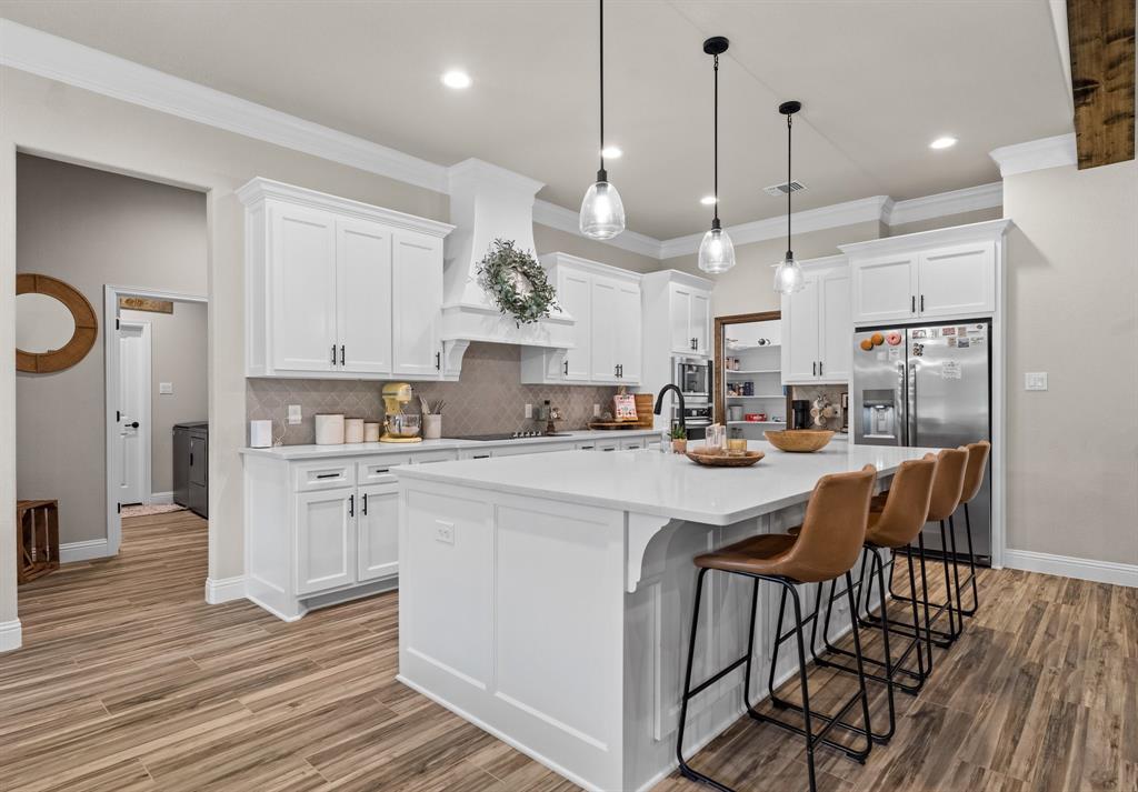 The modern kitchen offers ample counter space and a thoughtfully designed layout perfect for everyday living and entertaining. It includes a walk-in pantry, oversized kitchen island, stainless steel appliances, and a custom vent-a-hood that enhance its appeal.