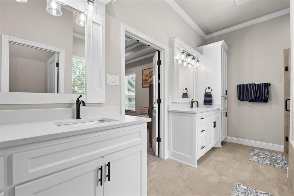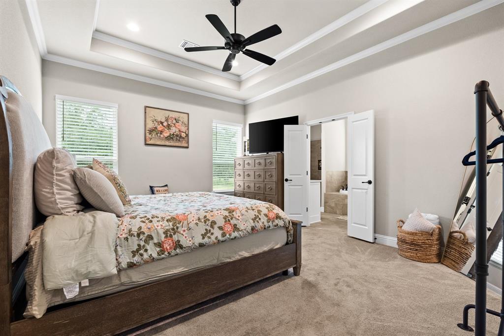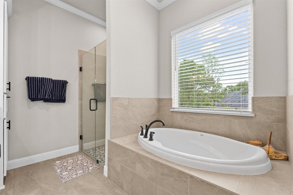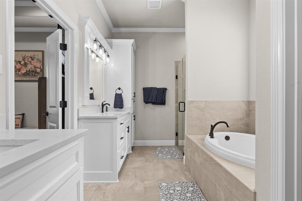 The spacious primary suite acts as a private retreat, with an ensuite bathroom that feels like a spa: complete with a soaking tub, dual vanities, and a separate shower.