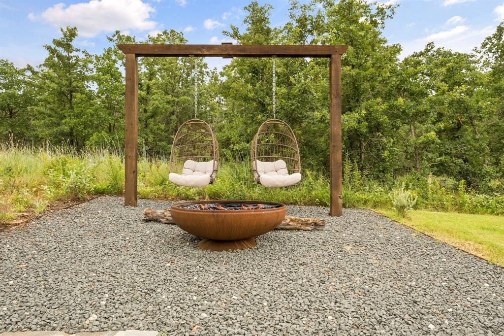 In-ground irrigation systems in both the front and backyard help maintain the lush landscape. The beautifully crafted retaining wall and fire pit with swinging chairs add charm and ambiance to the outdoor space. Embrace the small-town atmosphere and wide-open spaces, offering a peaceful country escape just minutes from town!