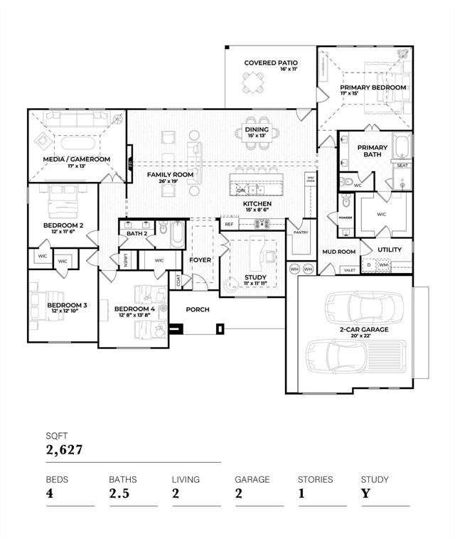 MLS# 20800178 - Built by Dunhill Homes - Ready Now! ~ Discover luxury living in this expansive 2,627 sqft home featuring 4 spacious bedrooms, each with walk-in closets, 2.5 baths, and a 2-car garage. The open-concept great room with a cozy fireplace flows into a gourmet kitchen boasting waterfall countertops, Samsung appliances, and a walk-in pantry, while the media or game room and dedicated study add versatility for work and play. Retreat to the primary suite with a massive walk-in closet connected to the laundry room, an oversized shower, and a private patio for ultimate relaxation.