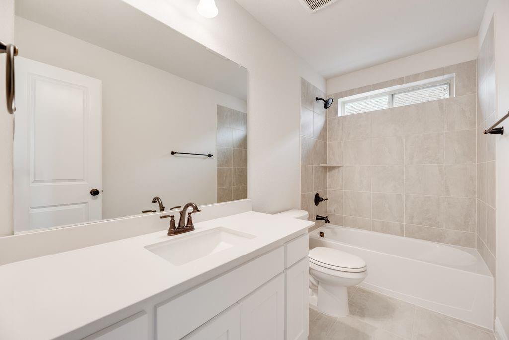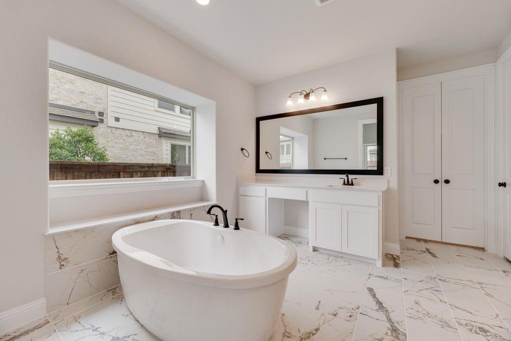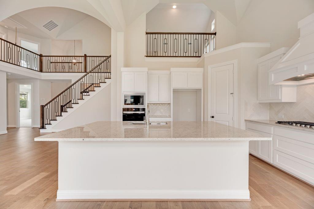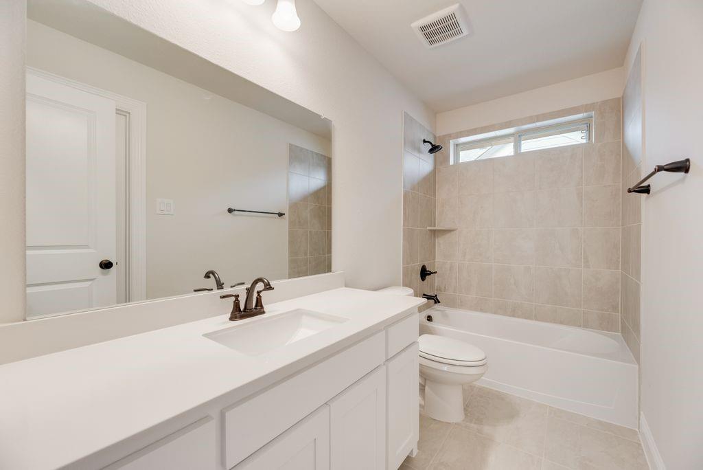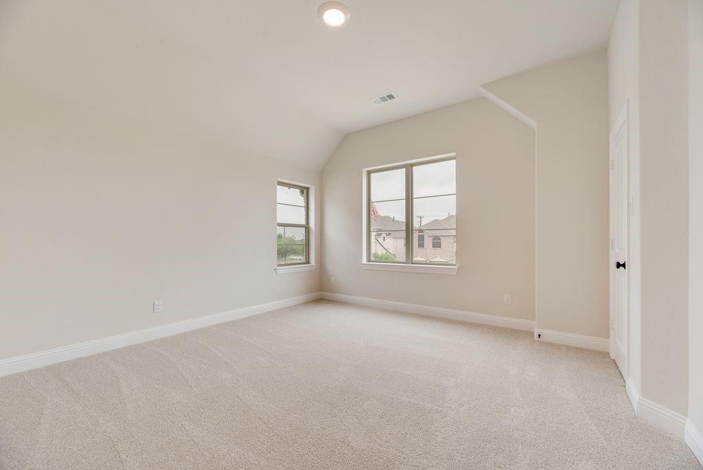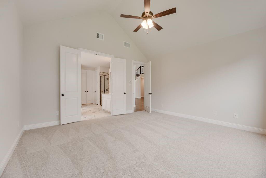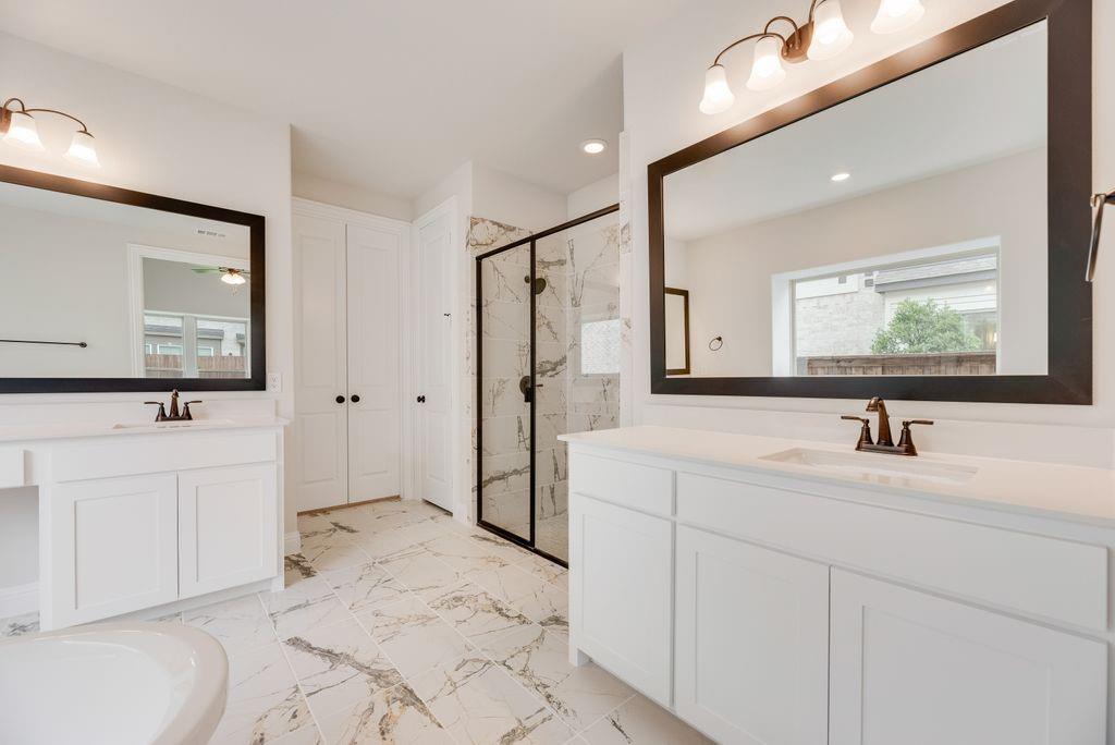 New Modern White bricked home on a North Facing homesite. New Grand Home JUST COMPLETED in Frisco ISD. Neighborhood pool, playground, treed greenbelt & hike & bike trail. Fantastic Grand Whitehall design with 5 bedrooms, vaulted family room with fireplace & Groin Vaulted ceilings, home office or den, game room, & Media Room or Children's Retreat wired for surround sound. Three downstairs bedrooms - one can be a guest suite & the 2nd a nursery or 2nd office. Open concept Kitchen has Shaker cabinets, granite slab tops, stainless steel appliances, 5 burner gas cooktop with custom vent hood, full bowl sink, tile backsplash, trash can drawer & island. Lots of wood floors & a Full oak staircase with modern iron railing extended along upstairs, 8-foot interior doors & rocker switches. Primary Bath has separate double vanities with rectangle sinks, glassed shower & free-standing tub. Laundry Room has a convenient sink. Walking distance to Miller Elementary School. New Wilkenson Middle! Energy star certified with R 38 & tankless water heater for super-efficient energy bills.