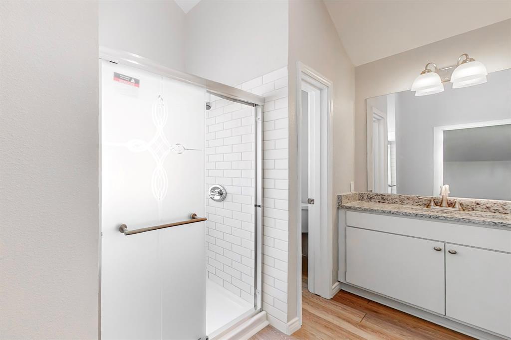 An open staircase enhances the home's architectural flair, leading to a versatile loft space ideal for a home office or a cozy reading nook. Upstairs, the private suite offers a vaulted ceiling, an oversized walk-in closet, and a luxurious en-suite bath complete with a double granite vanity, subway tile finishes, and updated flooring. Completing the home’s interior is a generously sized downstairs bedroom and an adjacent full bath, updated with a granite vanity, subway tile tub-shower surround, and modern fixtures.