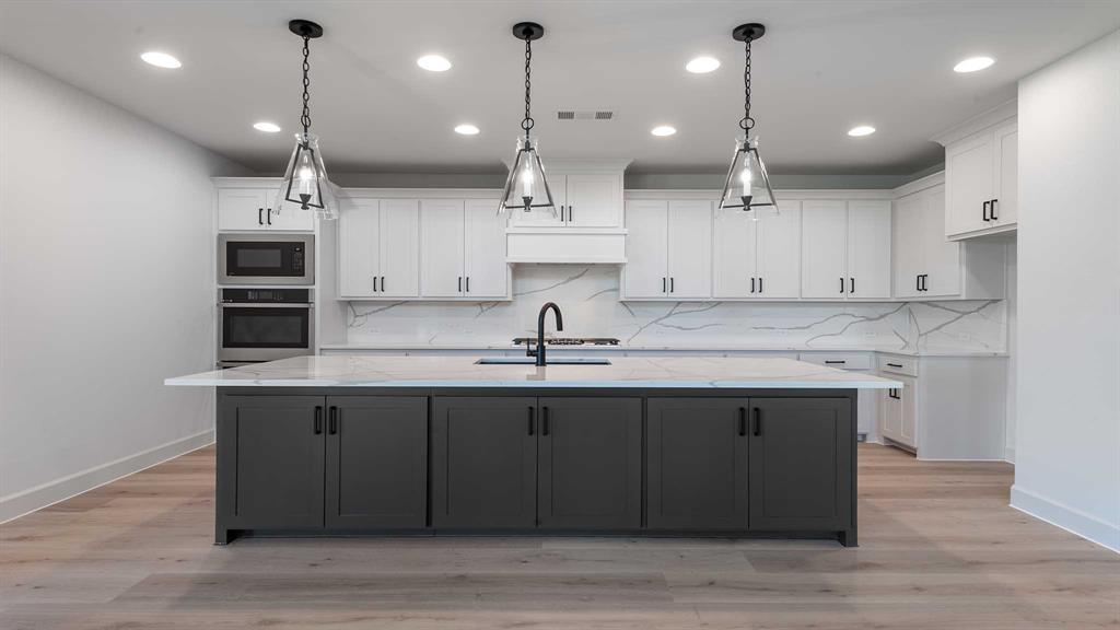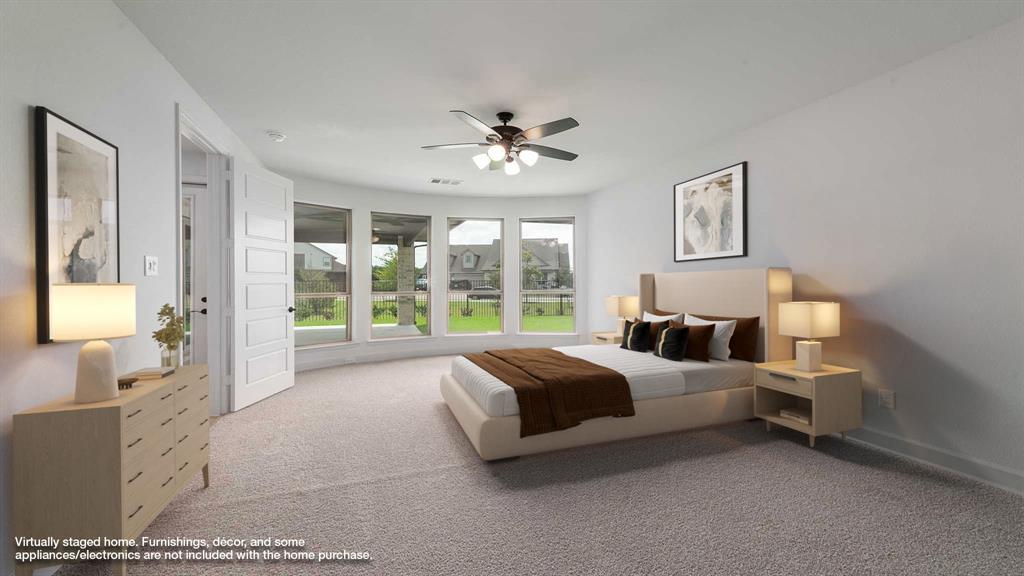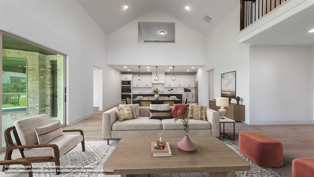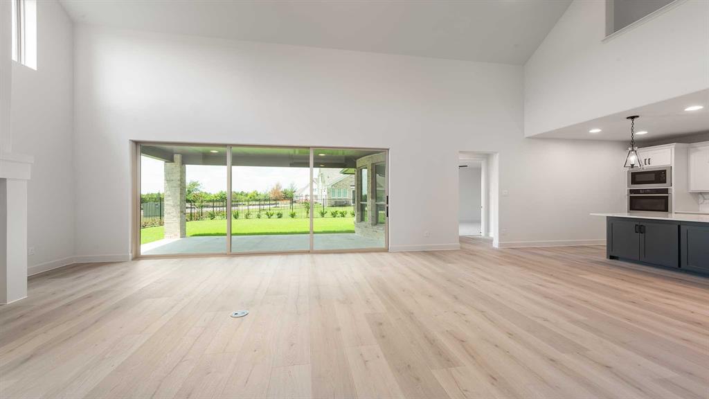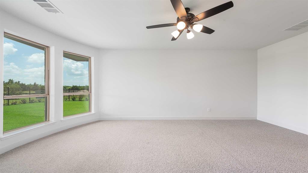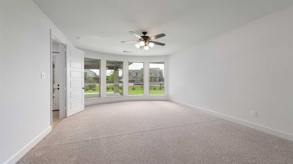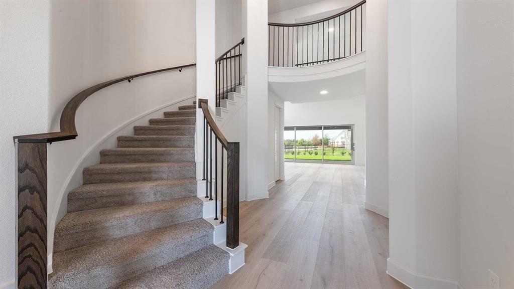 Large porch area leads to a two-story rotunda entry with a 19-foot ceiling. Home office with French doors. Guest suite with a full bath and a large closet. Kitchen features an island with built-in seating space, double wall oven, 5-burner gas cooktop, lots of counter space and a large walk-in pantry. Two-story dining area leads to the open family room with a wood mantel fireplace and sliding glass door. Secluded primary suite with a curved wall of windows. Double doors lead to primary bath with dual vanities, a freestanding tub, a separate glass-enclosed shower and two large walk-in closets. Curved staircase leads to the second level featuring a game room, a theatre room with French doors and a guest suite with a full bath and a walk-in closet. Covered backyard patio. Mud room leads to the four-car garage.