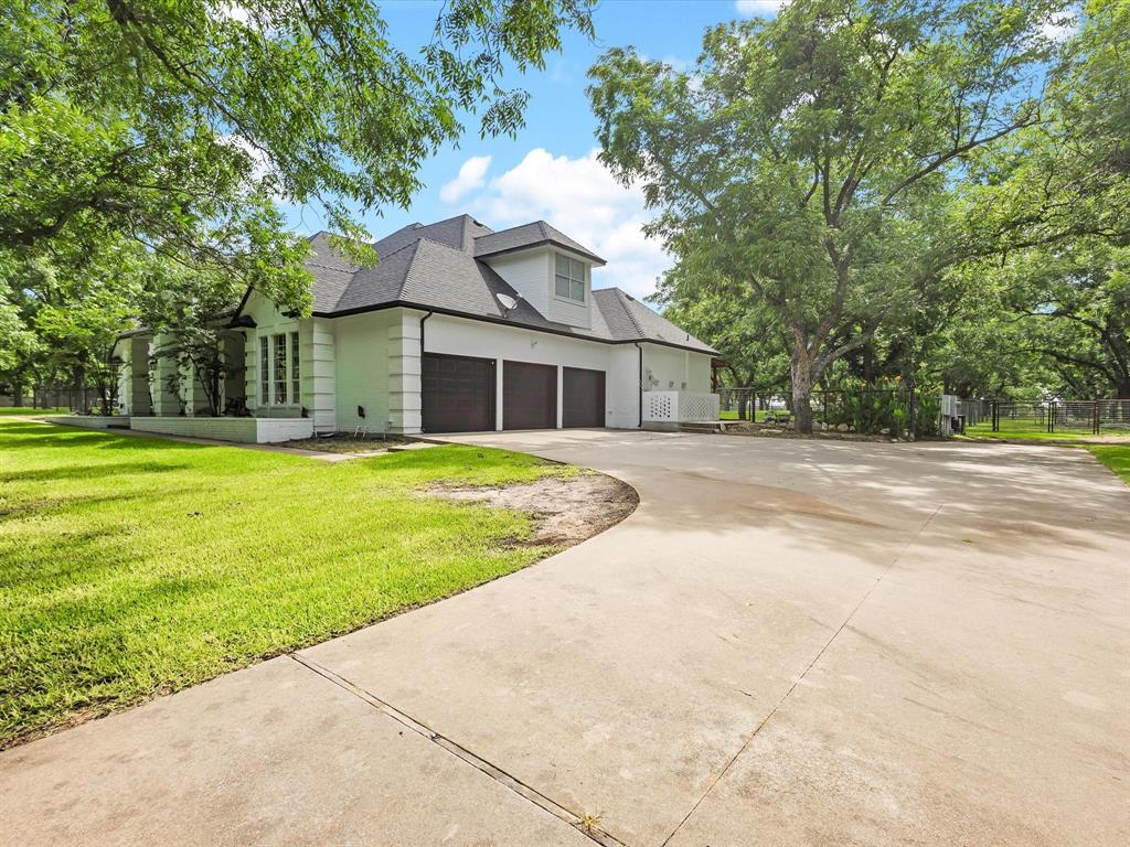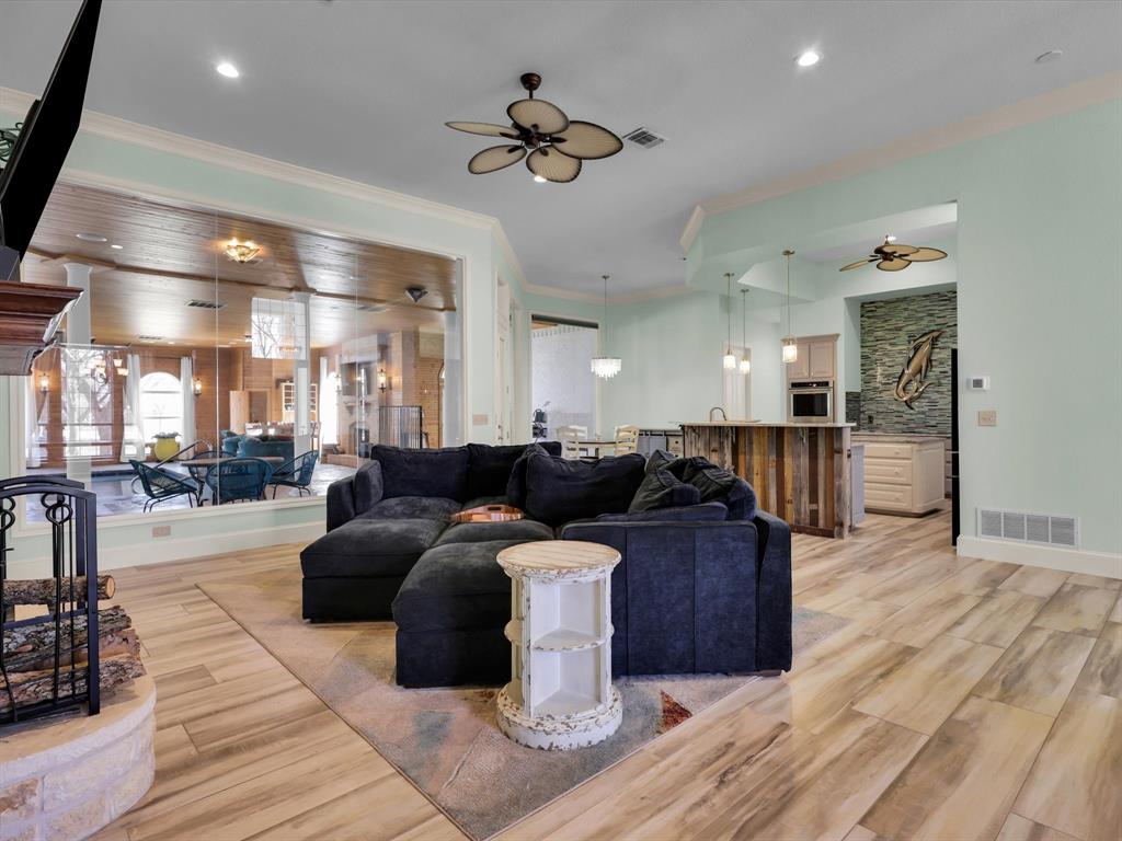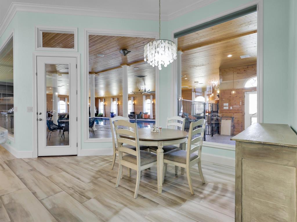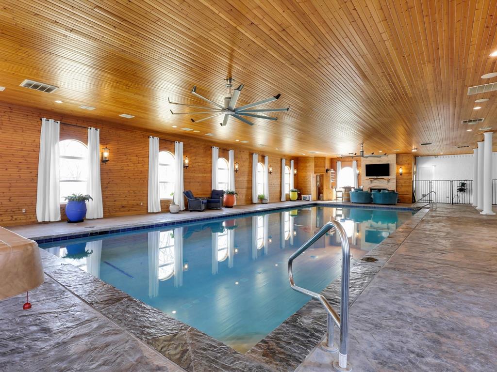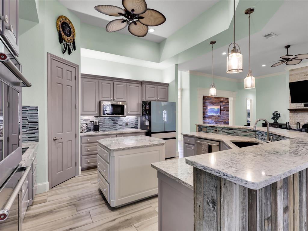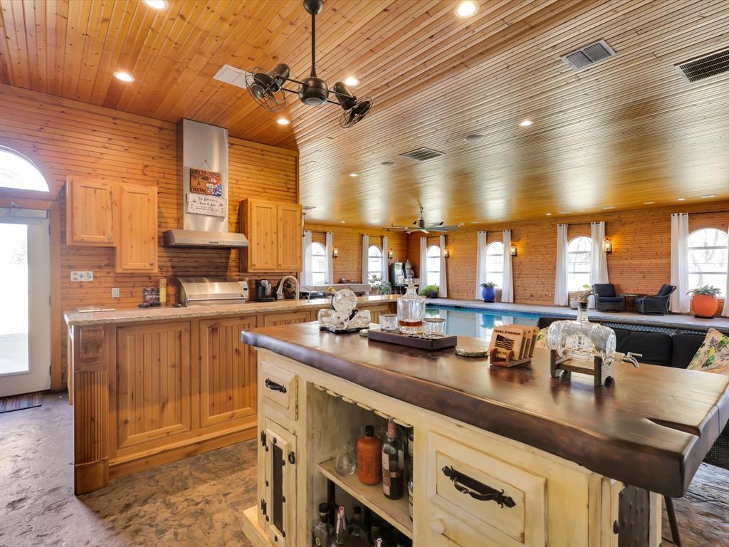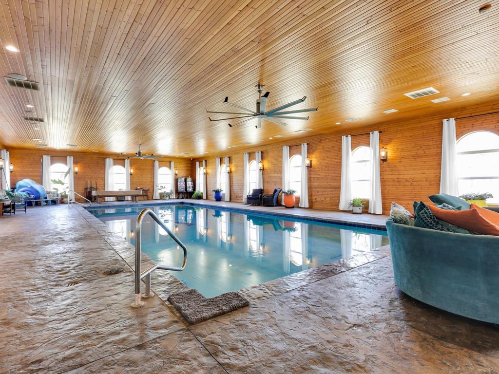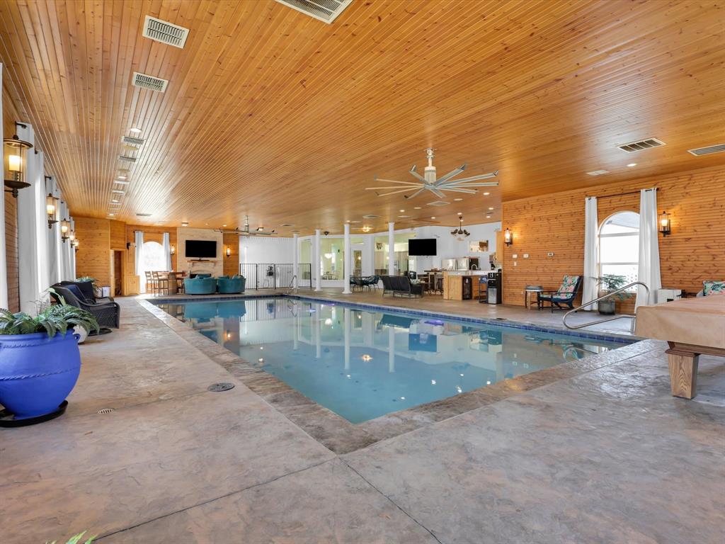 RARE FIND WITH AN INDOOR POOL! This property is a masterfully renovated estate offering over 7300 square feet of sophisticated living on 3.36 fully fenced acres in prestigious, amenity rich, Pecan Plantation. From the moment you arrive, this distinguished property commands attention with mature pecan trees, and serene natural surroundings frequented by deer and local wildlife. Designed for refined living and effortless entertaining, this 4 bedroom, 4.5 bath residence offers an extraordinary layout including 2 beautiful primary suites, one featuring a bath with soaking tub, oversized shower, and remote controlled electric shades for privacy and comfort. A dedicated executive office is richly appointed with custom wood accents and a striking accent ceiling, creating the ideal space for remote work or quiet study. The heart of the home is a chef's dream: a sleek, modern kitchen outfitted with quartz countertops, a double oven, induction stove, and generous prep and storage space, all seamlessly integrated into the open concept living area with floor to ceiling windows that flood the space with natural light. One of the property's most remarkable features is the indoor pool, accessible directly from the main living area. This luxurious retreat is complete with a full kitchen, full bathroom, cozy fireplace, and a dedicated dehumidification system creating a private, climate controlled oasis of year round entertainment. Additional highlights include a spacious 3 car garage with new doors, a brand new roof, solar panels for energy efficiency, and a laundry room featuring a custom dog washing station. Equestrian enthusiasts will appreciate the 2 stall horse barn, while residents enjoy exclusive access to the community's golf course, tennis courts, marina, trails, parks and clubhouse, all within a secure gated environments. Every detail of this estate reflects a commitment to quality, comfort and modern elegance, and delivers a combination of luxury, lifestyle and location.