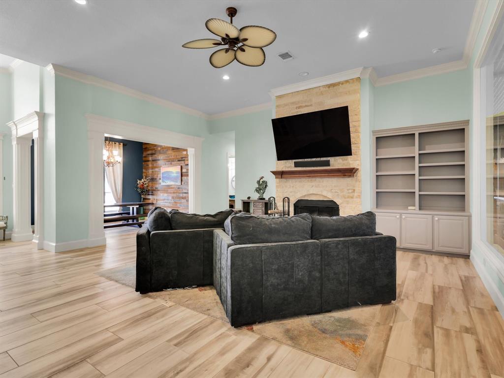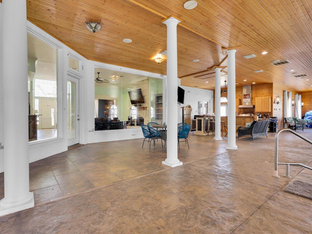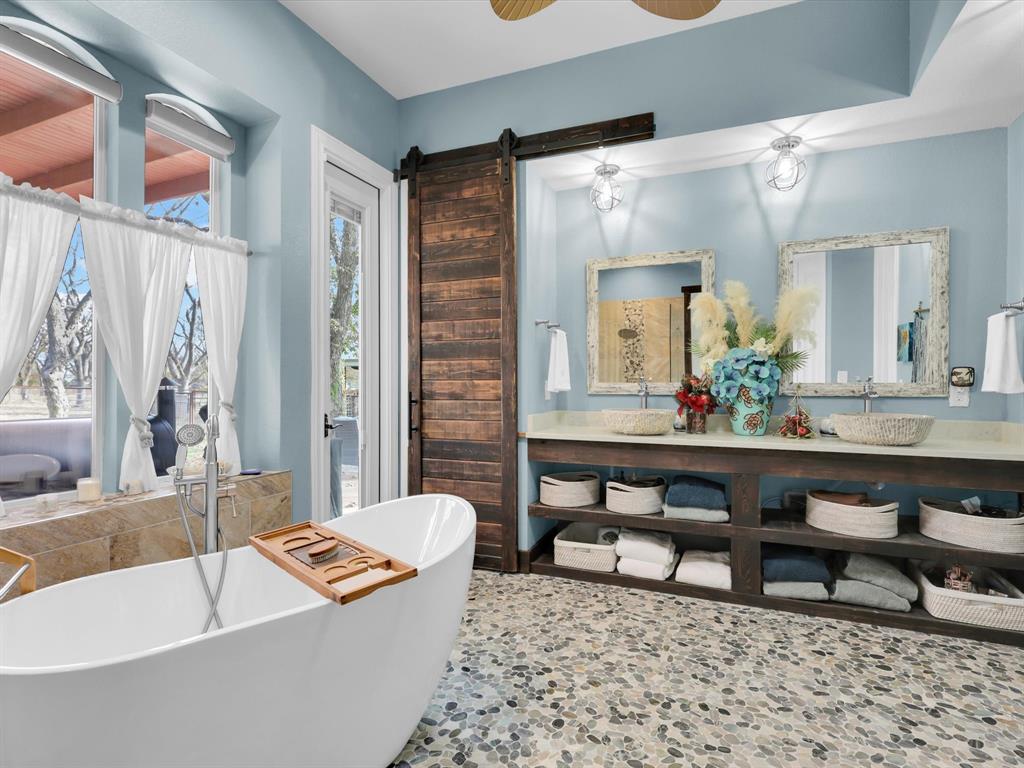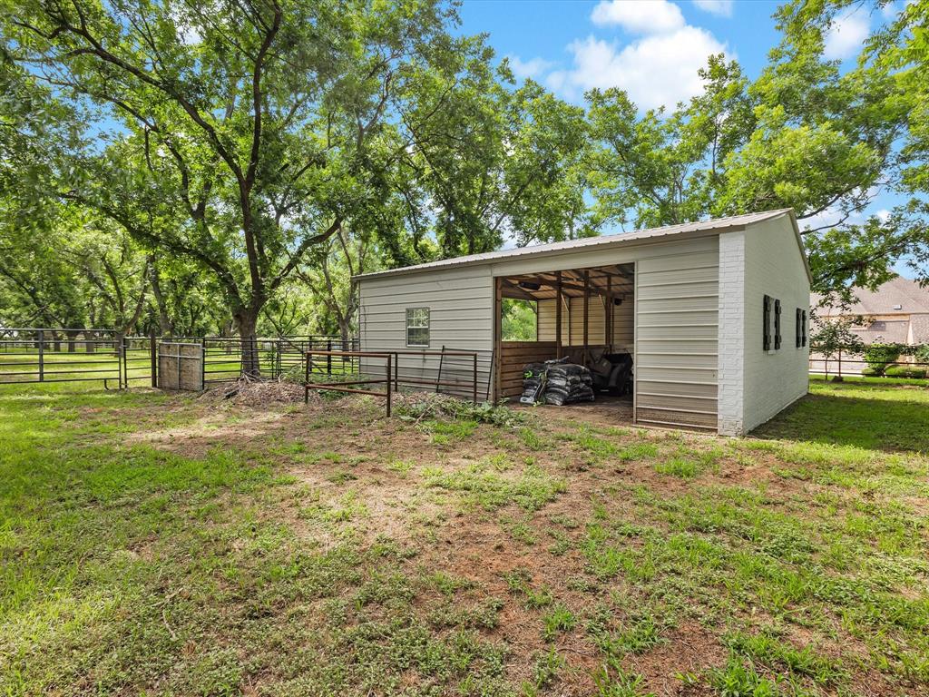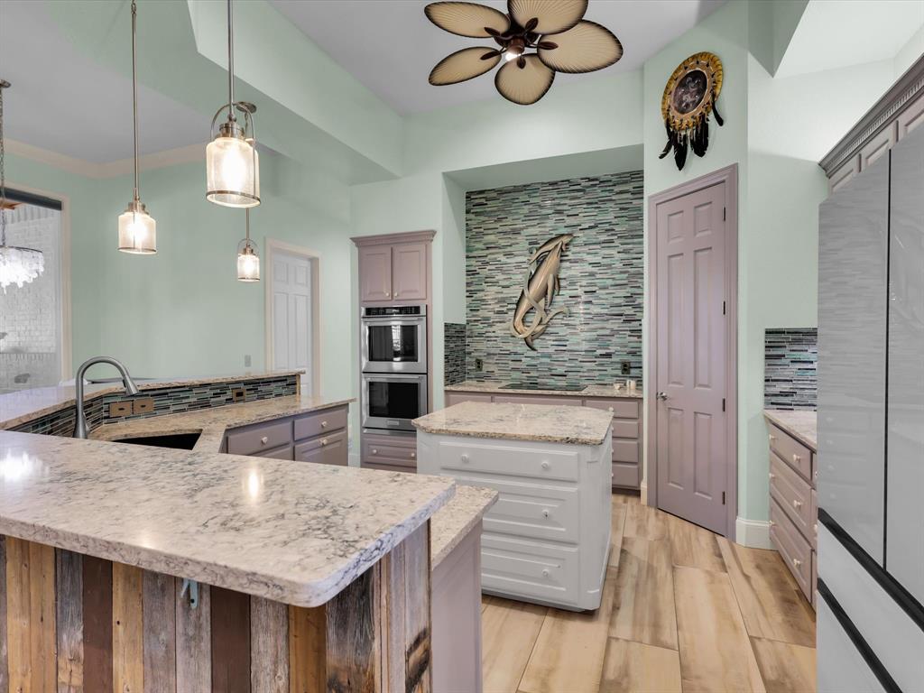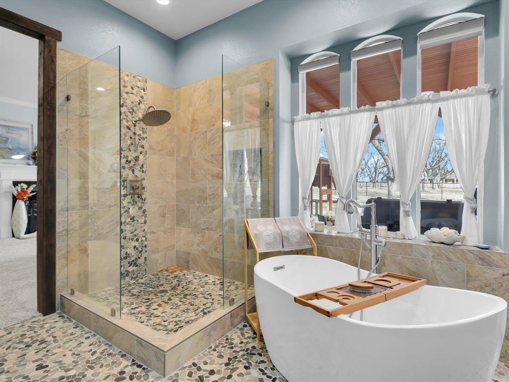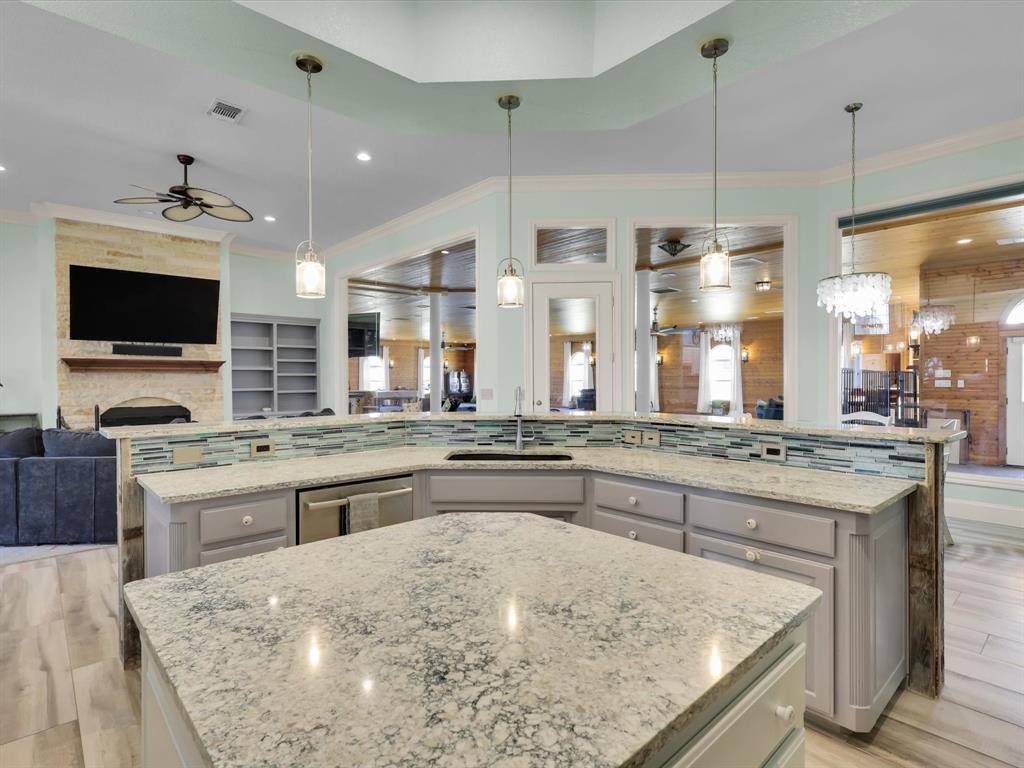 RARE FIND WITH AN INDOOR POOL! This property is a masterfully renovated estate offering over 7300 square feet of sophisticated living on 3.36 fully fenced acres in prestigious, amenity rich, Pecan Plantation. From the moment you arrive, this distinguished property commands attention with mature pecan trees, and serene natural surroundings frequented by deer and local wildlife. Designed for refined living and effortless entertaining, this 4 bedroom, 4.5 bath residence offers an extraordinary layout including 2 beautiful primary suites, one featuring a bath with soaking tub, oversized shower, and remote controlled electric shades for privacy and comfort. A dedicated executive office is richly appointed with custom wood accents and a striking accent ceiling, creating the ideal space for remote work or quiet study. The heart of the home is a chef's dream: a sleek, modern kitchen outfitted with quartz countertops, a double oven, induction stove, and generous prep and storage space, all seamlessly integrated into the open concept living area with floor to ceiling windows that flood the space with natural light. One of the property's most remarkable features is the indoor pool, accessible directly from the main living area. This luxurious retreat is complete with a full kitchen, full bathroom, cozy fireplace, and a dedicated dehumidification system creating a private, climate controlled oasis of year round entertainment. Additional highlights include a spacious 3 car garage with new doors, a brand new roof, solar panels for energy efficiency, and a laundry room featuring a custom dog washing station. Equestrian enthusiasts will appreciate the 2 stall horse barn, while residents enjoy exclusive access to the community's golf course, tennis courts, marina, trails, parks and clubhouse, all within a secure gated environments. Every detail of this estate reflects a commitment to quality, comfort and modern elegance, and delivers a combination of luxury, lifestyle and location.