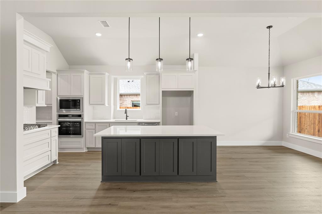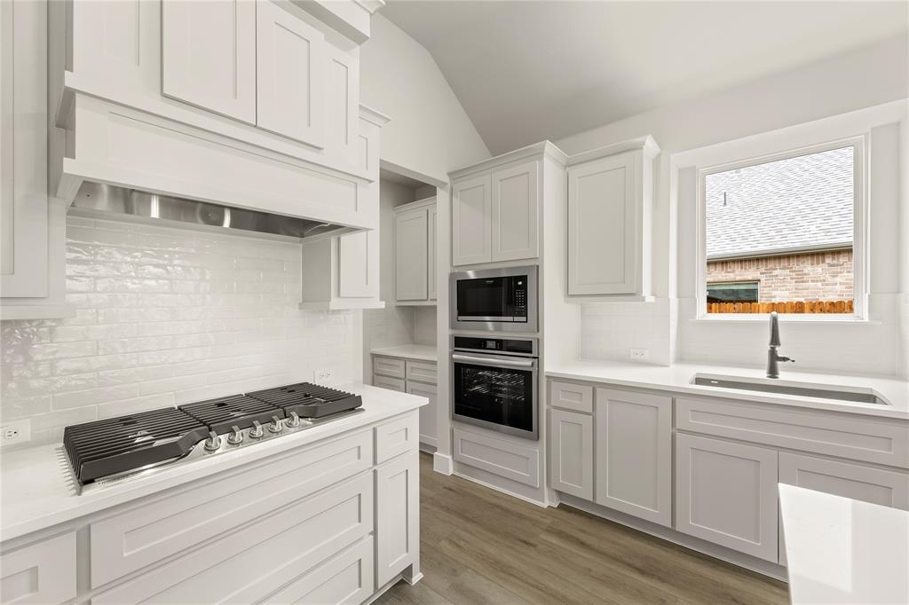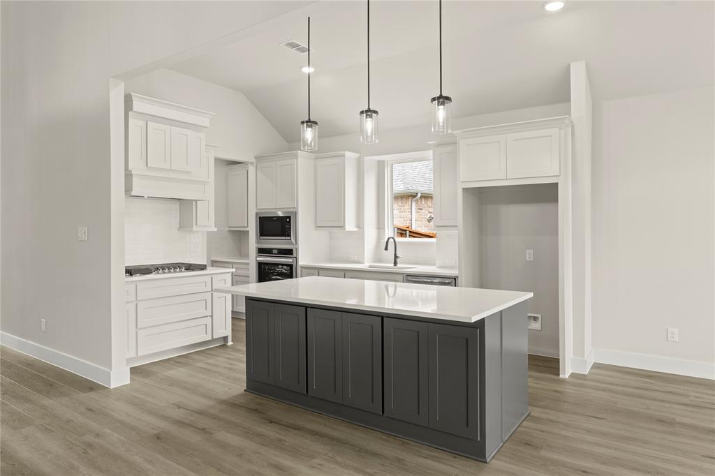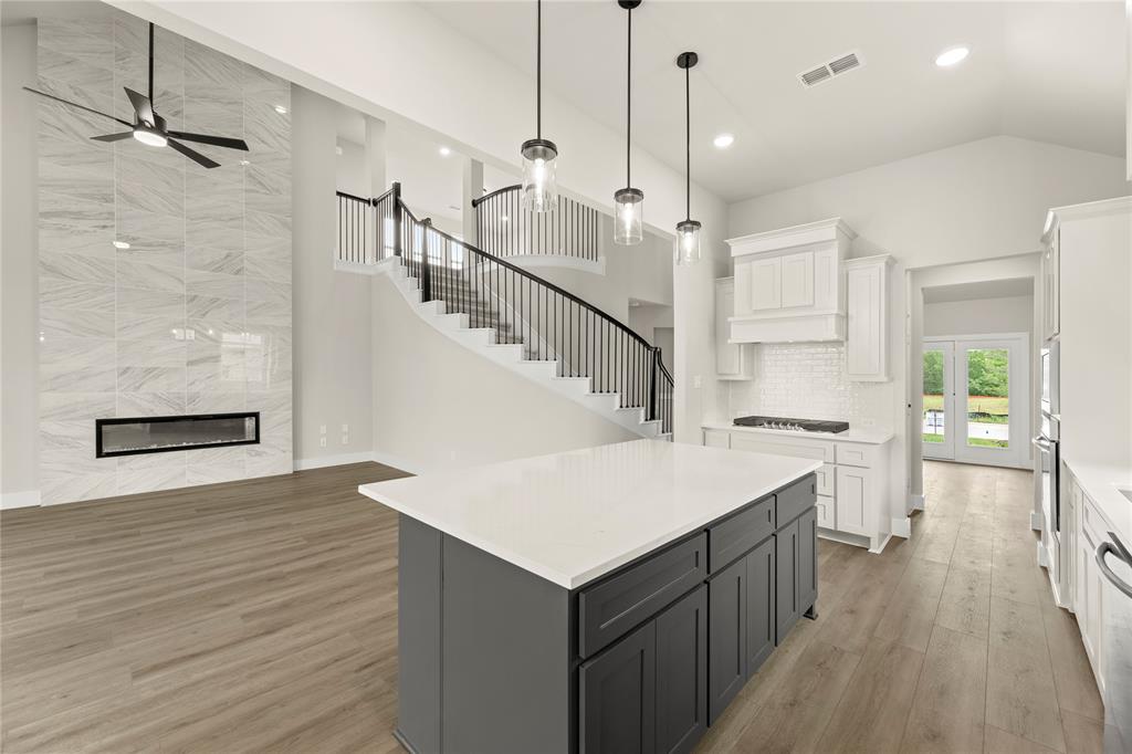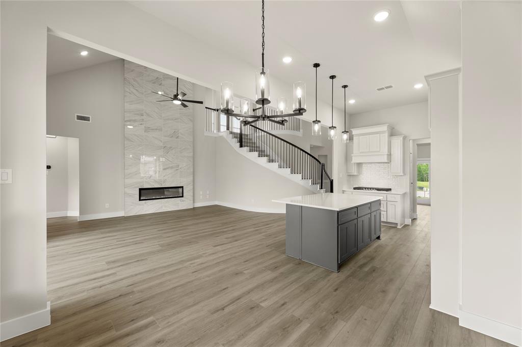 MLS# 20820921 - Built by First Texas Homes - Ready Now! ~ Up To $20K Closing Cost Assistance for Qualified Buyers on Select Inventory! See Sales Consultant for Details!Stunning 5-bedroom estate showcases an elegant upgraded elevation with welcoming front porch and extended back patio. The gourmet kitchen features a striking Blanco diamond sink, 5-burner gas cooktop, wood hood, and contrasting island with stylish pendant lighting. Premium finishes include shaker cabinets, ceiling-height fireplace, and luxury vinyl flooring in main living areas. The primary suite boasts modern LED lighting and upgraded tile. Upstairs offers plush carpeting with premium padding. Additional highlights include a 3-car garage, utility room storage, and refrigerator cabinet. This meticulously designed home perfectly balances luxury and functionality.