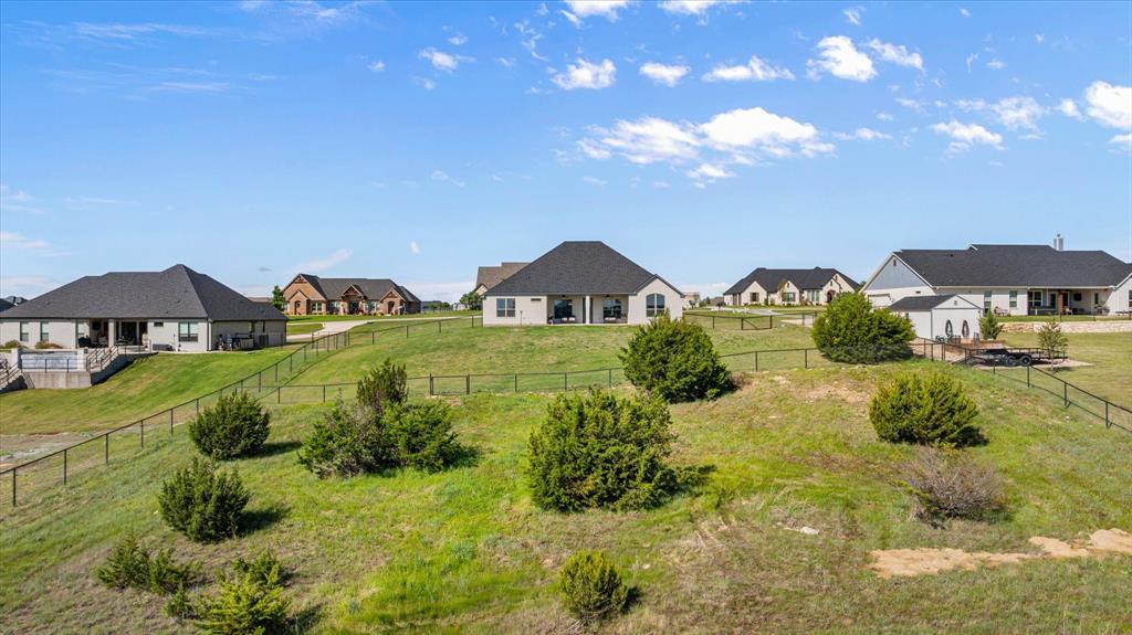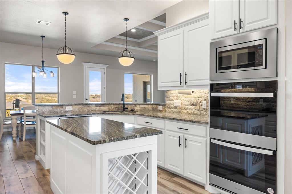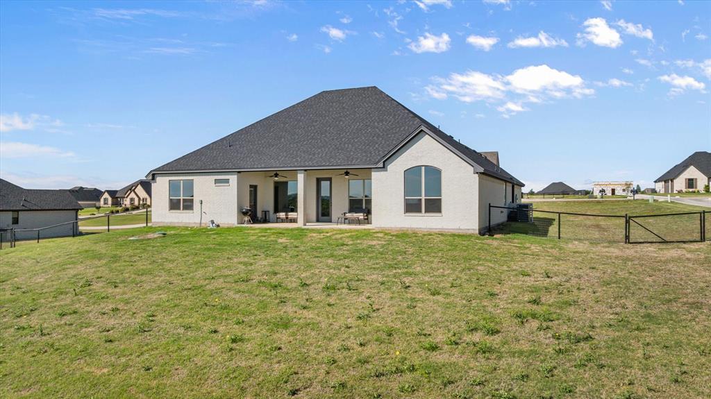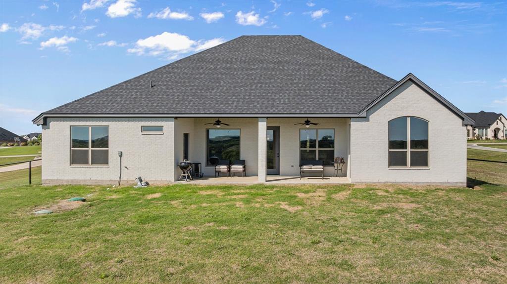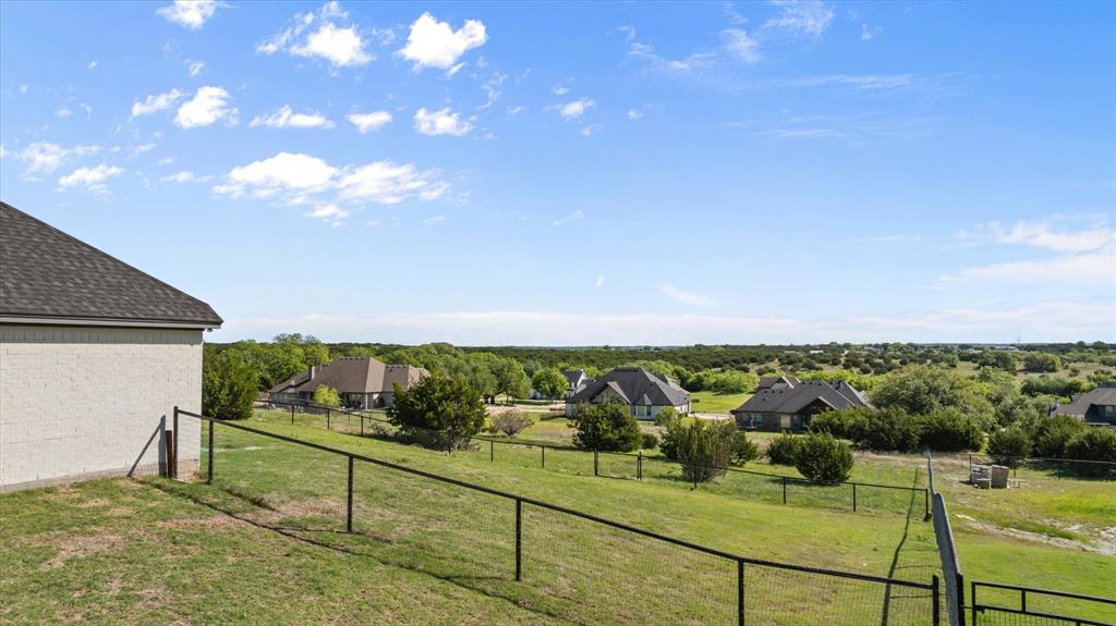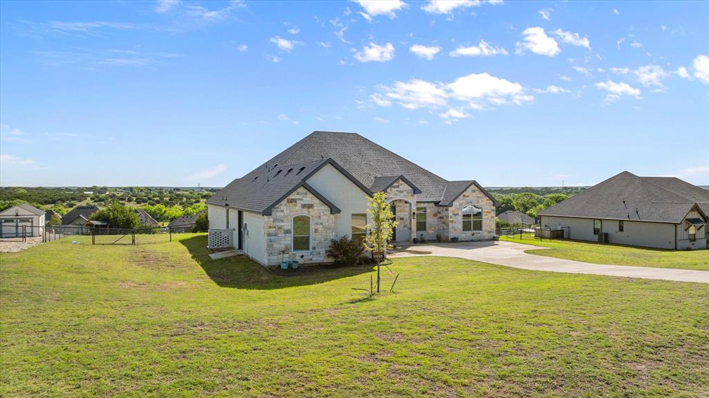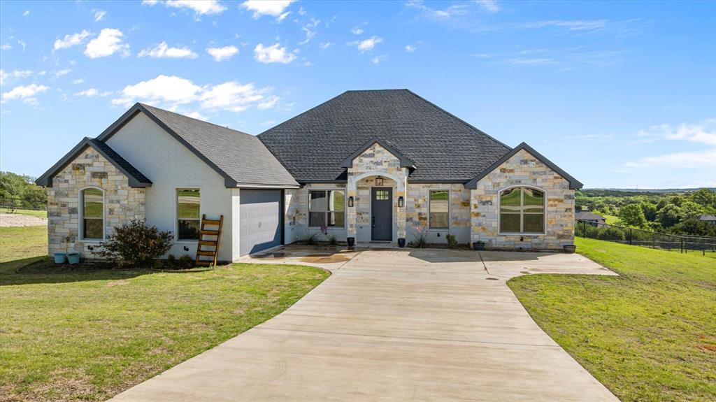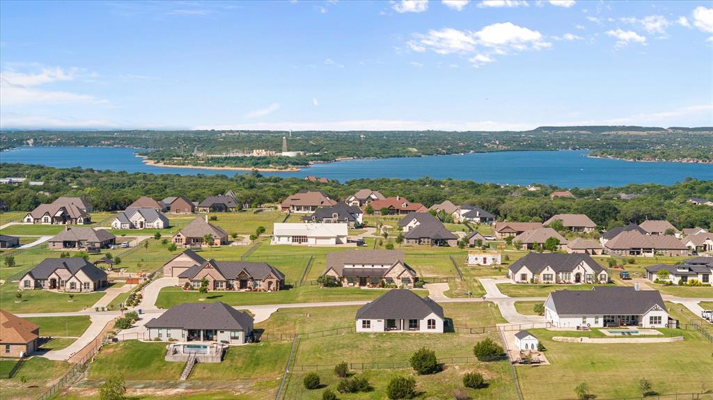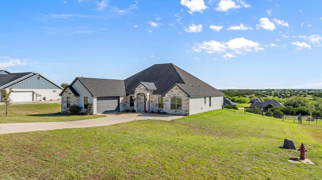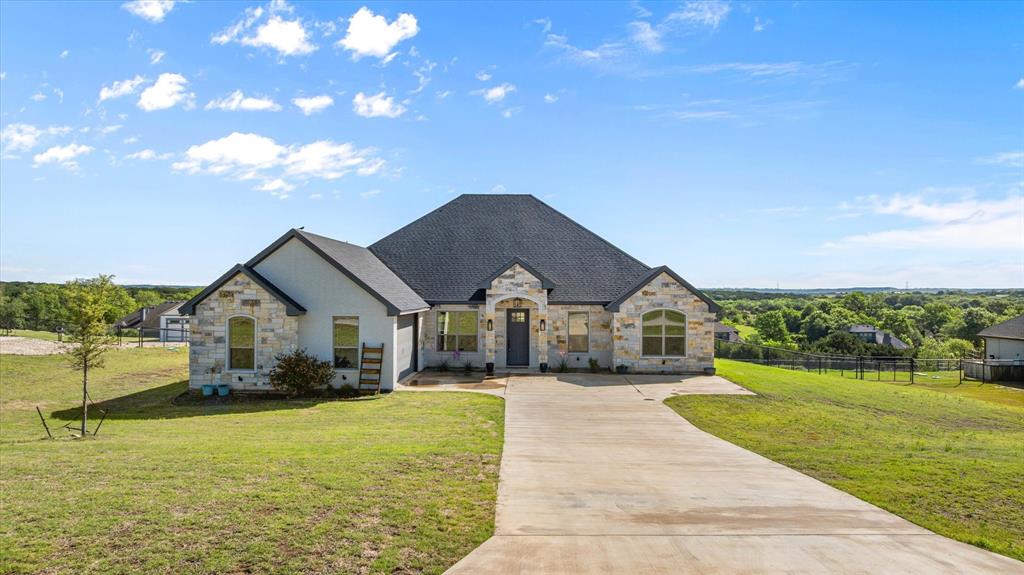 HUGE PRICE REDUCTION!! BRING AN OFFER!! Custom built home in prestigious Rolling Creek Ranch. This beautiful custom home built in 2022 features a modern layout and high-end features. With a modern gray paint-scheme and design, it offers tiled flooring, custom coffered ceilings, custom cabinetry and trim, huge chef's kitchen with counter to ceiling stone backsplash, large island and double ovens and large walk-in pantry, large master suite with his-and-her master closets that connect directly to the expansive laundry room, 3 spare bedrooms with 3 full baths, a dedicated office and dining room with a breakfast room off the kitchen. This home is perfect for a large family or for entertaining guests and family. Situated at the top of a hill that overlooks lake Granbury on an over 1 acre lot. The backyard is expansive offering huge possibilities with plenty of room for a pool or out-building. A rear-entrance garage door for your golf cart or lawn equipment is available as well. Built with efficiency in mind with double-paned windows, efficient HVAC, tons of insulation, efficient SS Energy Star appliances all means huge savings on your utilities. Come enjoy the pristine serenity of this quiet subdivision today!