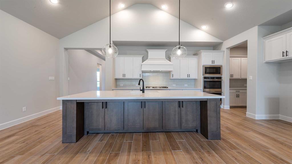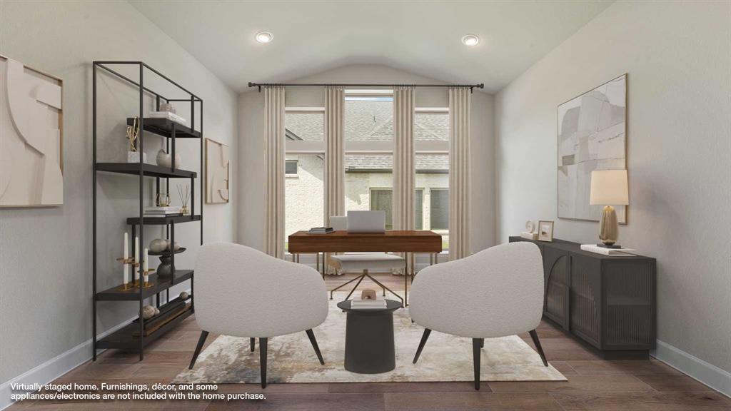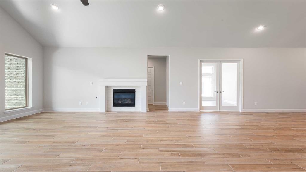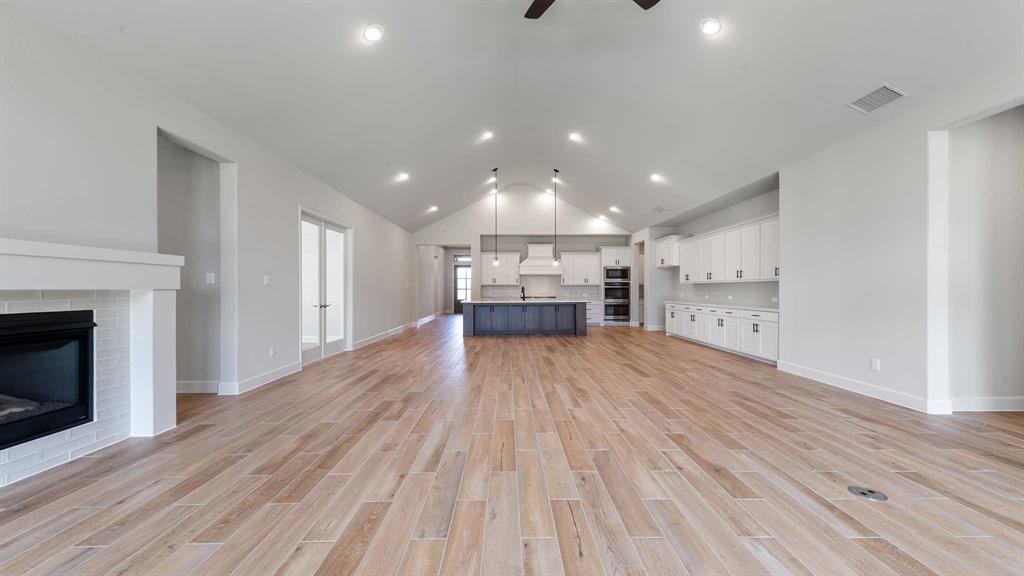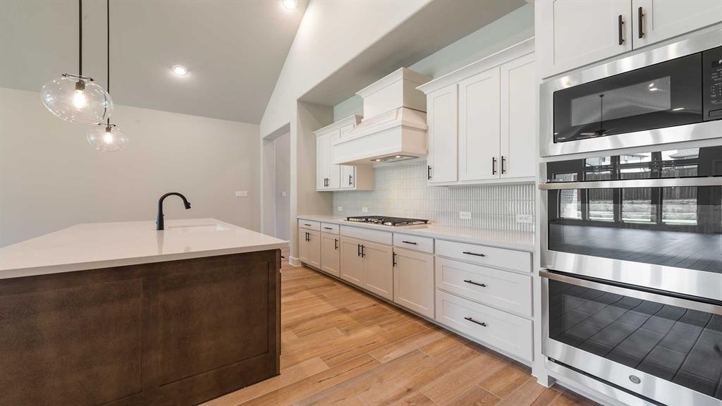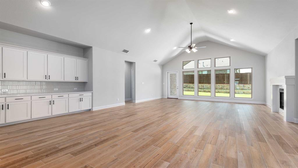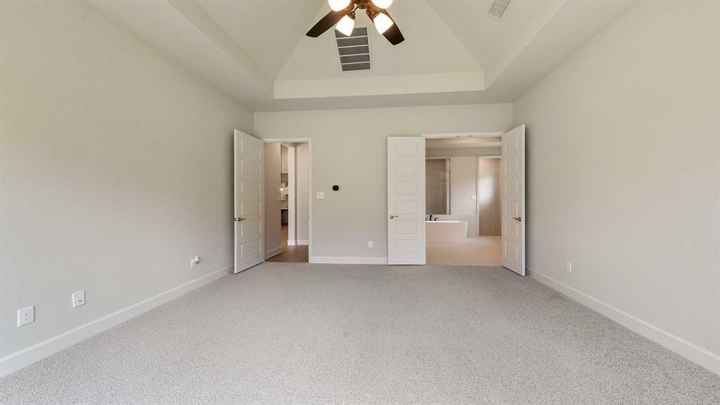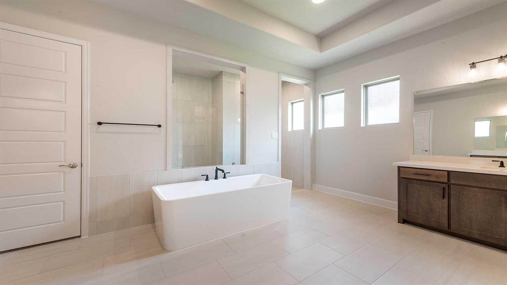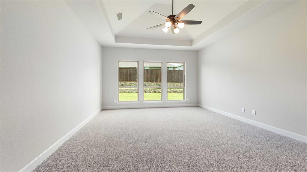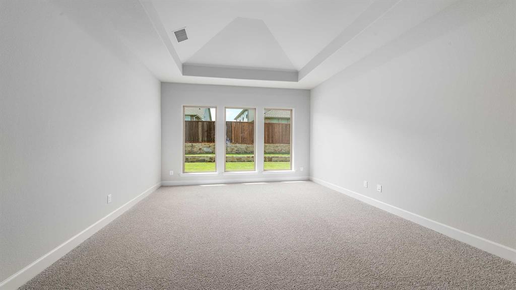 Welcoming entry with 12-foot ceilings flows to the family room, dining area and kitchen. Open family room with a wood mantel fireplace and wall of windows. Island kitchen with built-in seating space, butler's pantry, double wall oven, 5-burner gas cooktop and corner walk-in pantry. Home office with French doors just off the open floor dining area. Private primary suite offers 13-foot coffered ceiling, double door entry to bathroom, dual vanities, freestanding tub, spacious glass enclosed shower, and a walk-in closet with private access to the utility room. Half bathroom just off the game room with 13-foot coffered ceiling near rear of home with additional storage area. Guest suite with full bathroom and walk-in closet. Additional bedrooms with walk-in closets and a Hollywood bathroom complete this generous design. Covered backyard patio. Mud room with closet just off the three-car garage with additional garage bay space.