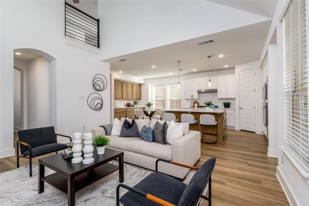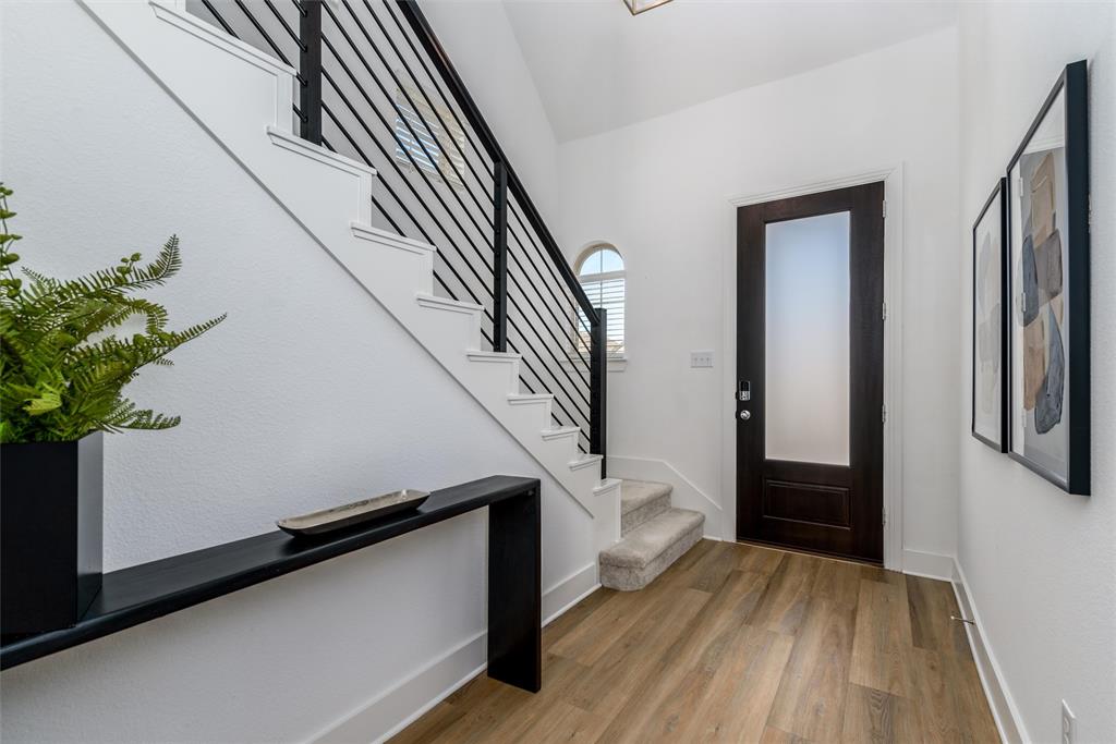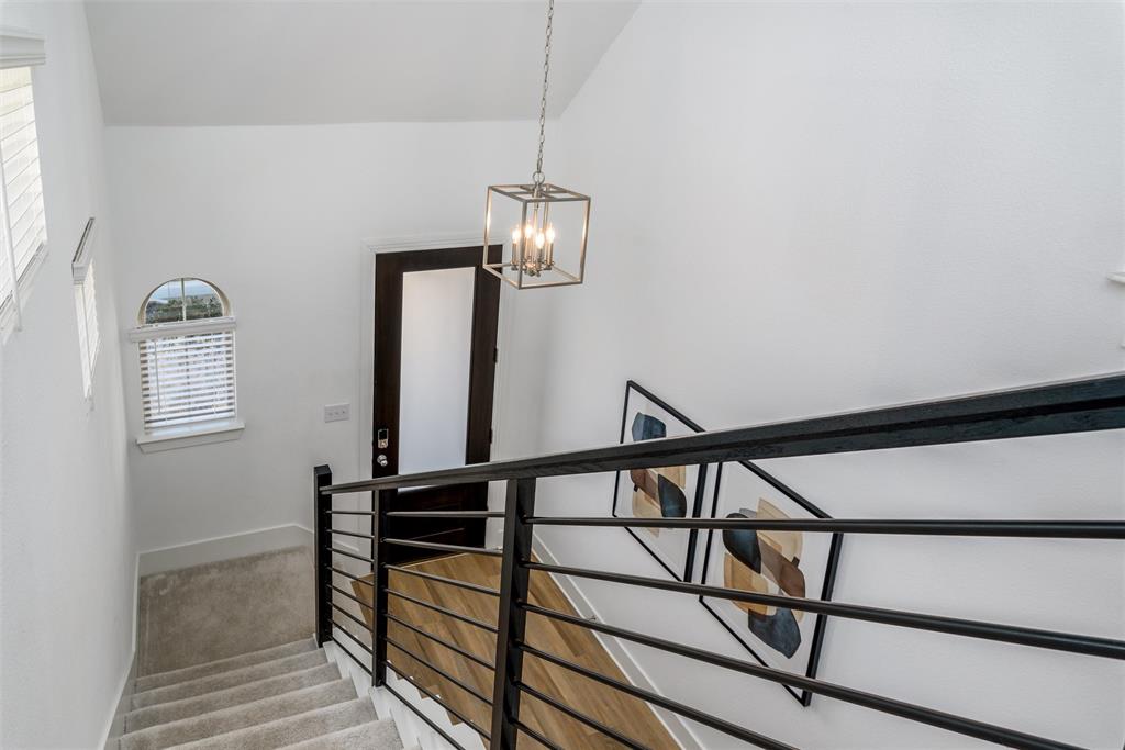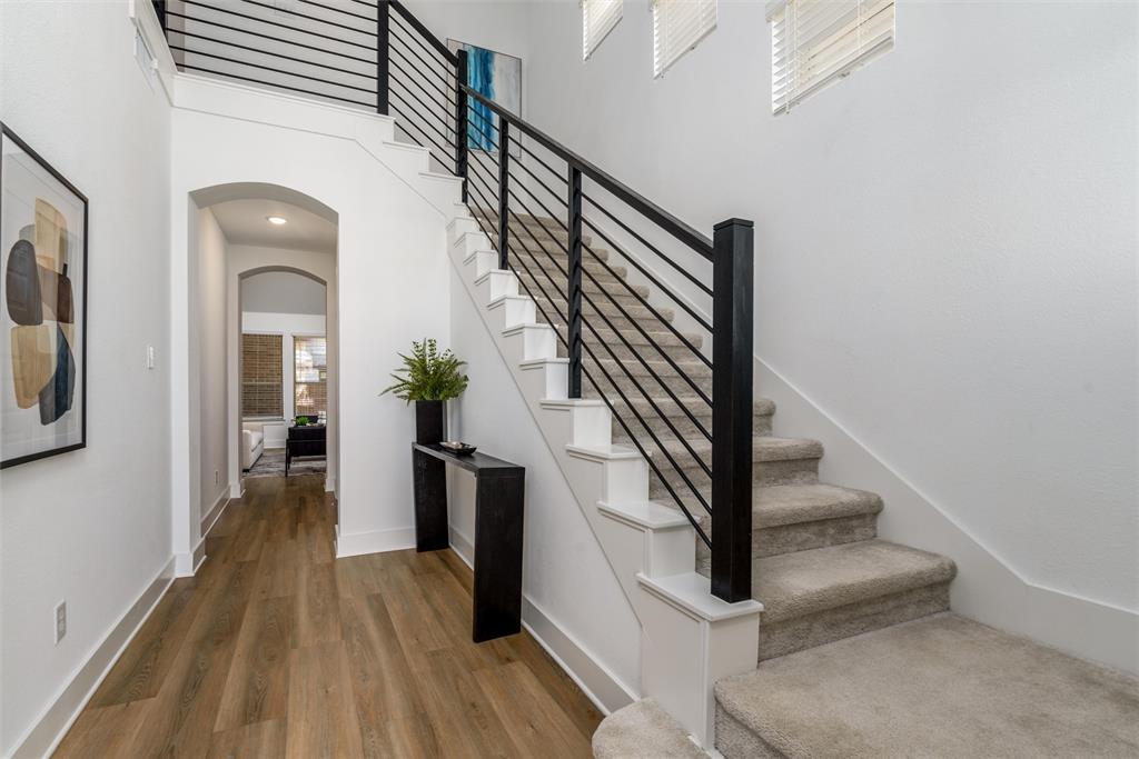 Open floor plan, and sleek wrought iron railings lend a modern and contemporary touch.