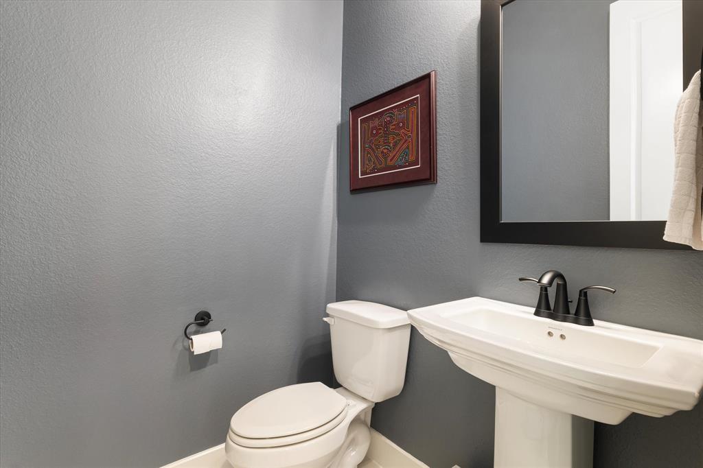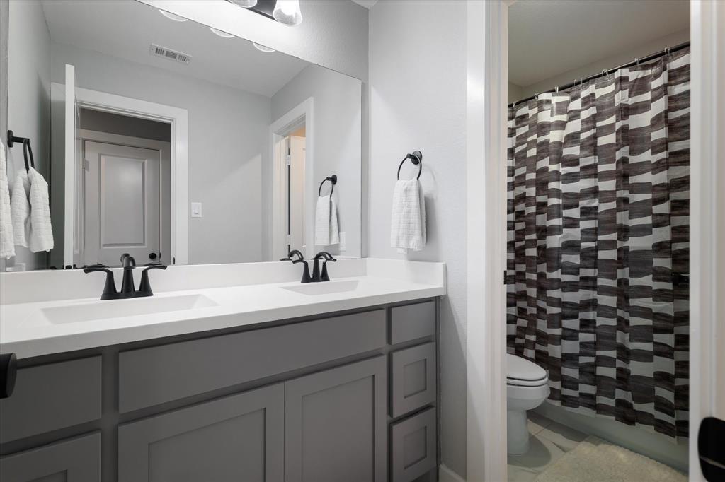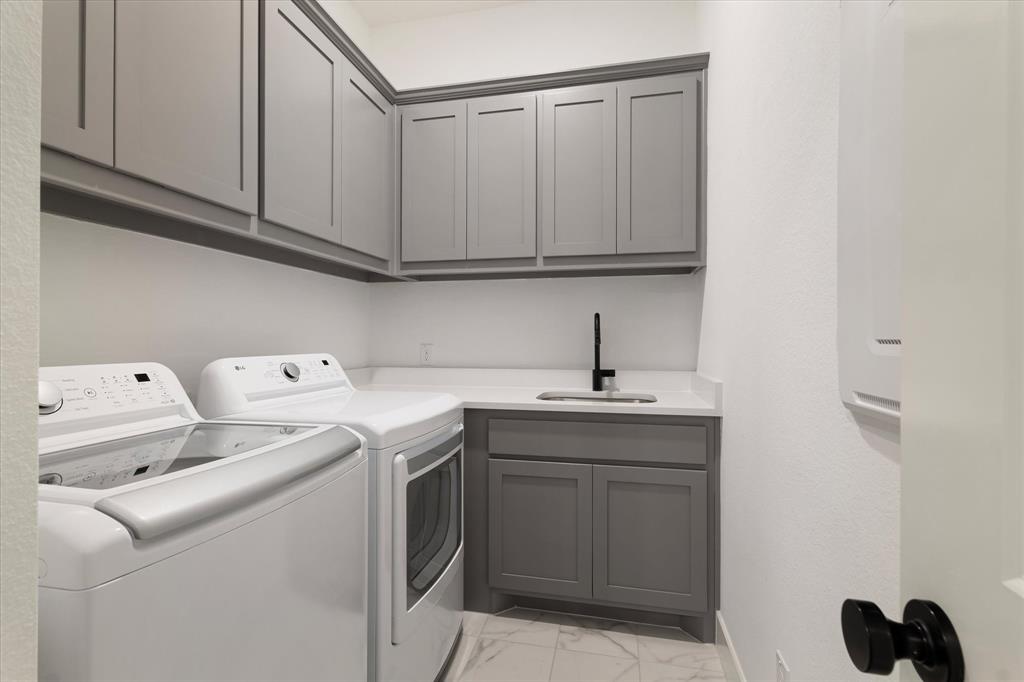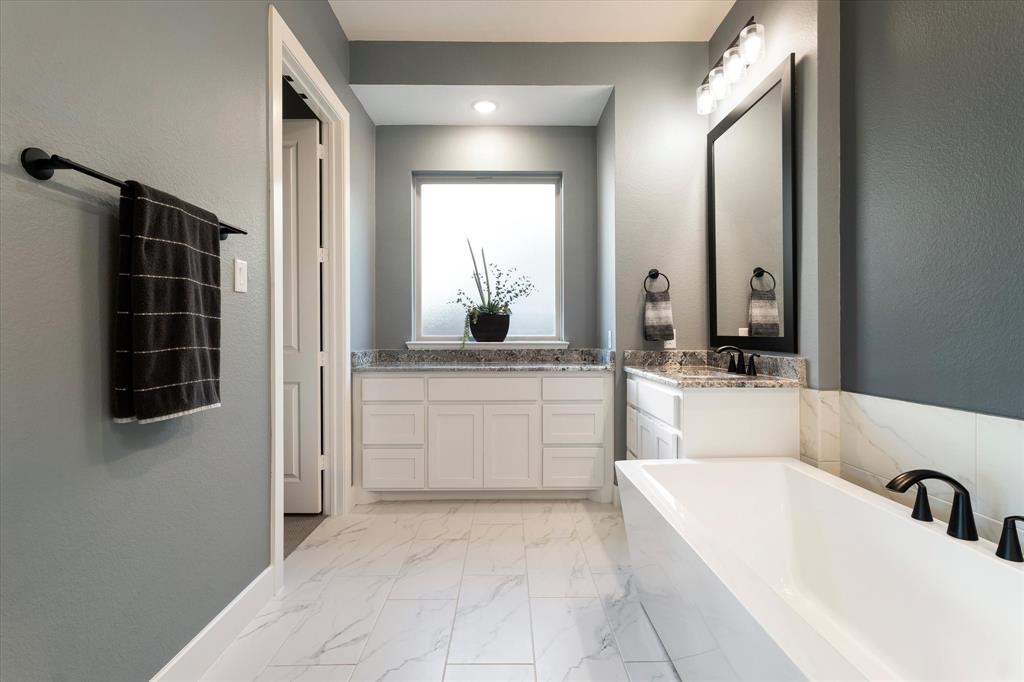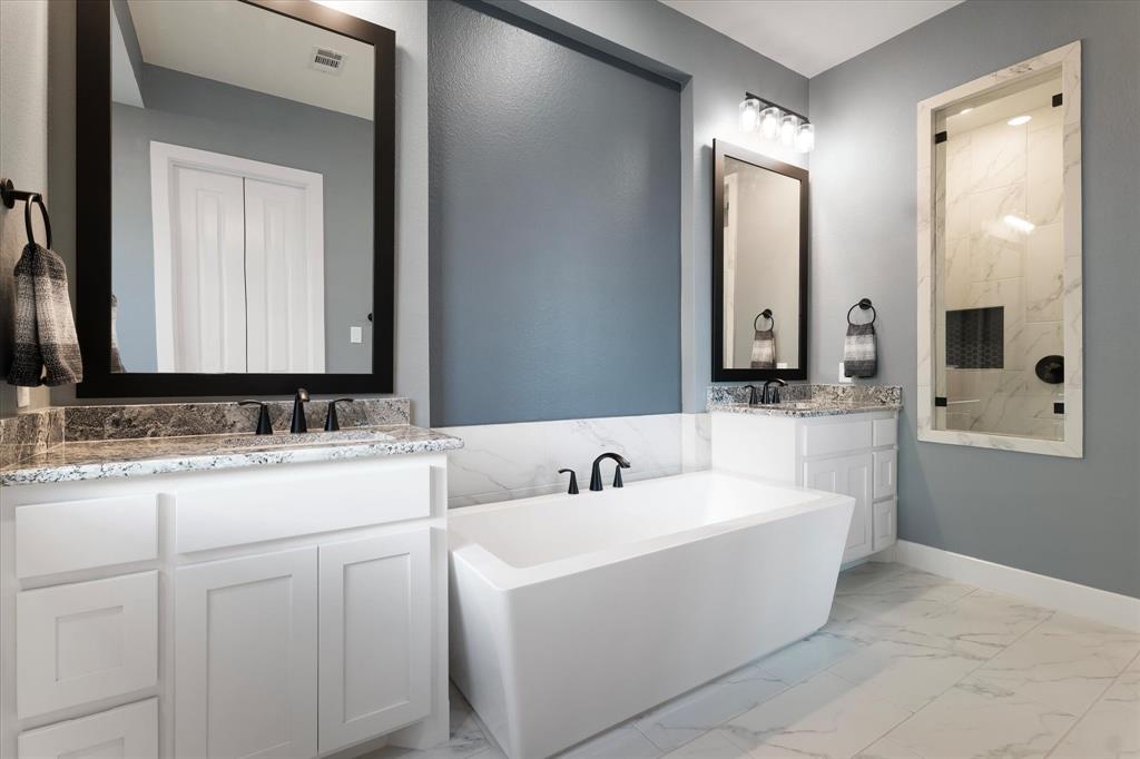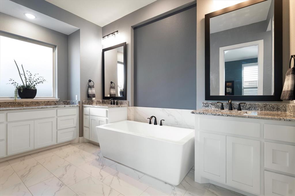 The main-floor owner's suite is a serene retreat, featuring dual sinks, a standalone soaking tub, a spacious walk-in shower, and a convenient powder nook. An additional bedroom with its own full bathroom, including a walk-in shower, is also located on the first floor, offering flexibility and privacy for guests or family. Upstairs, you'll find two more bedrooms, a full bathroom, and a versatile loft area. The home also includes a 3-car garage enhanced with durable polyurea flooring, superior to traditional epoxy. THERE'S MORE!! WASHER, DRYER AND FRIDGE WILL CONVEY WITH THE SALE OF THE HOME. Location is unbeatable with a Costco and H-E-B just up the street, you'll enjoy ultimate convenience for all your shopping needs. Sandbrock Ranch also offers a lifestyle of unparalleled community amenities, including parks, walking trails, and a resort-style pool, fitness center and private dog parks.