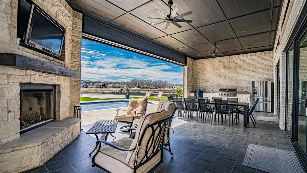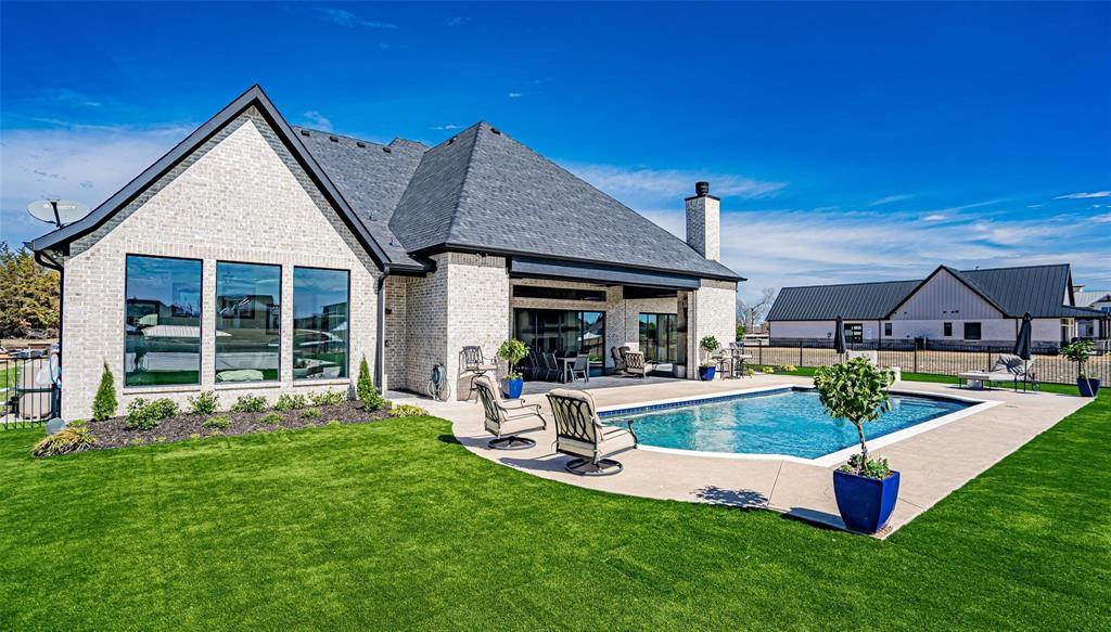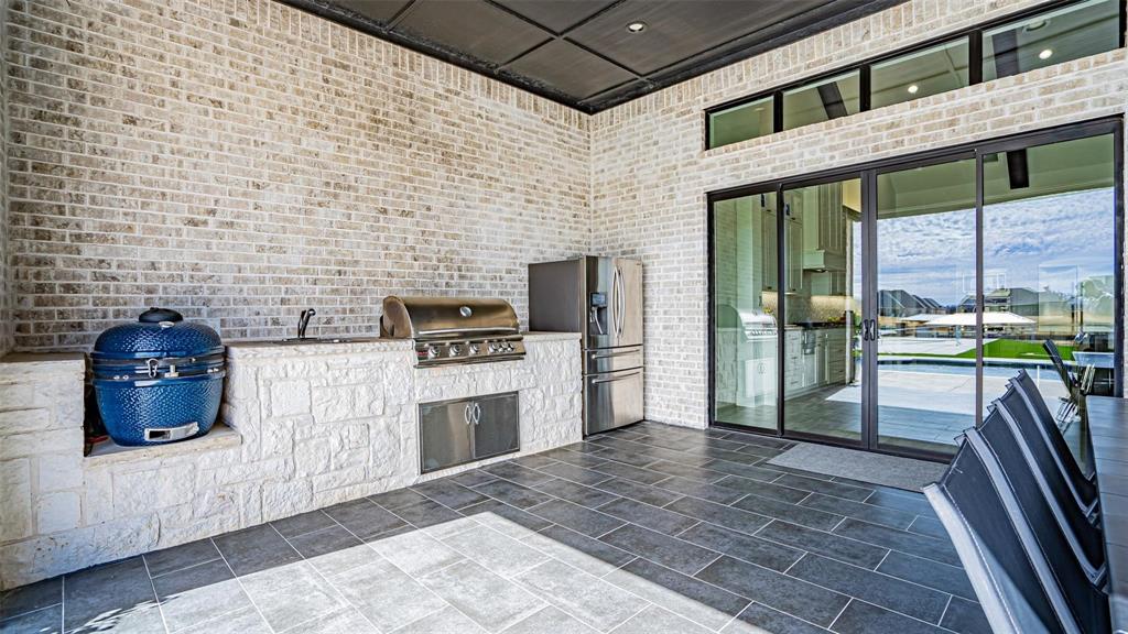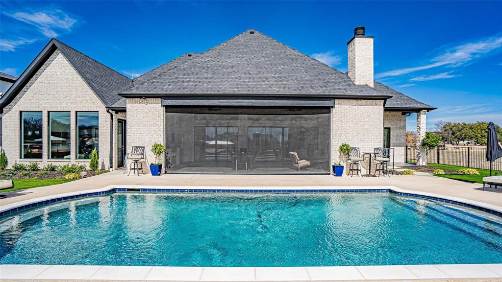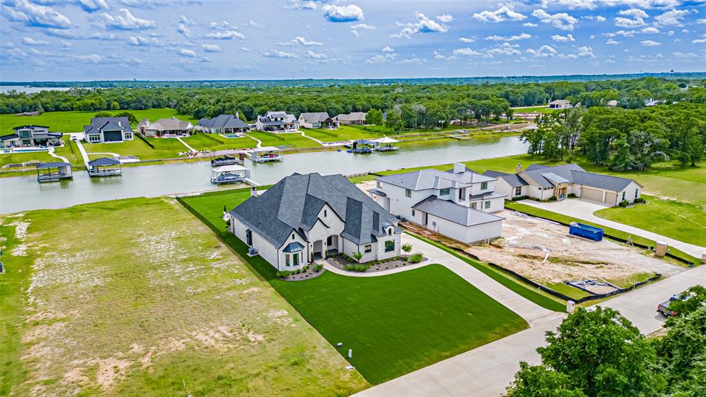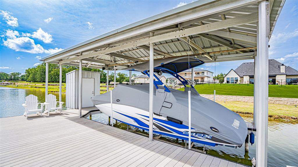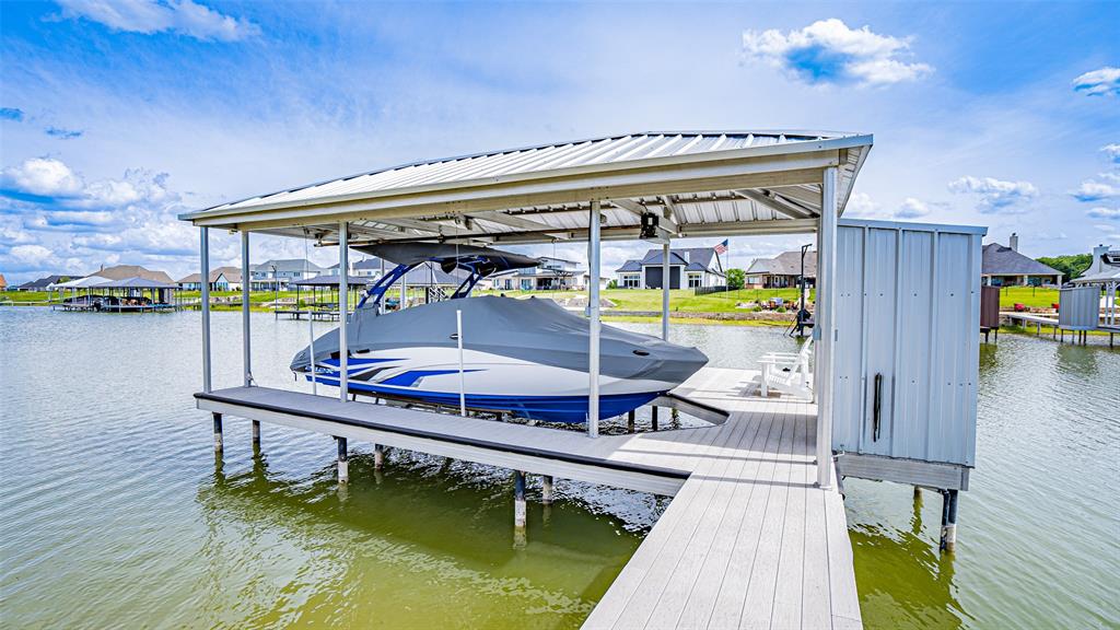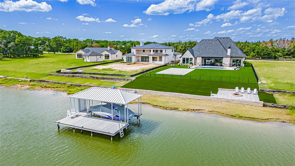 Luxury lake house in premier gated community! This beautiful home is situated on .70 acre lot fully covered in artificial turf for low maintenance living. The ultimate entertainment home with 12 to 18 foot ceilings that vault to 24 in main living, built-in fridge, commercial grade gas stove top, easy clean wood look ceramic tile floor, bunk room with built-in full over queen bunks, dry bar with wine fridge, walk in pantry with sink, coffee bar and beverage fridge, reinforced storm shelter closet, secondary bedrooms with ensuite baths, Christmas tree closet (roll in and roll out), fitness room with rubber floor, Xtra storage garage, total foam encapsulation with additional rolled insulation in primary bed, bath and closet walls, oversized garage with epoxy flooring, salt water pool, a pickle ball court, remote screens to fully enclose the back patio, outdoor kitchen living, a boat dock with lift and storage, and a fire pit by the water. Furnishings and boat optional to purchase.