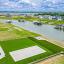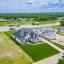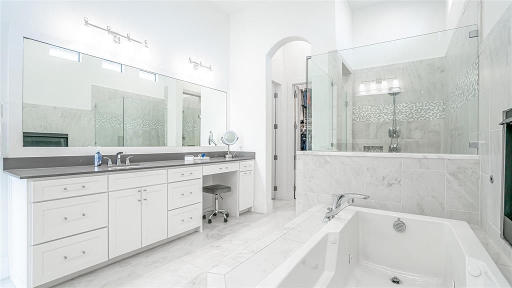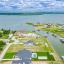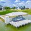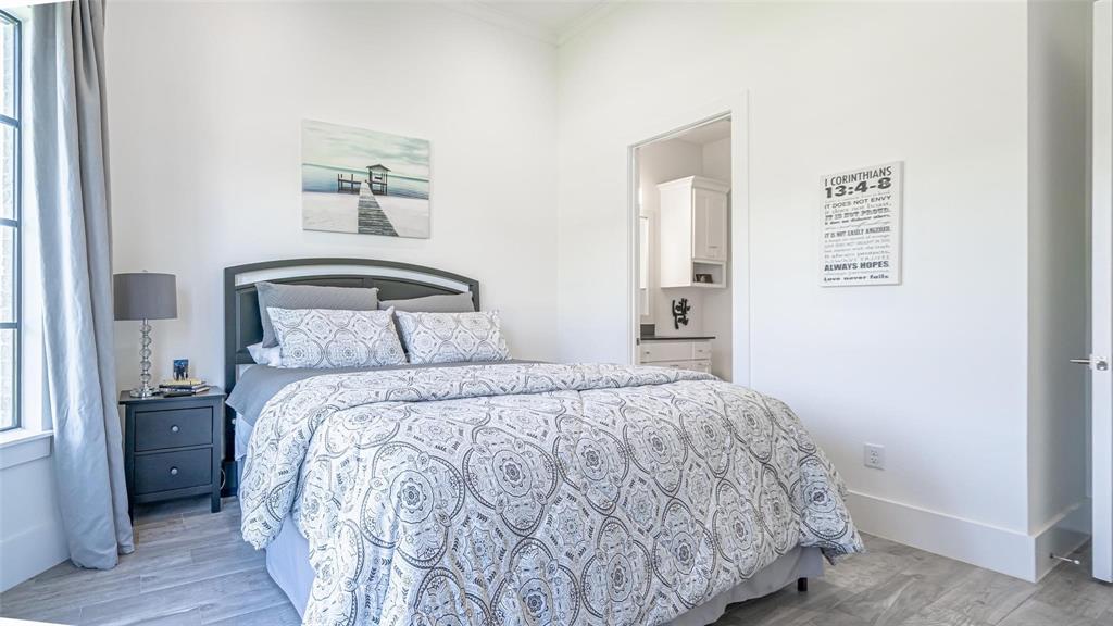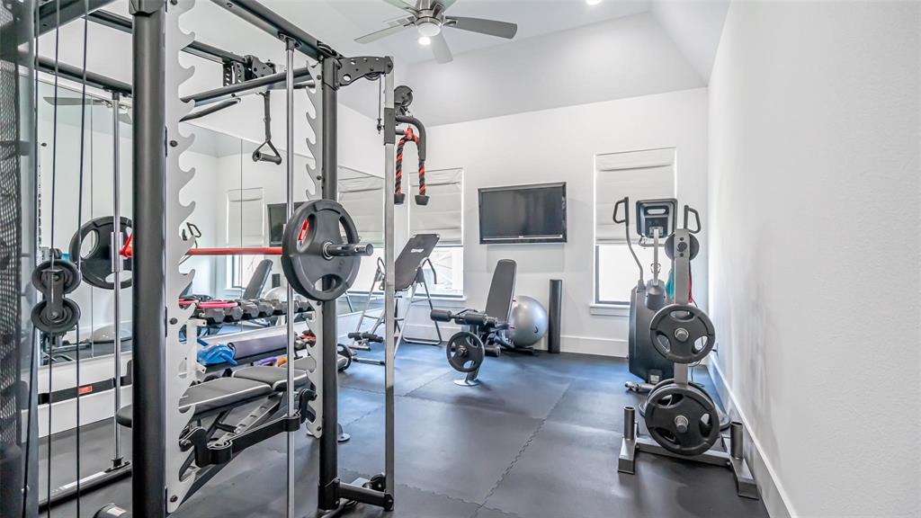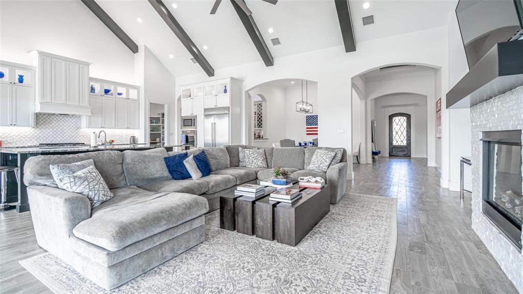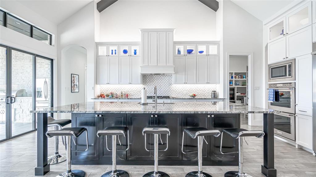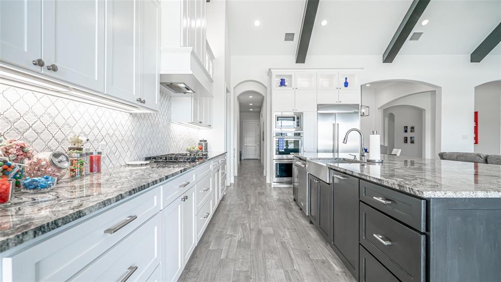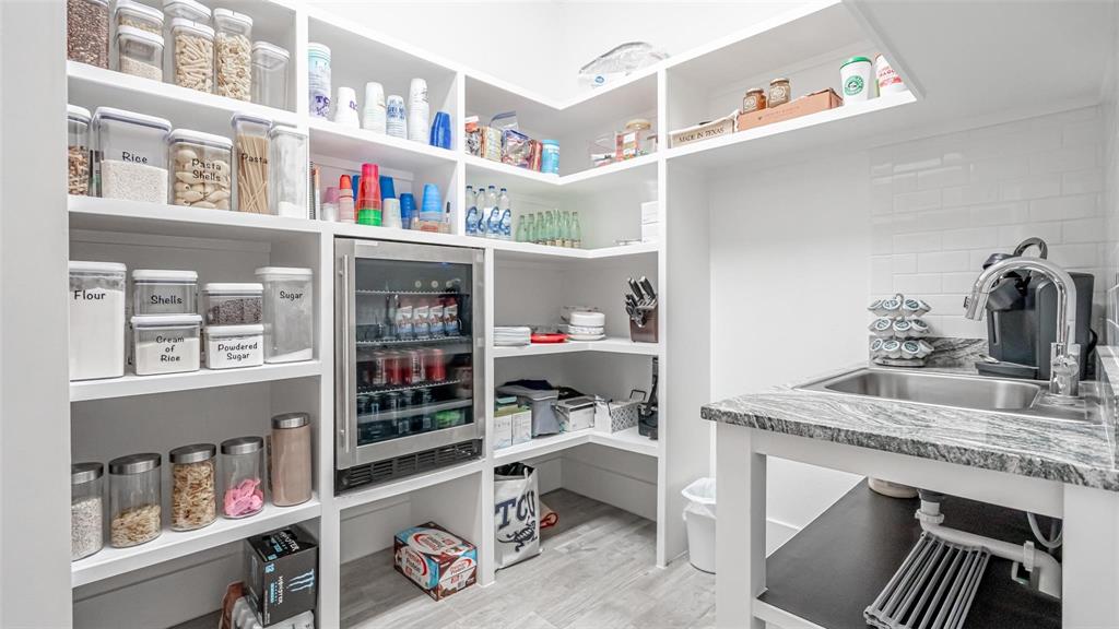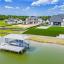 Luxury lake house in premier gated community! This beautiful home is situated on .70 acre lot fully covered in artificial turf for low maintenance living. The ultimate entertainment home with 12 to 18 foot ceilings that vault to 24 in main living, built-in fridge, commercial grade gas stove top, easy clean wood look ceramic tile floor, bunk room with built-in full over queen bunks, dry bar with wine fridge, walk in pantry with sink, coffee bar and beverage fridge, reinforced storm shelter closet, secondary bedrooms with ensuite baths, Christmas tree closet (roll in and roll out), fitness room with rubber floor, Xtra storage garage, total foam encapsulation with additional rolled insulation in primary bed, bath and closet walls, oversized garage with epoxy flooring, salt water pool, a pickle ball court, remote screens to fully enclose the back patio, outdoor kitchen living, a boat dock with lift and storage, and a fire pit by the water. Furnishings and boat optional to purchase.