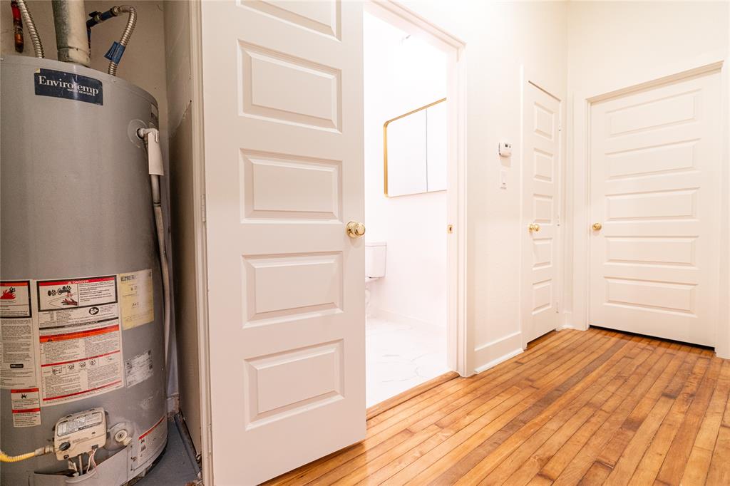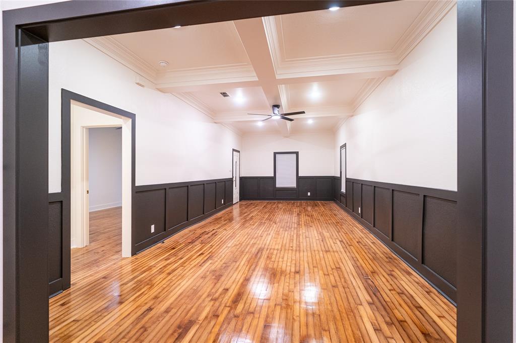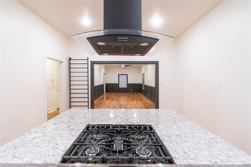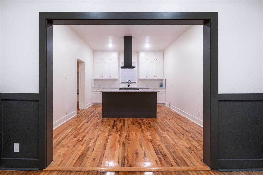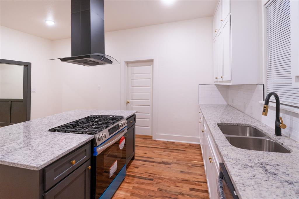Inside, the home features beautifully refinished original hardwood floors, enhancing its character and warmth. The black and white color scheme continues throughout, complemented by luxurious gold fixtures for a sophisticated touch. The spacious kitchen is a chef’s dream, complete with a large island, gas stove, and included refrigerator.