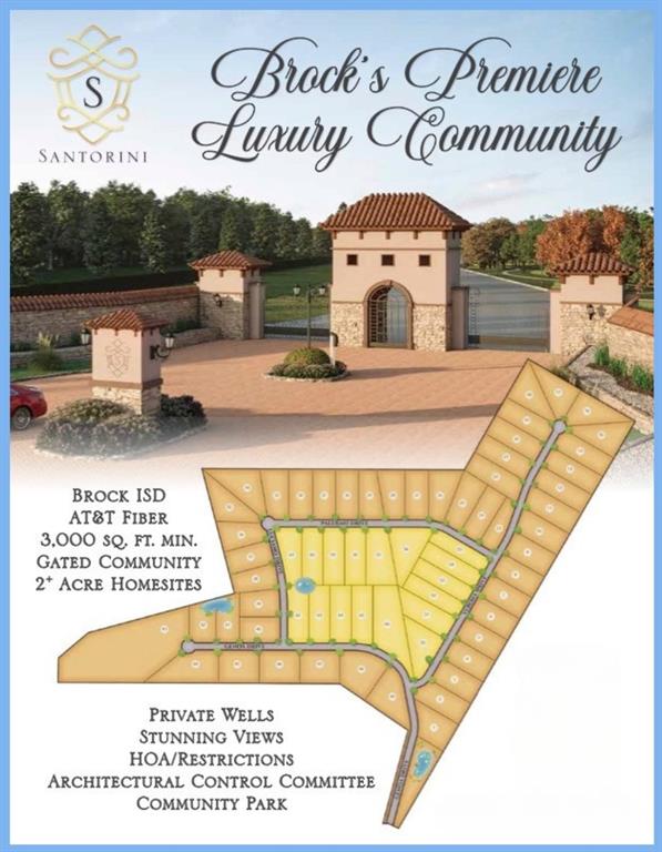 Brock ISD! The new Santorini subdivision is a beautiful and exclusive community that offers a luxurious and peaceful lifestyle. This lot is full of mature oak trees boasting an impressive 2 acre lot size offering ample space to build your custom dream home. In addition, the community is located just minutes to I-20 and Brocks top rated public schools. All concrete streets, private water wells, AT&T high speed fiber internet, and a Greece inspirited entrance that will take your breath away.