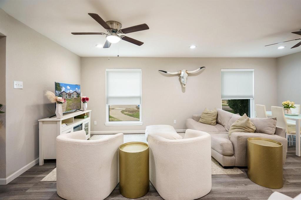 MOTIVATED SELLER!! Welcome to this beautifully updated single-story home, centrally located in a sought-after neighborhood near the private school corridor with easy access to shopping, dining, and top-rated schools. Featuring four spacious bedrooms, two and a half baths, and three versatile living areas, this home offers both comfort and style with thoughtful updates throughout. The home features neutral tones, creating a warm and welcoming ambiance. Vaulted ceilings in the main living area add a sense of grandeur, while new flooring ('22) enhances the home's fresh and contemporary appeal. The gourmet kitchen was recently remodeled with stainless steel appliances, quartz countertops, a stylish subway tile backsplash, and an oversized island which is perfect for both everyday cooking and entertaining. Additional features include a water line to the refrigerator, built-in oven and microwave, ample pantry storage, and undermounted sink—all designed for both function and style. The home offers three flexible living areas, one of which could easily be used as a formal dining space to suit your lifestyle. The main living room boasts a gorgeous, freshly painted fireplace with a gas starter, ideal for cozy evenings. Built-in storage cabinets provide additional convenience and organization. The primary bedroom is a true retreat, offering a spacious walk-in closet, private ensuite bath, and direct access to the backyard. The ensuite bath has been updated with quartz countertops, modern square sinks, sleek stainless steel fixtures, and stylish subway tile in the secondary bath, creating a spa-like feel. The oversized yard is an entertainer's dream, with ample space to create your dream backyard! Other updates include - New Window Treatments (2022) New windows (2022) Full rewiring (2022), Interior & exterior paint (2022) Updated ceiling fans (2022) New back doors (2022) Don’t miss out on this beautifully updated, move-in-ready home!