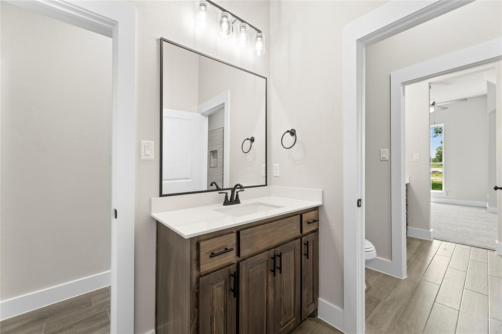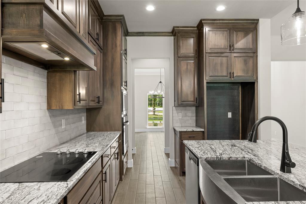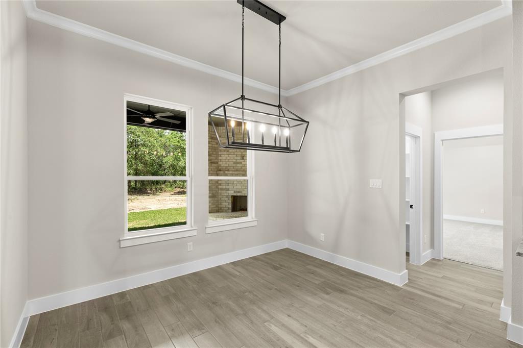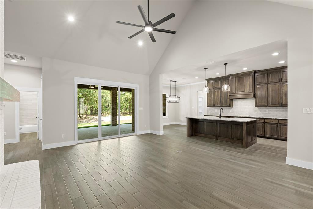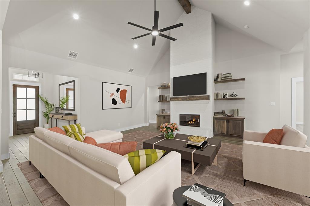 MLS# 20841408 - Built by Brookson Builders - Ready Now! ~ Move-In Ready! Newly constructed, 2977 sqft, 4-bedroom, 3-bathroom Single Family Residence in the sought-after Arbor Hills subdivision offers a blend of comfort and style. With a traditional - farmhouse housing style, the home features a spacious open floor plan, decorative lighting, and vaulted ceilings. The kitchen is a cook's dream with a convenient island and walk-in pantry. The home boasts a living room, game room, and a dining room, perfect for entertaining. Relax by one of the two brick fireplaces, located in the family room and outside for cozy gatherings. Additional features include a 3-car garage, wood look tile flooring, and a vaulted cabinets to the ceiling. The exterior offers a covered patio and rain gutters. The home is situated within Peaster ISD.