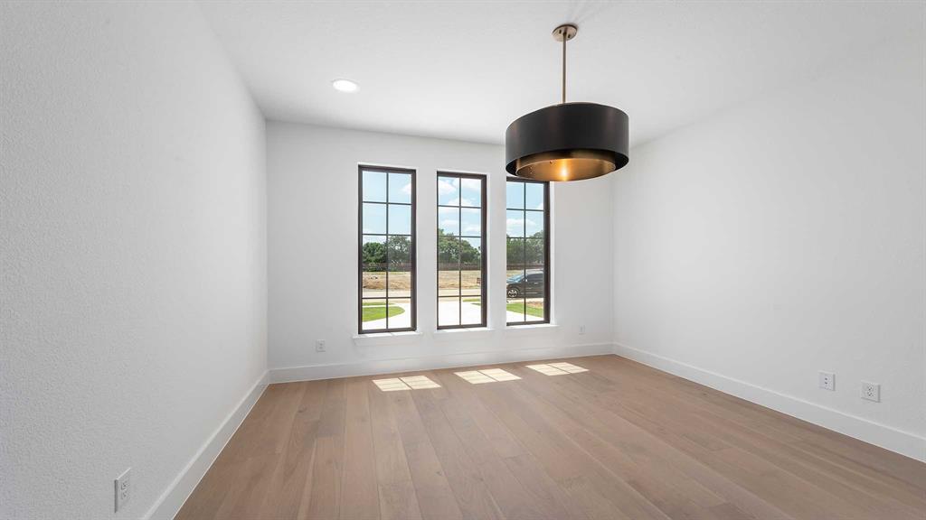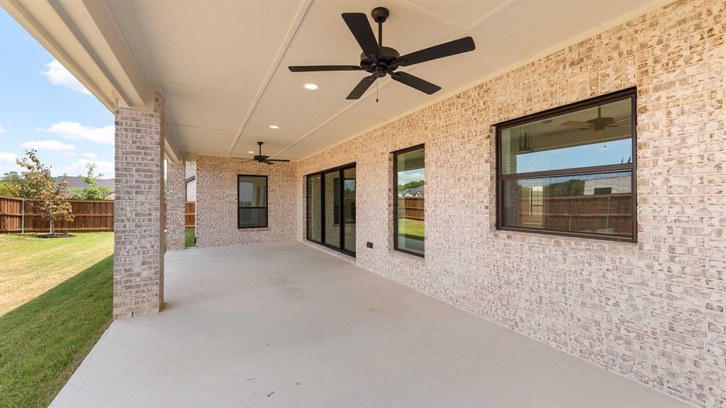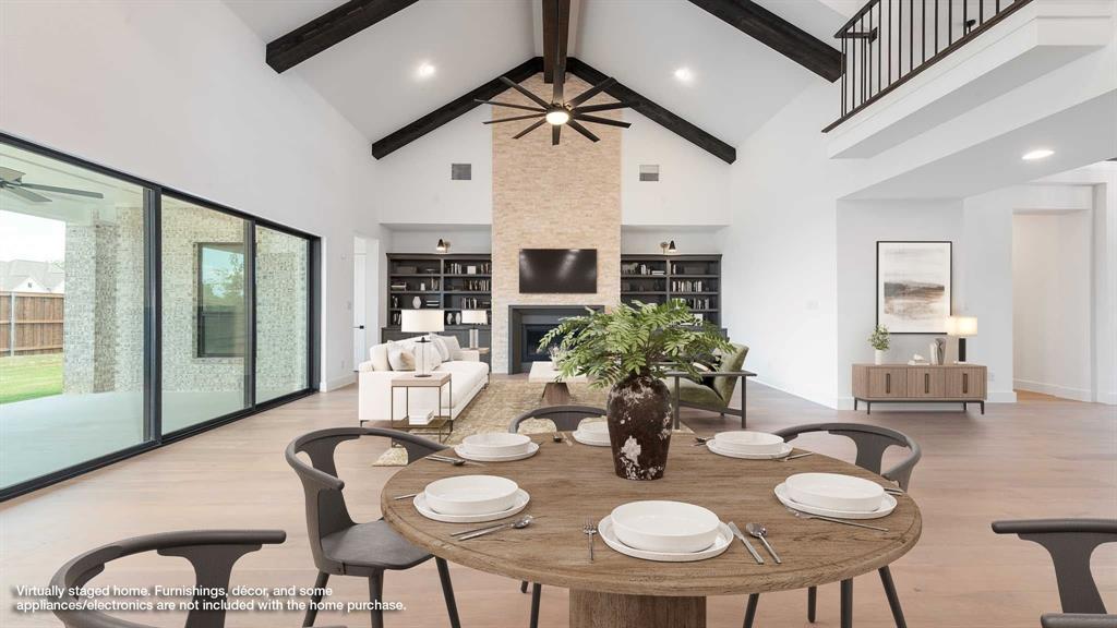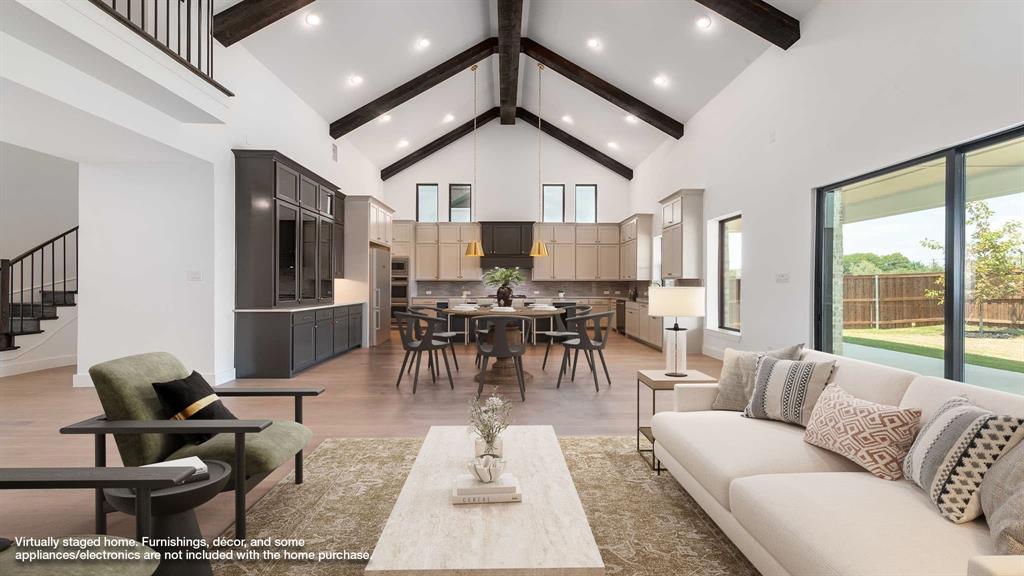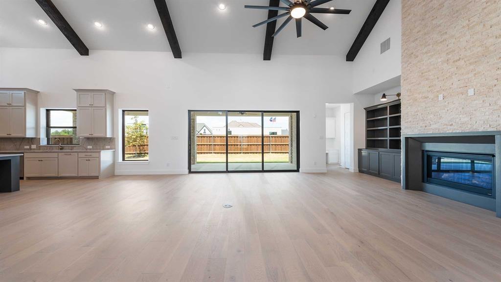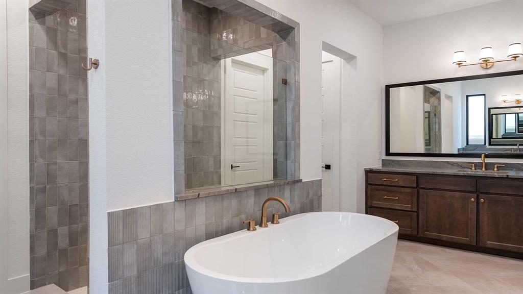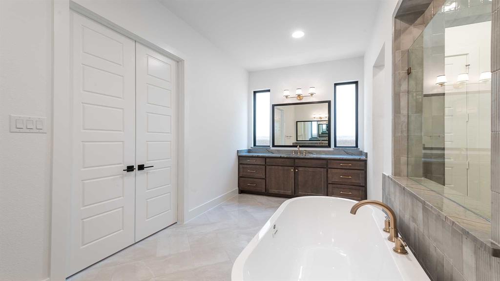 Two-story entry. Home office with French doors. Formal dining room. Family room features a cast stone fireplace, decorative beamed ceiling and a sliding glass door. Kitchen has an island with built-in seating space and a large walk-in pantry. Guest suite located on the first floor. Private primary suite features a wall of windows. Primary bath with dual vanities, freestanding tub, separate glass-enclosed shower and two walk-in closets. Secondary bedrooms, media room and game room complete the second floor. Extended covered backyard patio. Three-car split garage.