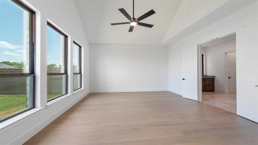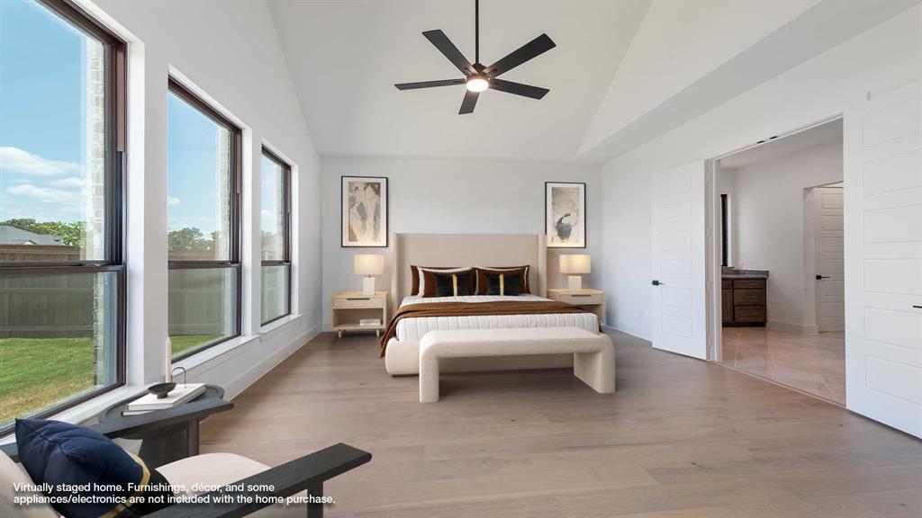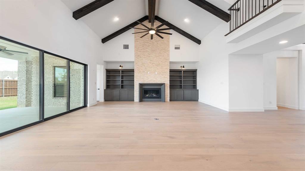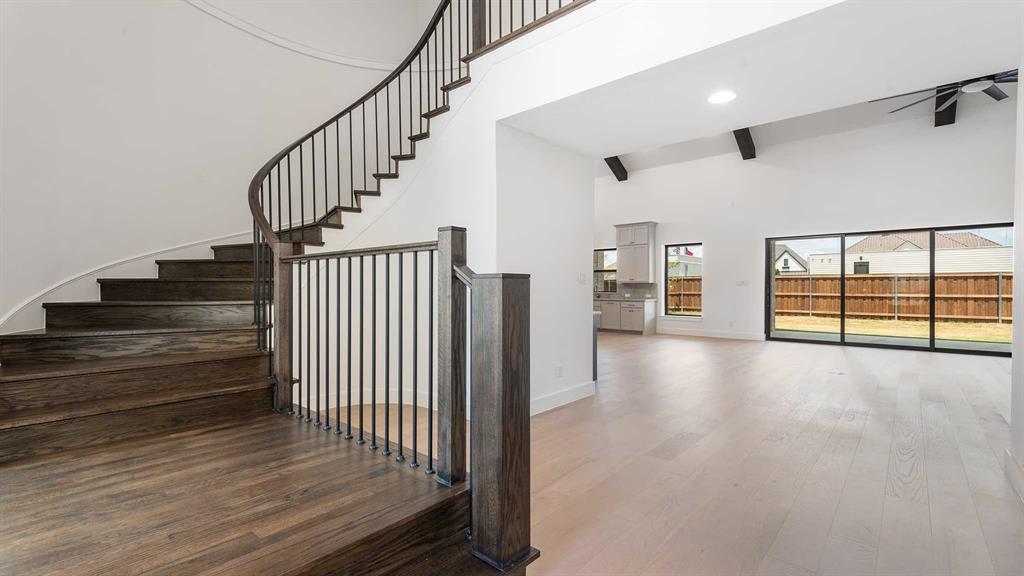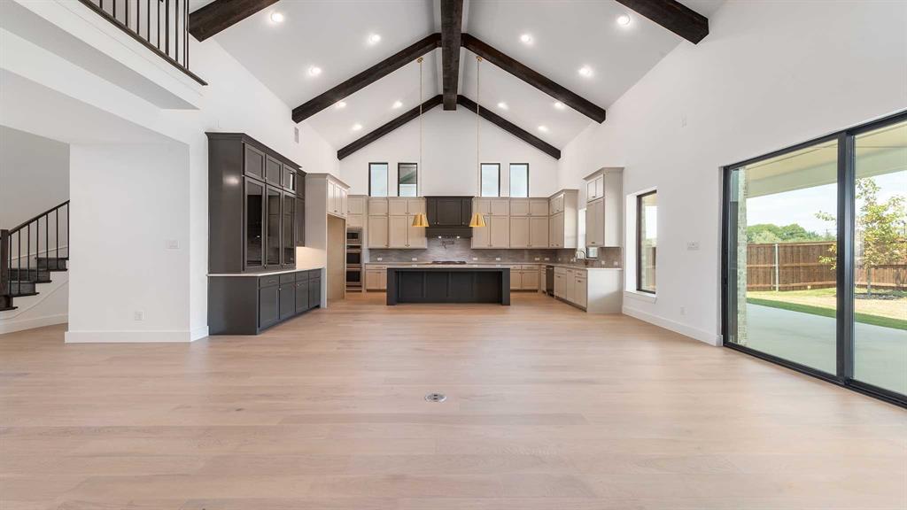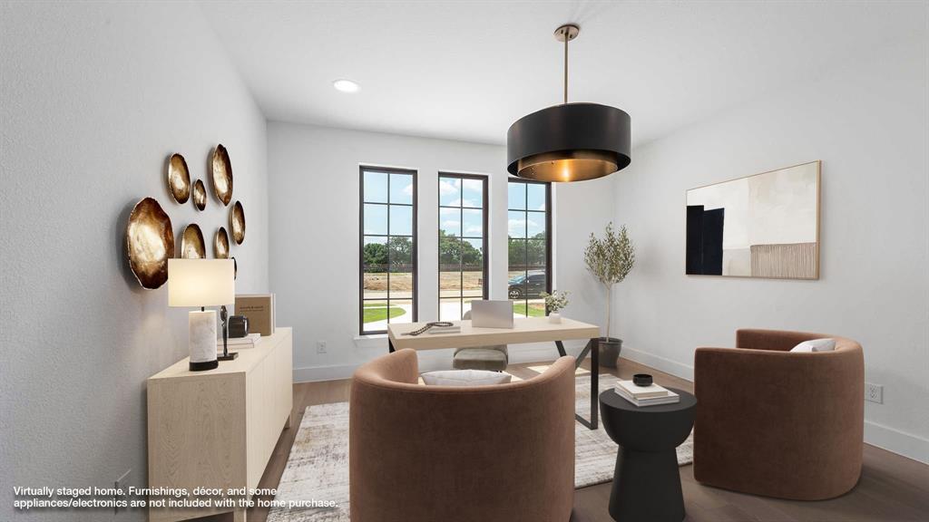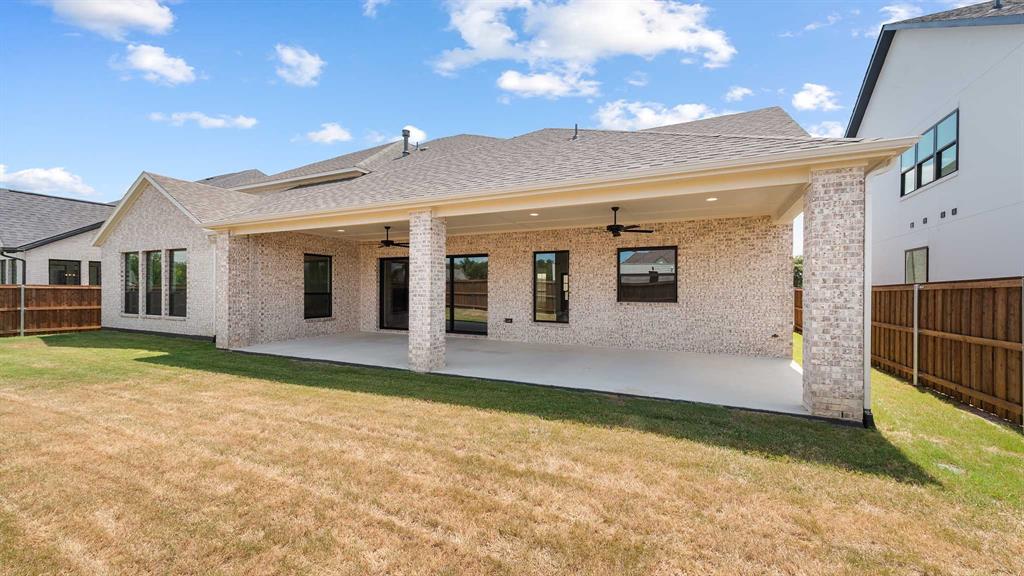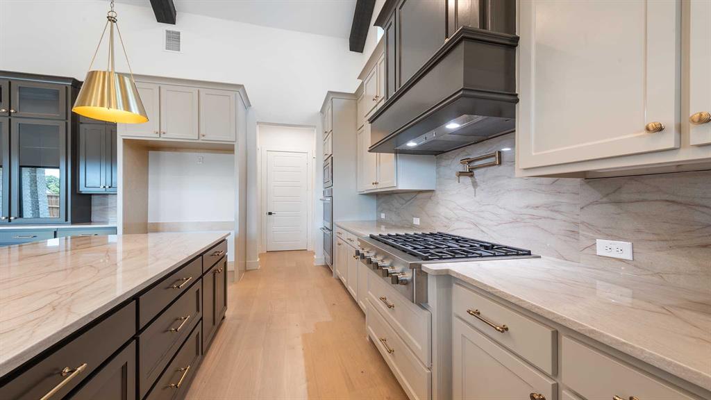 Two-story entry. Home office with French doors. Formal dining room. Family room features a cast stone fireplace, decorative beamed ceiling and a sliding glass door. Kitchen has an island with built-in seating space and a large walk-in pantry. Guest suite located on the first floor. Private primary suite features a wall of windows. Primary bath with dual vanities, freestanding tub, separate glass-enclosed shower and two walk-in closets. Secondary bedrooms, media room and game room complete the second floor. Extended covered backyard patio. Three-car split garage.