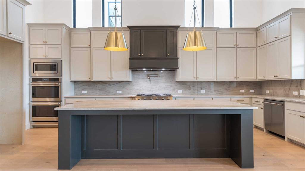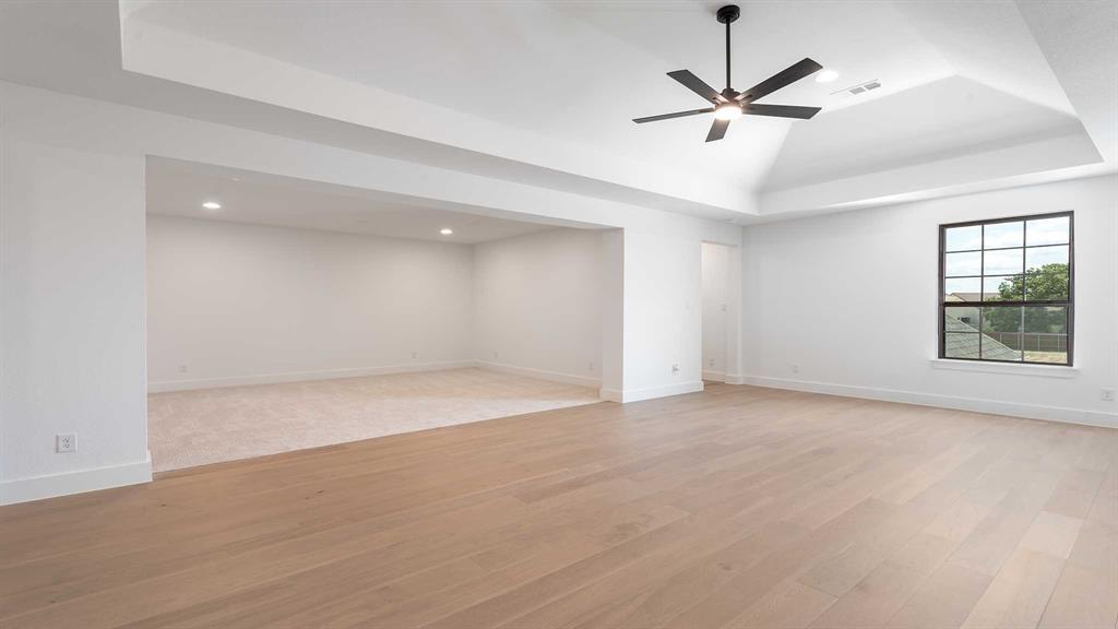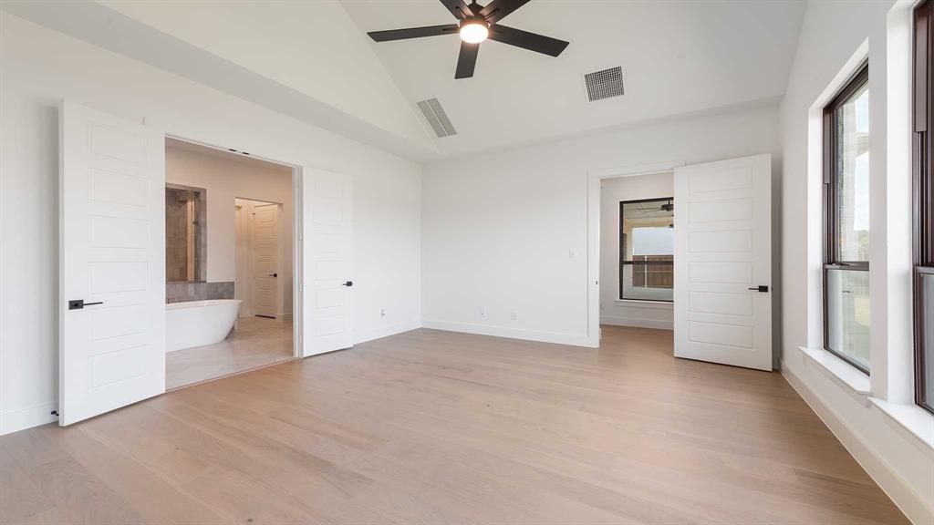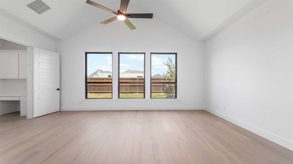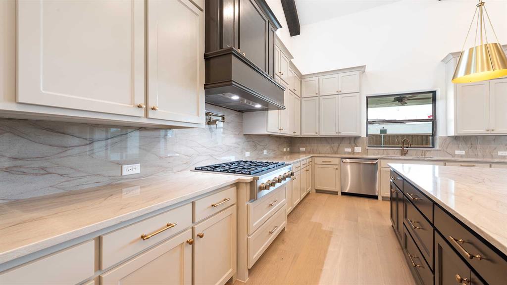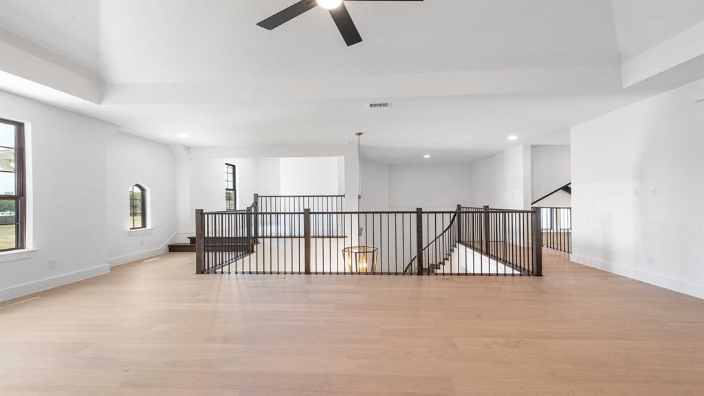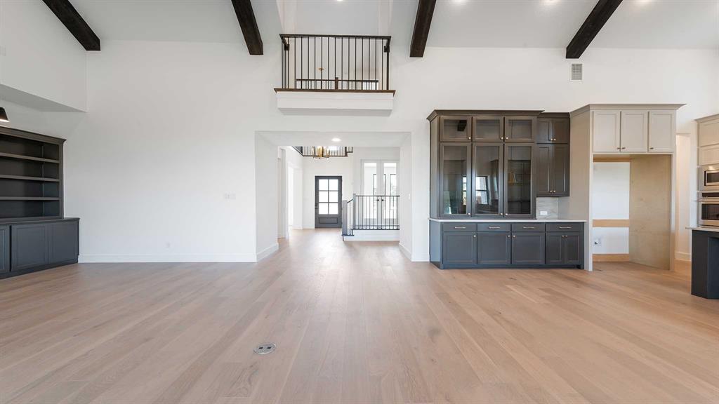 Two-story entry. Home office with French doors. Formal dining room. Family room features a cast stone fireplace, decorative beamed ceiling and a sliding glass door. Kitchen has an island with built-in seating space and a large walk-in pantry. Guest suite located on the first floor. Private primary suite features a wall of windows. Primary bath with dual vanities, freestanding tub, separate glass-enclosed shower and two walk-in closets. Secondary bedrooms, media room and game room complete the second floor. Extended covered backyard patio. Three-car split garage.