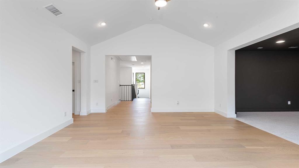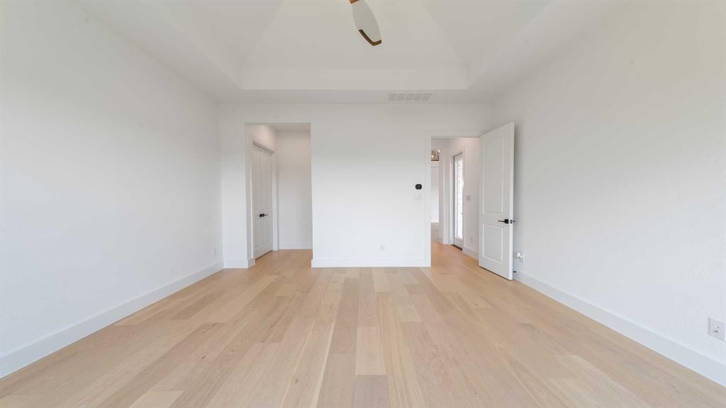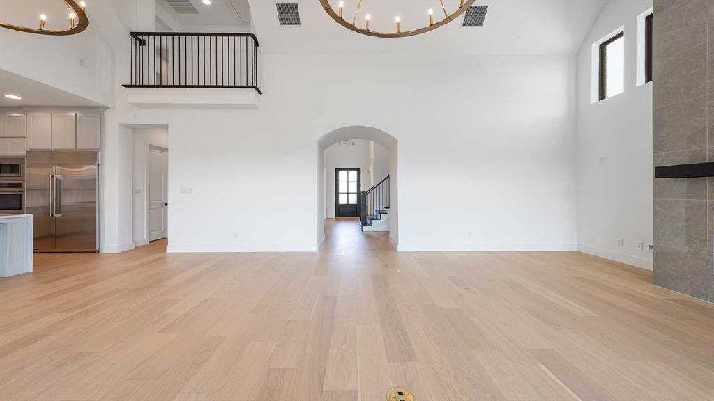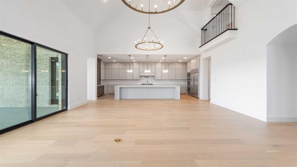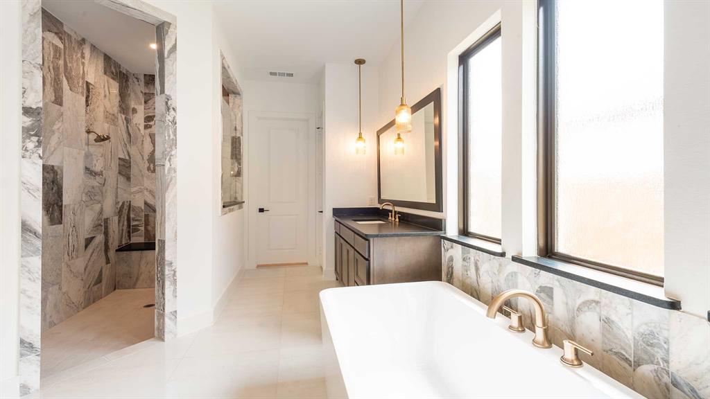 Two-story entry with 20-foot ceiling. Home office with French doors set at entry. Two-story family room and dining area with a sliding glass door. Kitchen has an island with built-in seating space and a spacious walk-in pantry. Primary suite with a wall of windows. Primary bath has a double door entry, dual vanities, a freestanding tub, a separate glass-enclosed shower and two walk-in closets. A guest suite with private bathroom just off the front entry. Second floor hosts a large game room, a media room with an additional storage space, and secondary bedrooms including a guest suite with a full bathroom and walk-in closet. Extended covered backyard patio with an outdoor grill. Three-car garage with additional storage space.