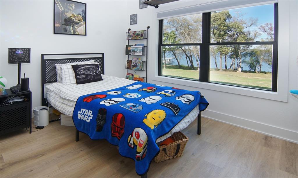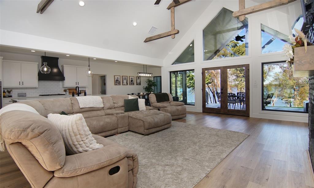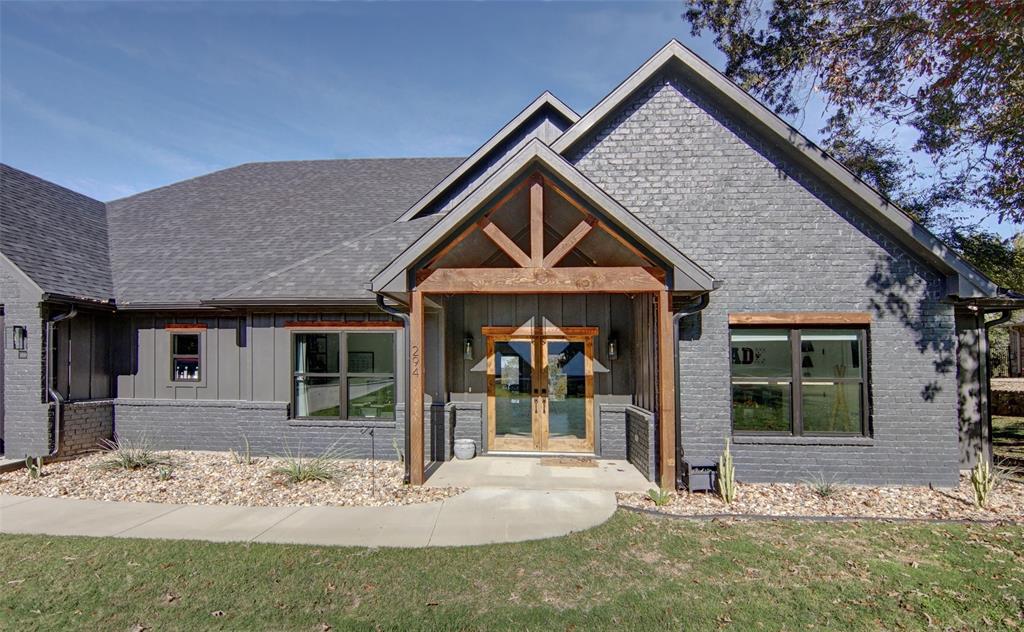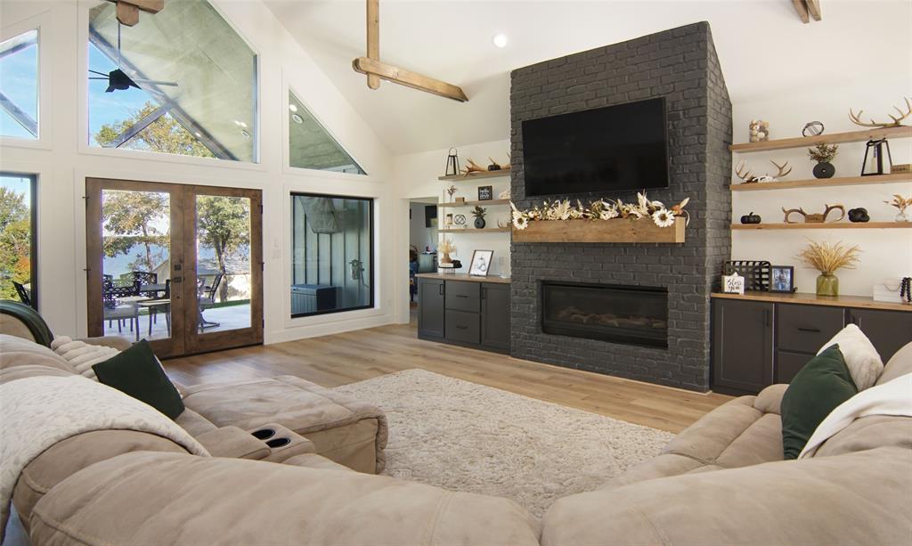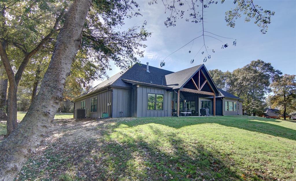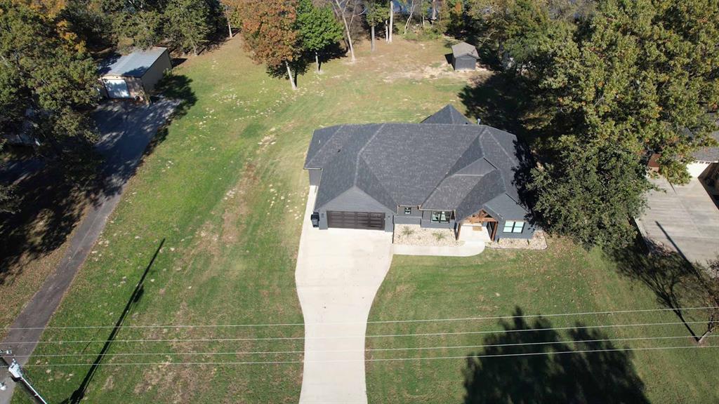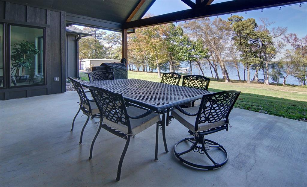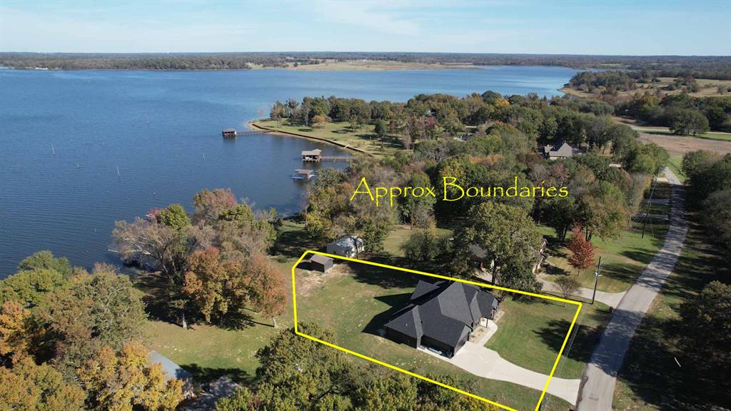 Experience unparalleled lakefront living in this breathtaking custom-built home, completed in 2022, offering unrestricted water views on the renowned Lake Fork. This prime location boasts exceptional water depth, though this home currently features a50-foot pier and retaining wall, you have the freedom to design and build your own boathouse to fit your vision. Step through the elegant double doors into a grand living room with vaulted ceilings, accentuated by wooden beams and a wall of windows that frame the serene lake views. A gas fireplace, flanked by custom wood shelving and storage cabinets, serves as the focal point of this inviting space. The open-concept design connects to the gourmet kitchen, featuring a large island, and an impressive walk-in pantry with wood countertops, perfect for storing and using appliances while keeping countertops clutter-free. A large dining space off the kitchen and living area makes entertaining effortless, while the expansive covered patio provides the perfect setting to make memories with friends! The luxurious master suite is a private retreat, offering breathtaking lake views from both the bedroom and ensuite bath. The spa-like master bath boasts a soaking tub, custom tile shower, and a spacious walk-in closet that conveniently connects to the utility room for effortless organization. This thoughtfully designed home also includes four additional spacious bedrooms, all beautifully styled and large enough to accommodate various furniture arrangements. A dedicated office space at the front of the home provides a quiet area for work or study. The exterior is a perfect blend of painted brick, Hardie siding, and cedar accents, creating timeless curb appeal. Additionally, a 12x16 storage building in the backyard offers ample space for lawn equipment and lake gear. Imagine waking up to panoramic lake views and spending evenings enjoying the tranquil water from your own backyard. This home is truly a dream come true!