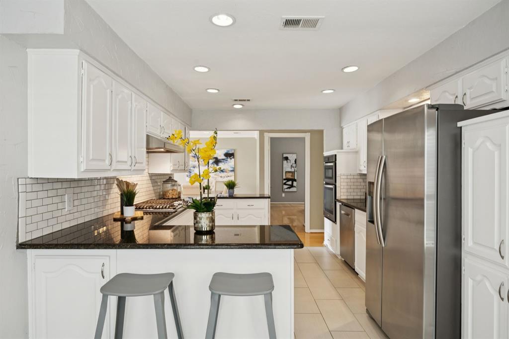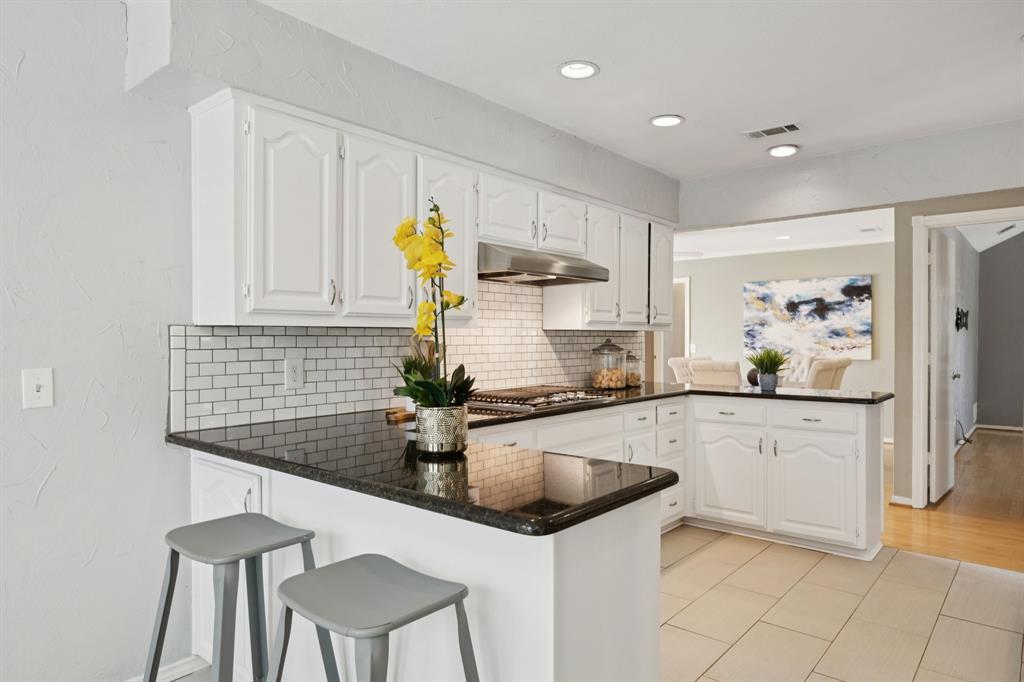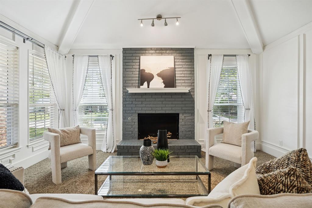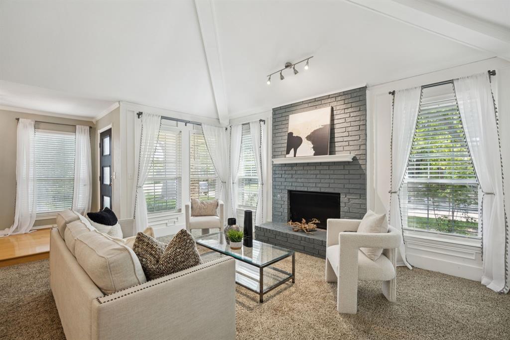 Inside, a bright and flexible floor plan offers multiple living and dining spaces, perfect for entertaining or cozy nights in. The main living room features a brick fireplace, vaulted ceilings, and built-ins, while the den off the kitchen can double as a formal dining room, playroom, or home office. The kitchen boasts granite counters, a gas cooktop, and a breakfast bar that opens to the sunny breakfast nook.