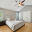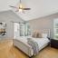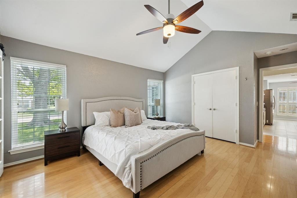 The private primary suite offers dual closets and an updated bath with a large walk-in shower. Three additional bedrooms share a separate hallway for privacy, along with a full bath. Wood floors, neutral colors, and generous natural light give the home a warm, inviting feel.
