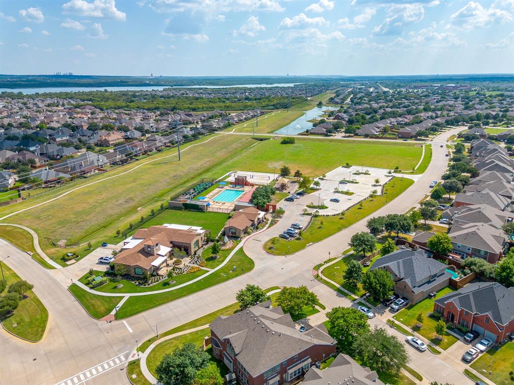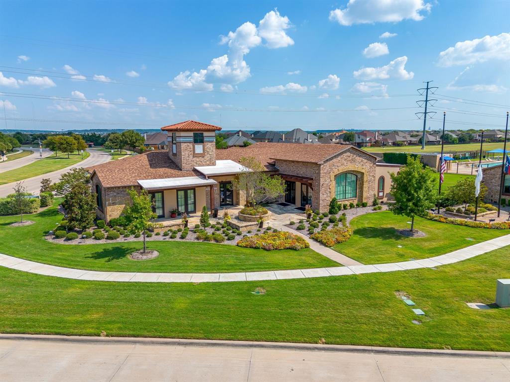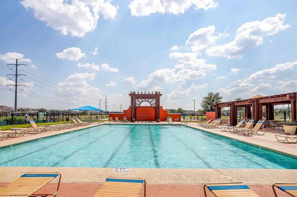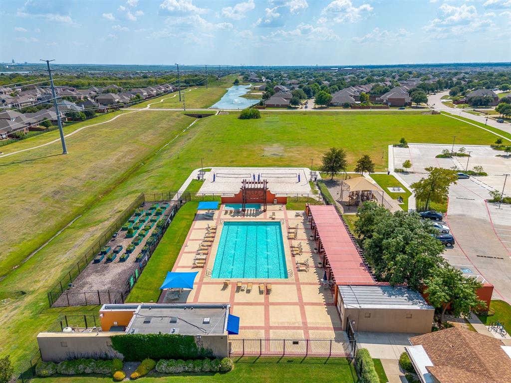 Residents of The Village of Mira Lagos enjoy access to premium amenities including a community swimming pool, fitness center, multiple playgrounds, walking trails, volleyball courts, soccer fields, and a clubhouse with a full kitchen and bar area.