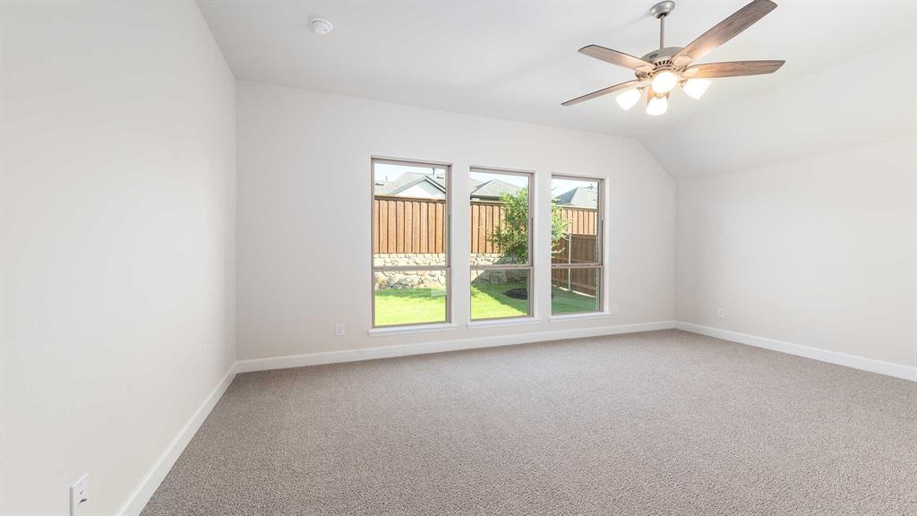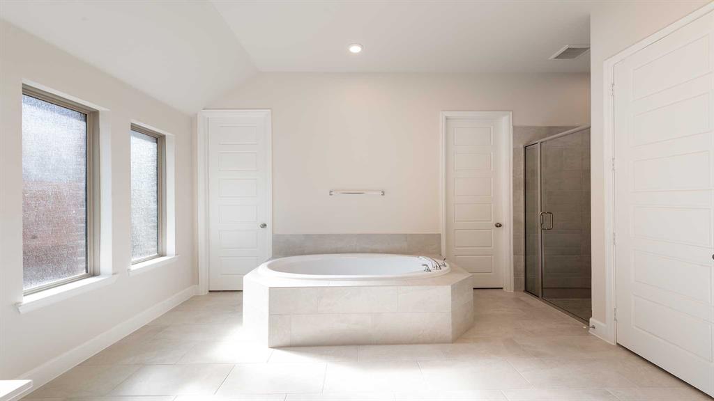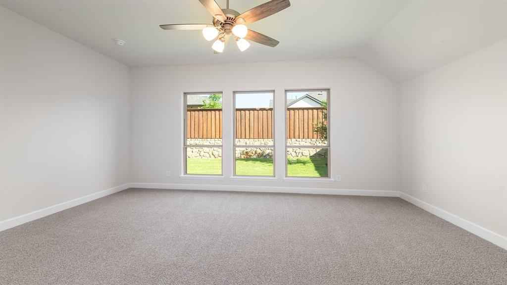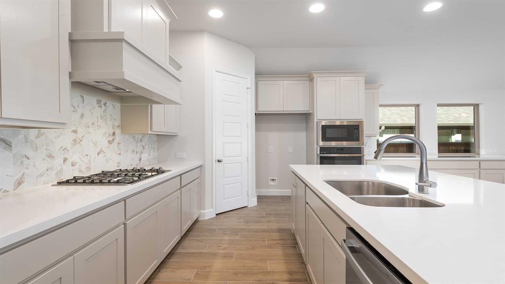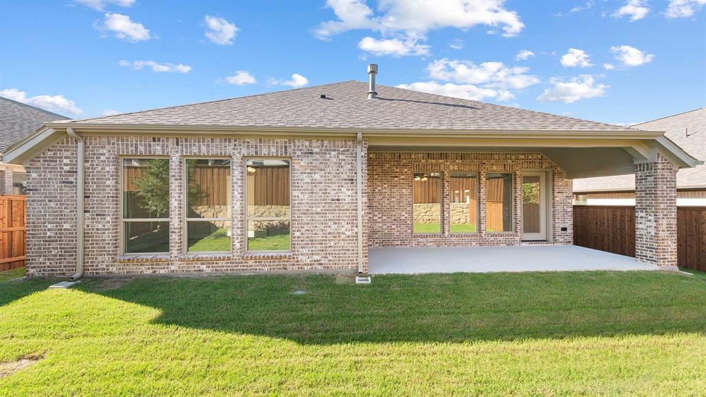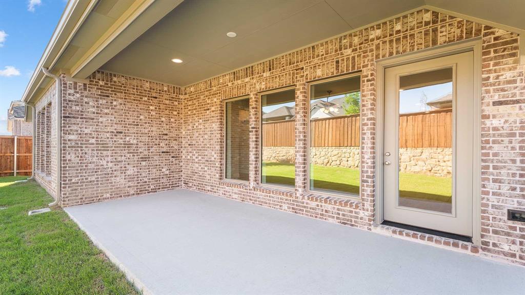 Home office with French doors set at entry with 12-foot ceiling. Extended entry leads to open kitchen, dining area and family room. Kitchen features corner walk-in pantry, generous counter space and island with built-in seating space. Dining area flows into family room with a wood mantel fireplace and wall of windows. Primary suite includes double-door entry to primary bath with dual vanities, garden tub, separate glass-enclosed shower and two large walk-in closets. A guest suite with private bath adds to this spacious one-story home. Covered backyard patio. Mud room off two-car garage.