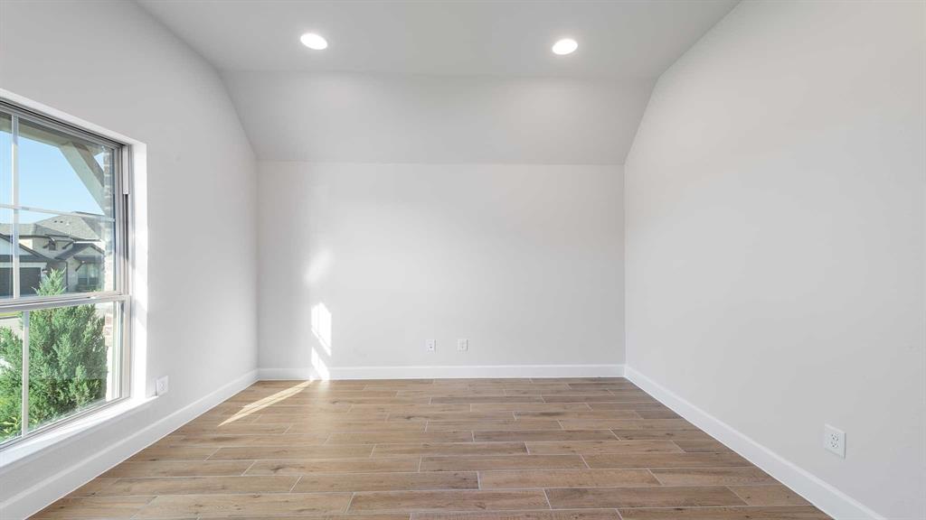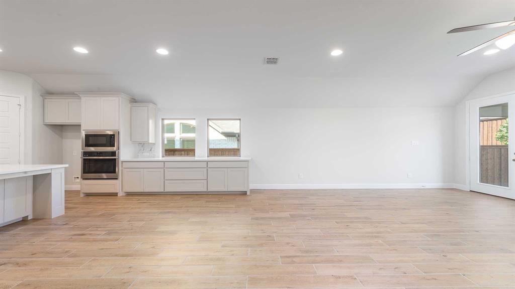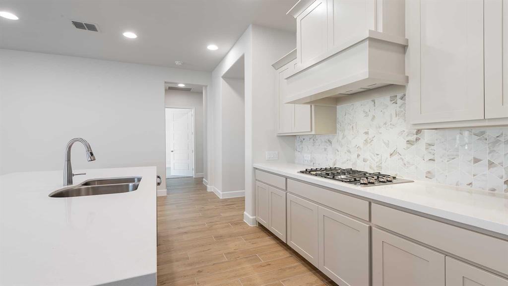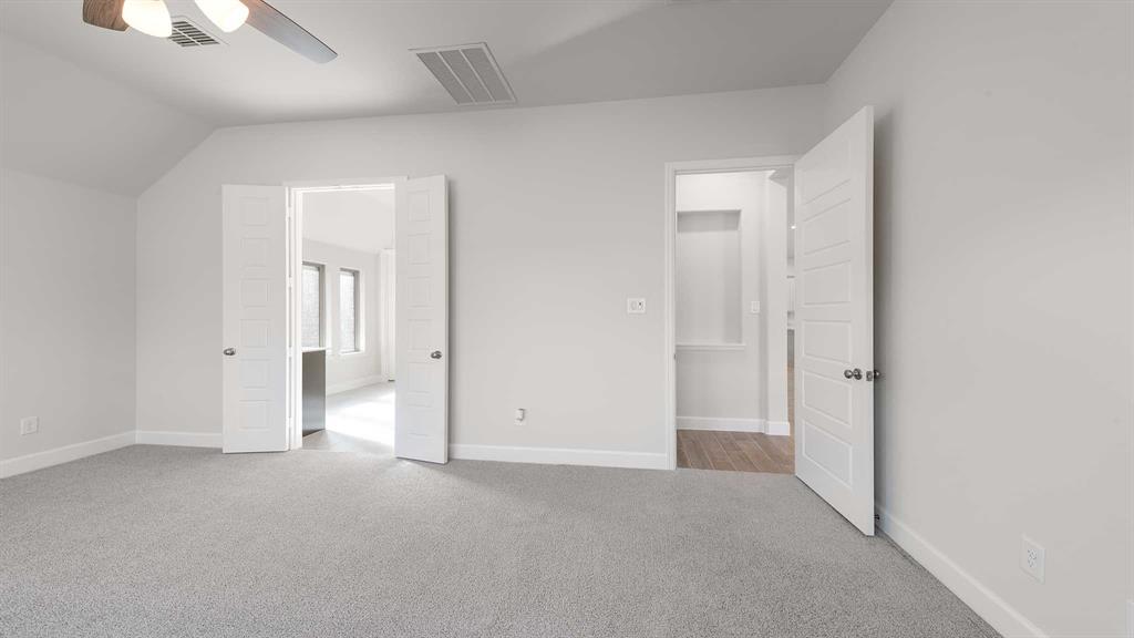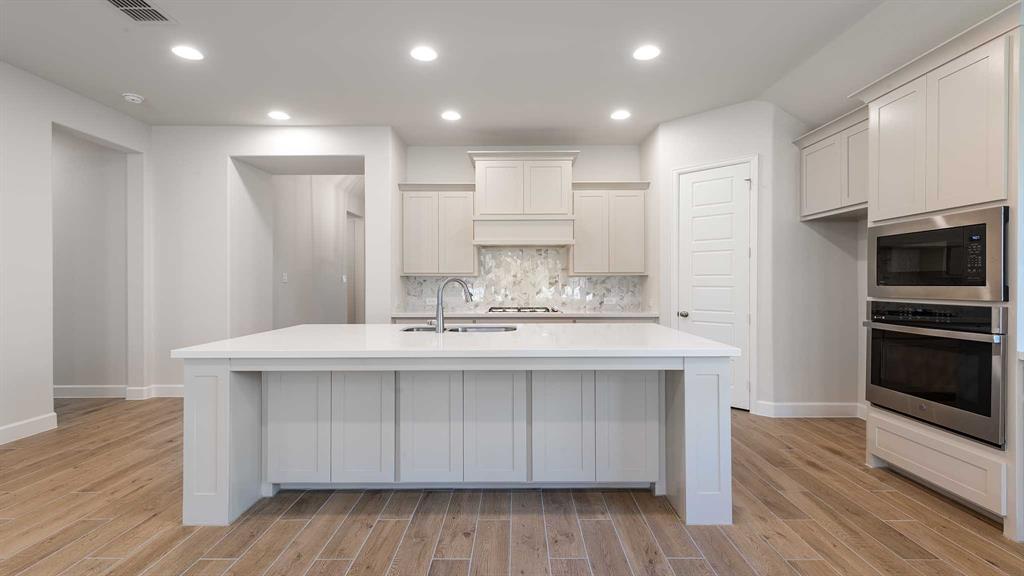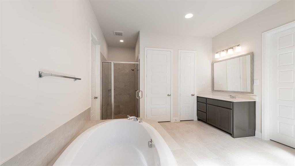 Home office with French doors set at entry with 12-foot ceiling. Extended entry leads to open kitchen, dining area and family room. Kitchen features corner walk-in pantry, generous counter space and island with built-in seating space. Dining area flows into family room with a wood mantel fireplace and wall of windows. Primary suite includes double-door entry to primary bath with dual vanities, garden tub, separate glass-enclosed shower and two large walk-in closets. A guest suite with private bath adds to this spacious one-story home. Covered backyard patio. Mud room off two-car garage.