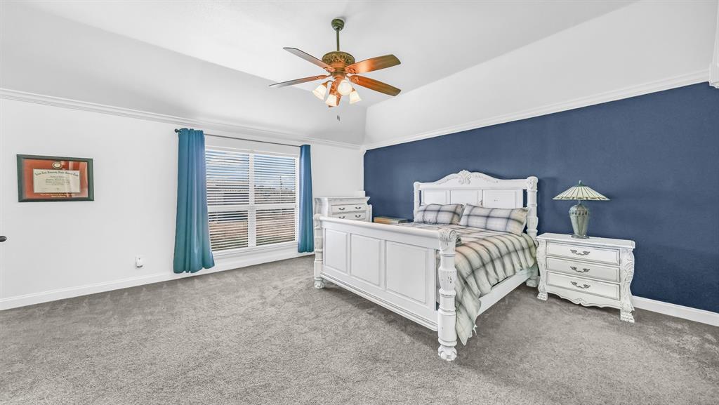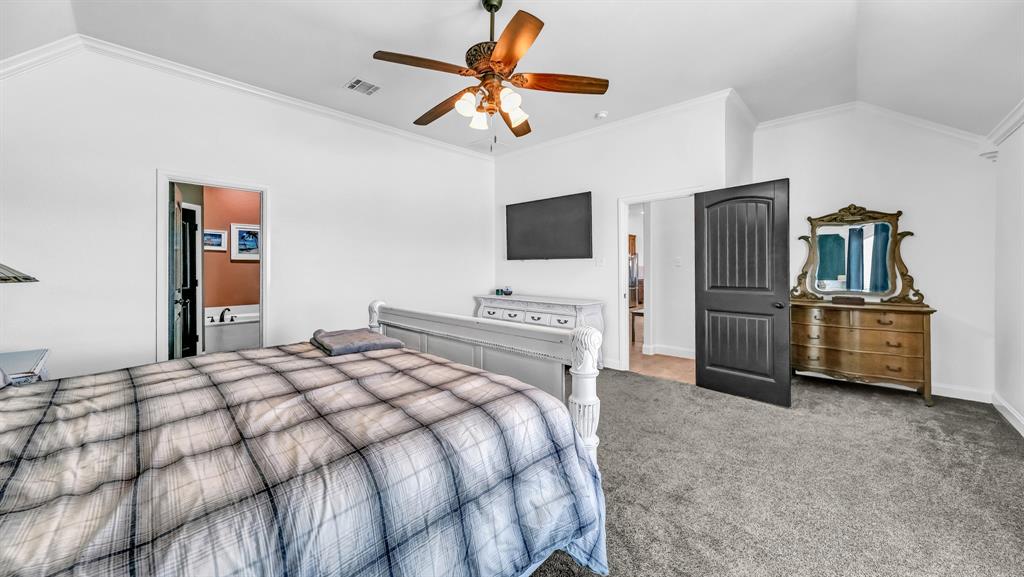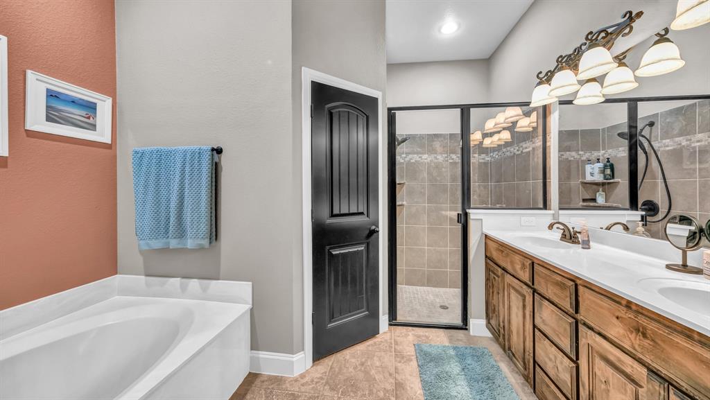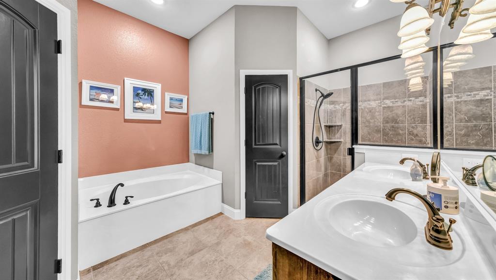 Your primary split-bedrooms suite is generously sized to accommodate full bedroom suits, in-room nursery, work out or drop-in office. A dedicated bath features separate closets, double sinks, soaking garden tub, & black framed walk-in shower. With 3 additional dedicated bedrooms, 1 or more easily function as an at-home office space or play room.