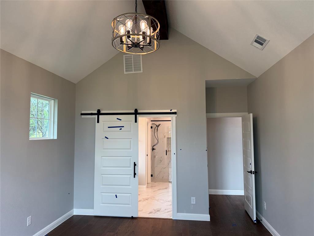 The master suite boasts a stylish barn door leading to en-suite bathroom equipped with dual sinks, a separate shower, & a soaking tub perfect for unwinding after a long day.