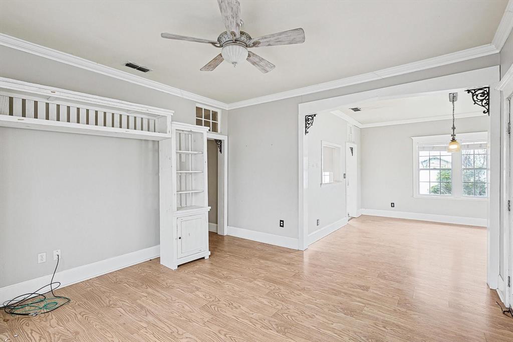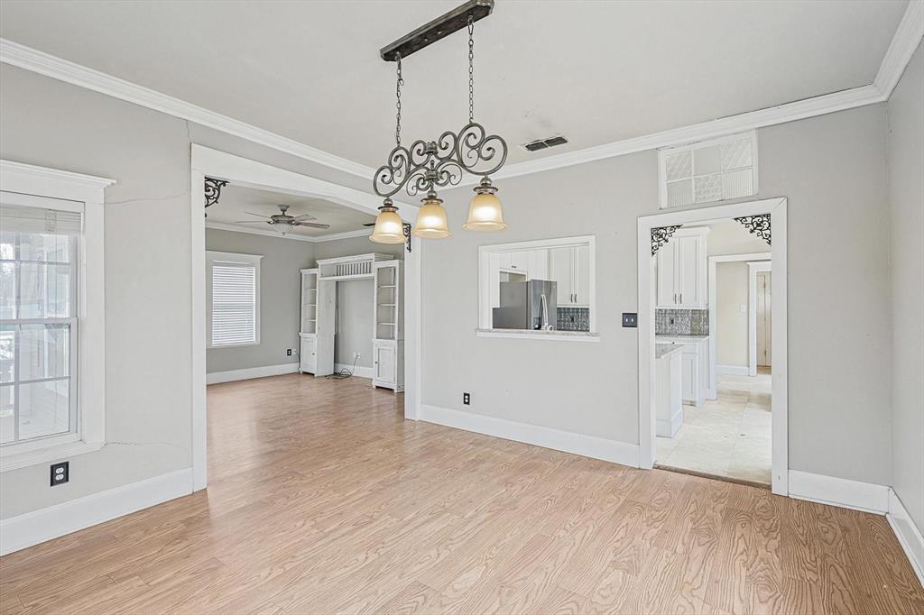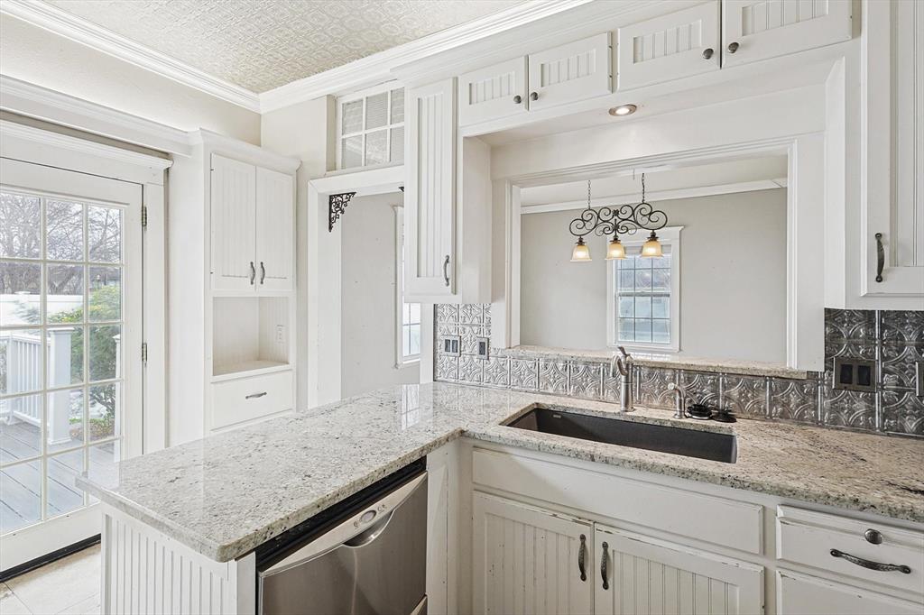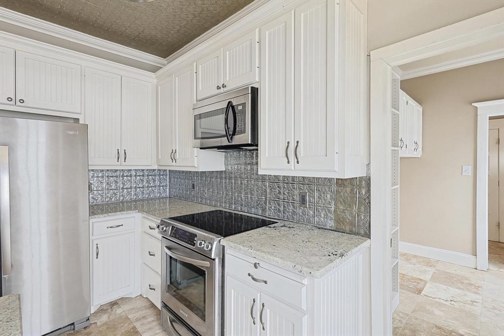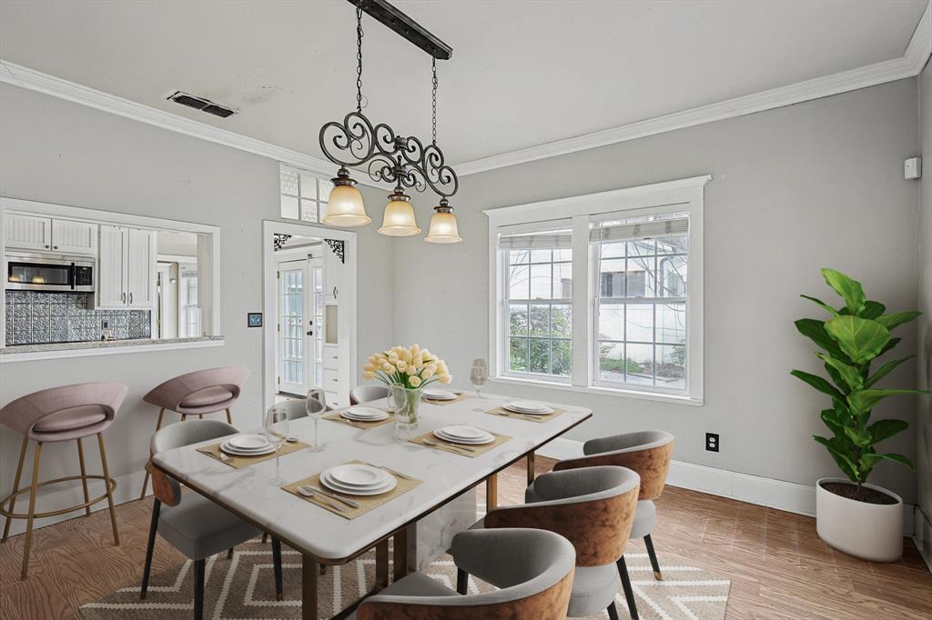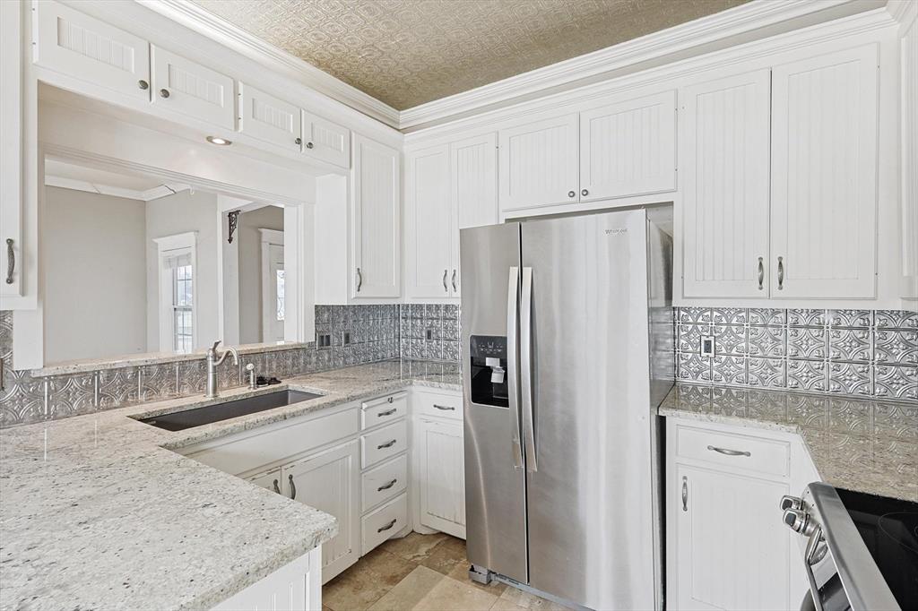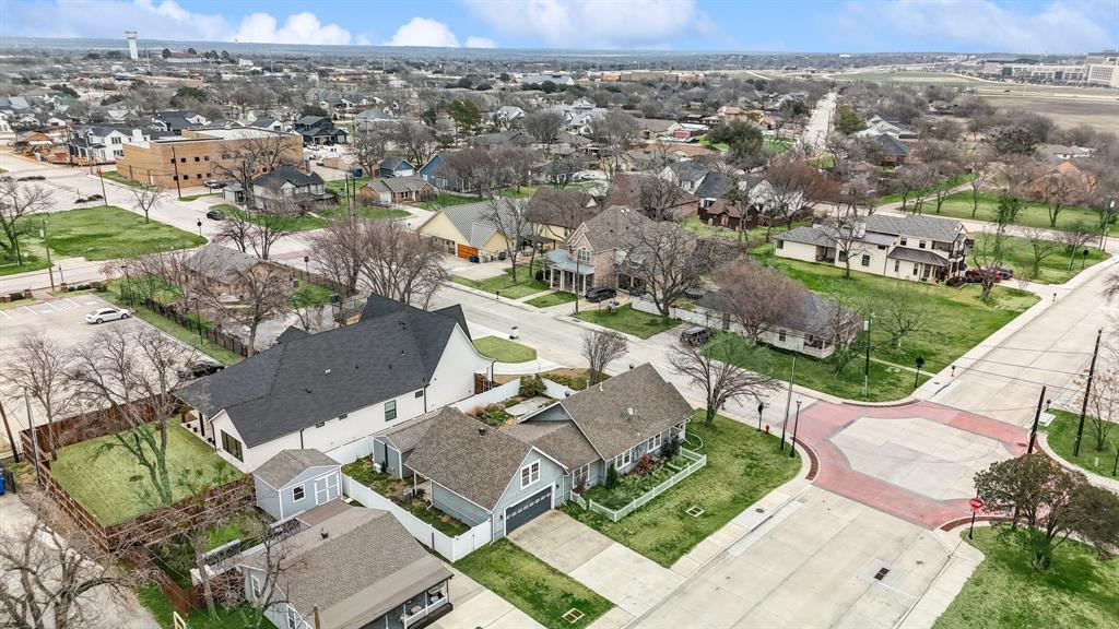 Buyer's financing fell through! Built by Byron Nelson, this exceptional home is nestled on a corner lot just one block from Oak Street in historic downtown Roanoke, seamlessly combining modern amenities with a touch of historical charm. The residence features 2 bedrooms and 2 bathrooms, ensuring ample space and privacy. The interior showcases laminate hardwood and travertine flooring throughout, complemented by 6-inch baseboards and elegant crown molding. The heart of the home is the kitchen, equipped with SS appliances, granite countertops, and storage built-ins. The primary suite includes an ensuite bath featuring a walk-in shower, and the secondary bath is adorned with a clawfoot tub. Additional features include a 600 sq. ft. space above the detached garage, offering tremendous income potential and versatility as a second primary suite, an office, or an efficiency unit. This area is fully decked and ready for drywall. The oversized two-car garage includes a 15 x 7 extra area with a door leading to the backyard and patio, perfect for additional storage needs. The backyard features a 19x11 storage building and is enhanced with a mini-split system and insulation. Located in a mixed-use area, this property perfectly blends residential comfort with commercial potential!