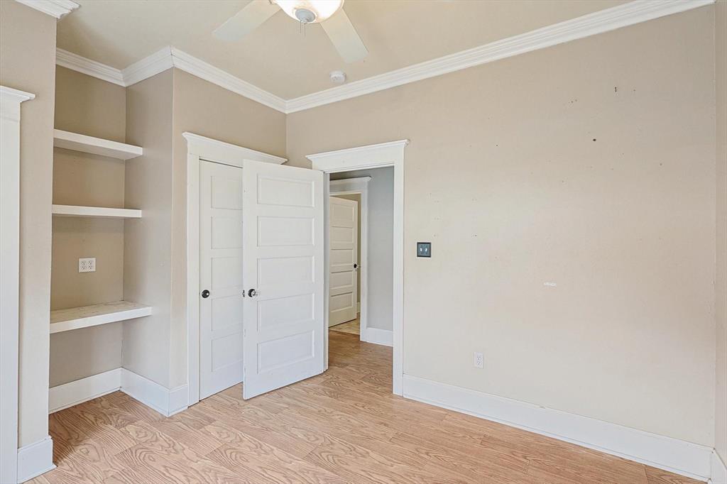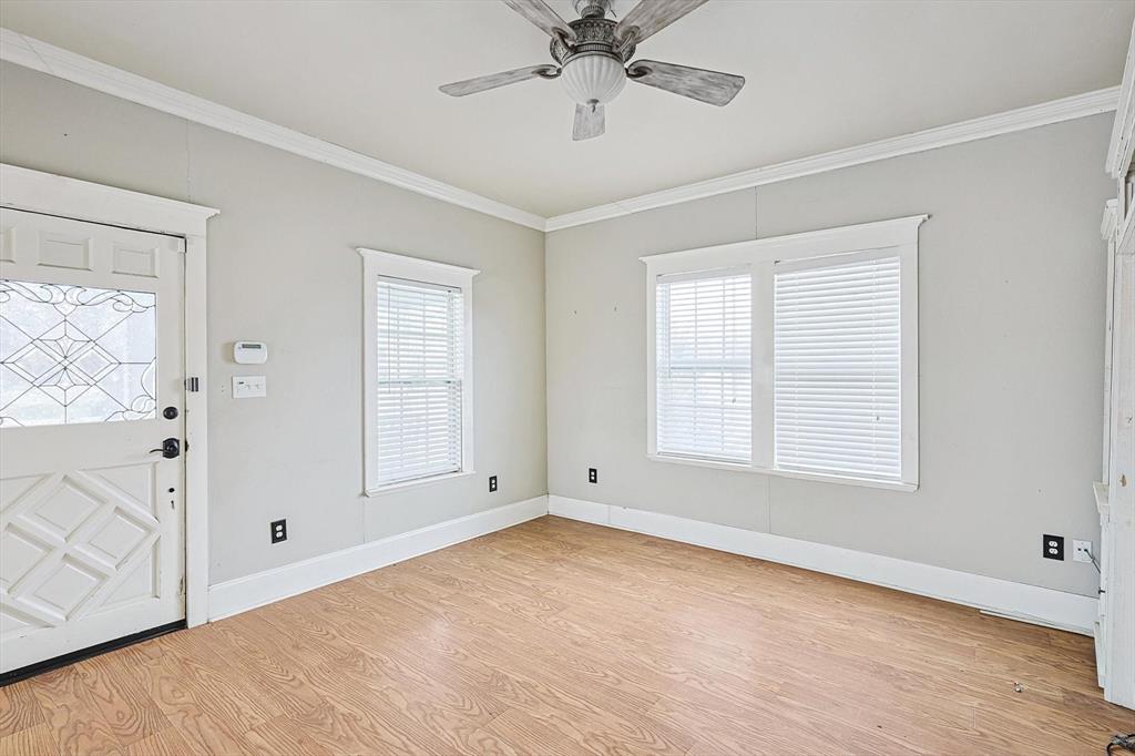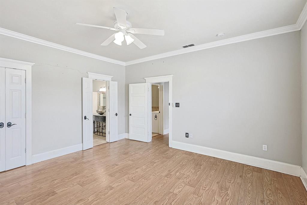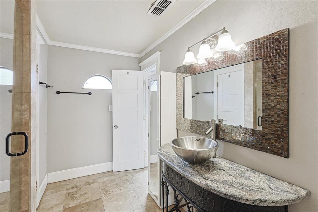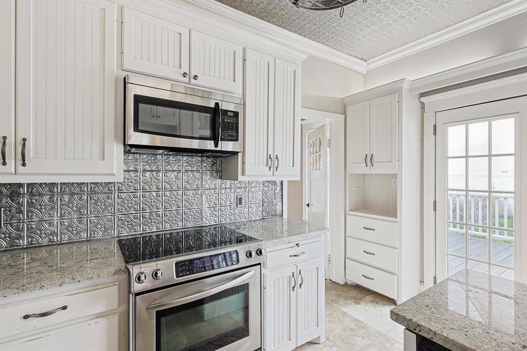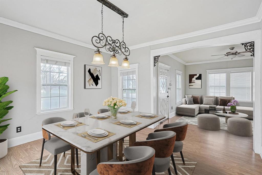 Buyer's financing fell through! Built by Byron Nelson, this exceptional home is nestled on a corner lot just one block from Oak Street in historic downtown Roanoke, seamlessly combining modern amenities with a touch of historical charm. The residence features 2 bedrooms and 2 bathrooms, ensuring ample space and privacy. The interior showcases laminate hardwood and travertine flooring throughout, complemented by 6-inch baseboards and elegant crown molding. The heart of the home is the kitchen, equipped with SS appliances, granite countertops, and storage built-ins. The primary suite includes an ensuite bath featuring a walk-in shower, and the secondary bath is adorned with a clawfoot tub. Additional features include a 600 sq. ft. space above the detached garage, offering tremendous income potential and versatility as a second primary suite, an office, or an efficiency unit. This area is fully decked and ready for drywall. The oversized two-car garage includes a 15 x 7 extra area with a door leading to the backyard and patio, perfect for additional storage needs. The backyard features a 19x11 storage building and is enhanced with a mini-split system and insulation. Located in a mixed-use area, this property perfectly blends residential comfort with commercial potential!