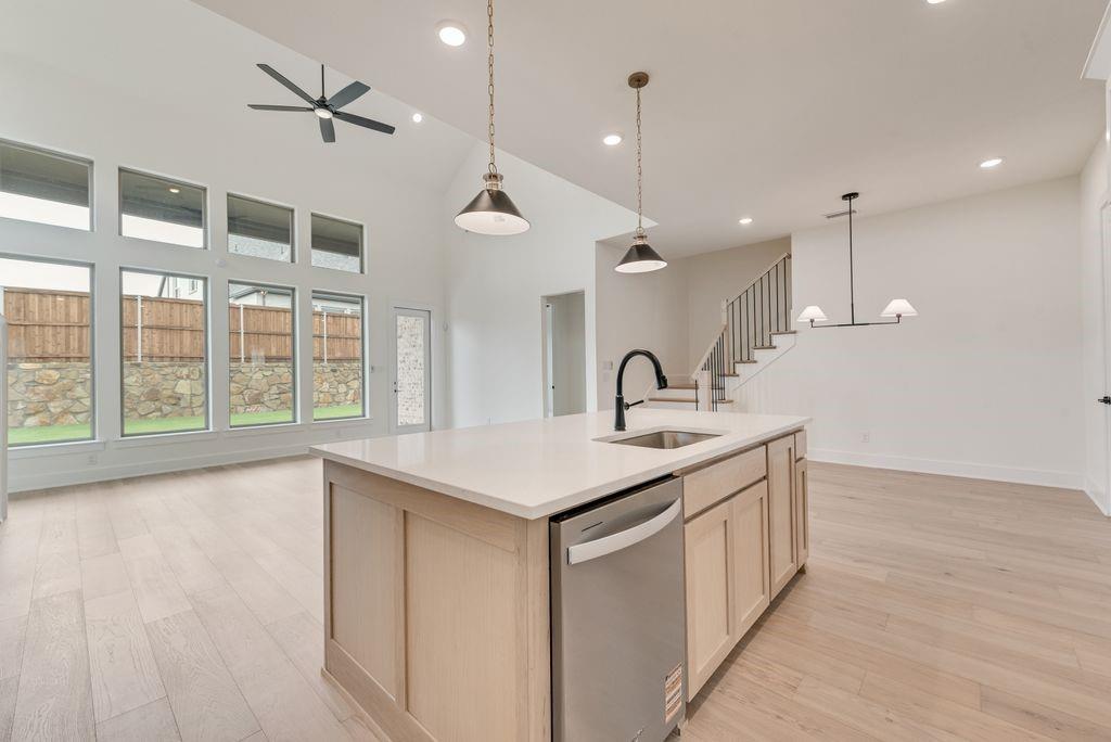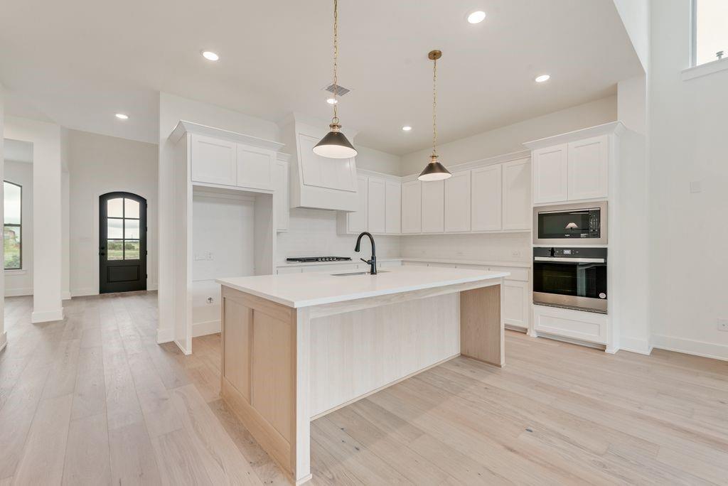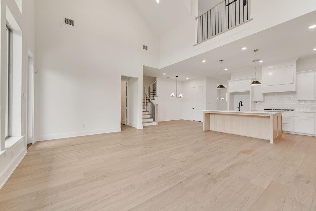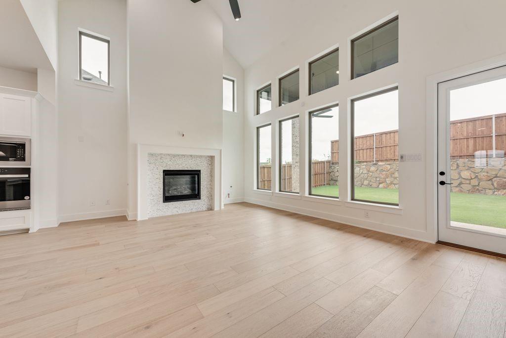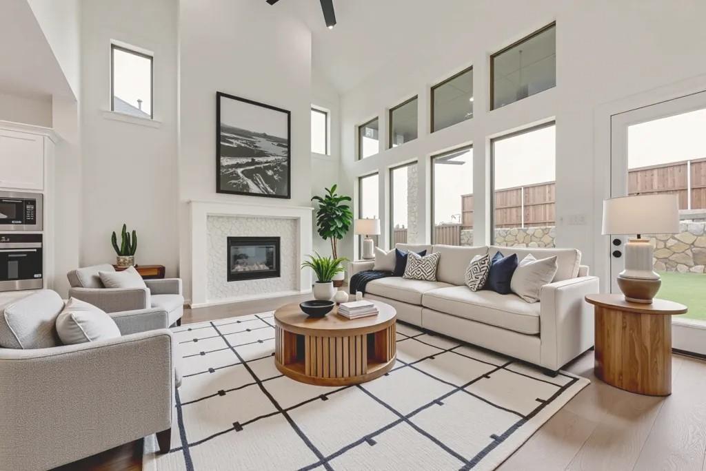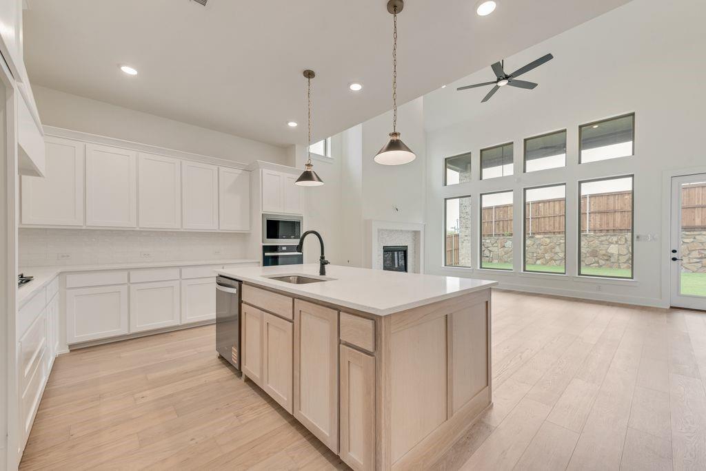 The two-story family has soaring ceilings, fireplace and a wall of windows that offer abundant natural light. The oversized covered patio stretches the full length of the family room, perfect for entertaining! The gourmet kitchen has custom white cabinetry, light quartz tops and a striking white oak island that adds a striking contrast. The primary suite offers a large spa-like bath with a freestanding tub, frameless glass shower and dual walk-in closets—one with bonus storage discreetly tucked under the stairs. A private secondary bedroom with en-suite access is on the first floor.
