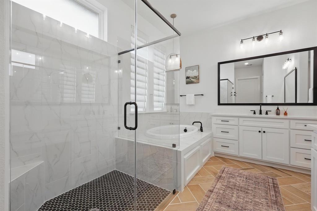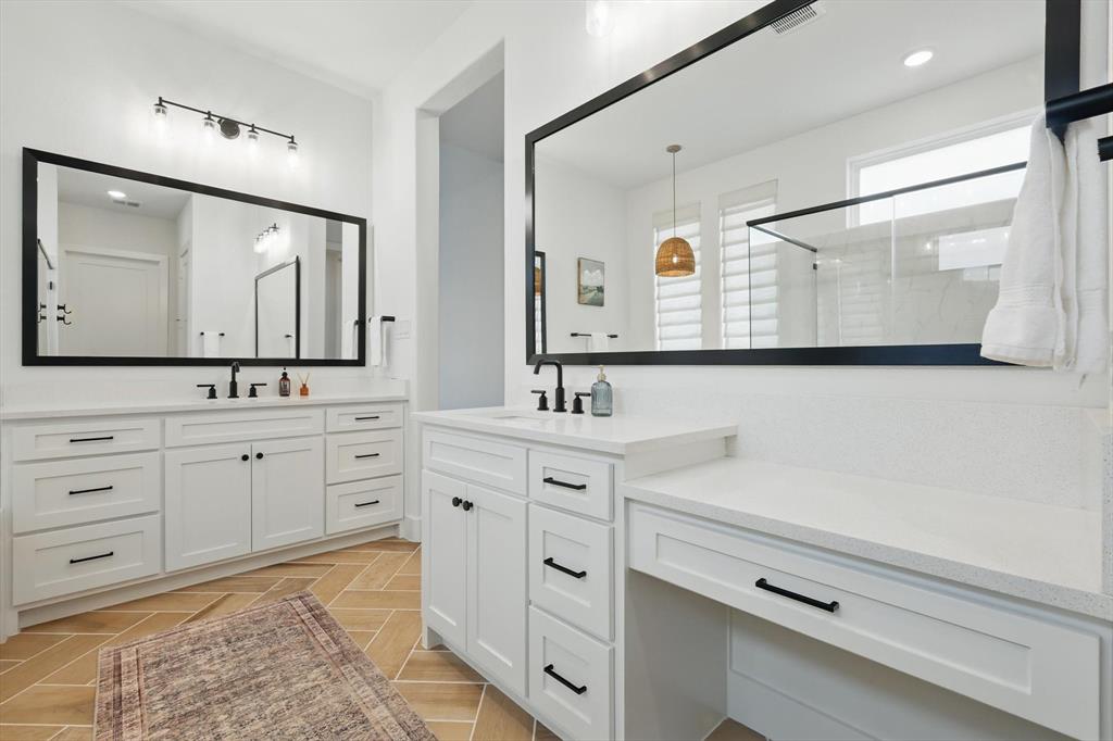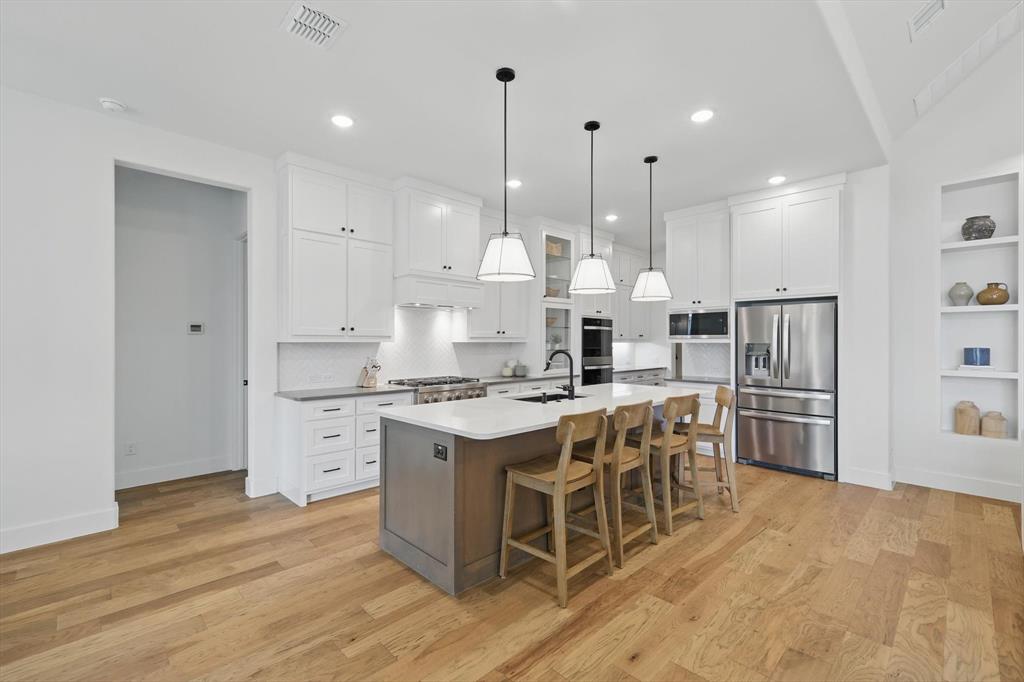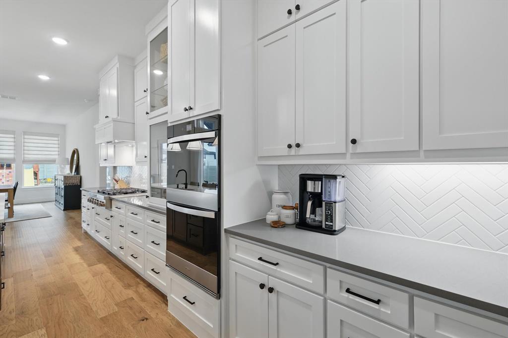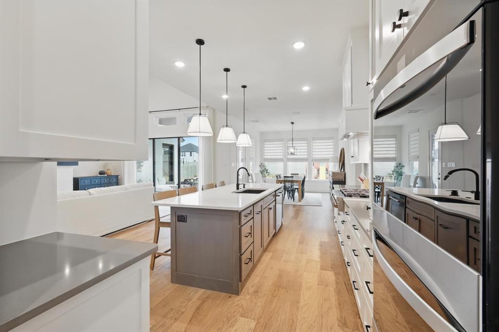 This impressive 2023 custom-built Drees home, ideally situated on a corner lot with serene greenbelt and water views. This meticulously designed single-story residence is move-in ready and tailored for both luxury and everyday living. Designed for privacy and convenience, this home boasts five generously sized bedrooms, each with its own ensuite bath, including a Jack & Jill setup for the front bedrooms. The owner’s suite is a true retreat, featuring a spa-like bathroom with a soaking tub, separate shower, dual vanities, and an oversized walk-in closet. A private entrance to the back patio provides effortless access to your outdoor haven. At the heart of the home is the gourmet kitchen, a culinary dream featuring a spacious island, double ovens, and designer finishes, perfect for entertaining. Flowing seamlessly into the expansive living area, the space is illuminated by three-panel sliding glass doors, connecting the indoors to the oversized covered patio—ideal for enjoying breathtaking sunsets and tranquil surroundings. The