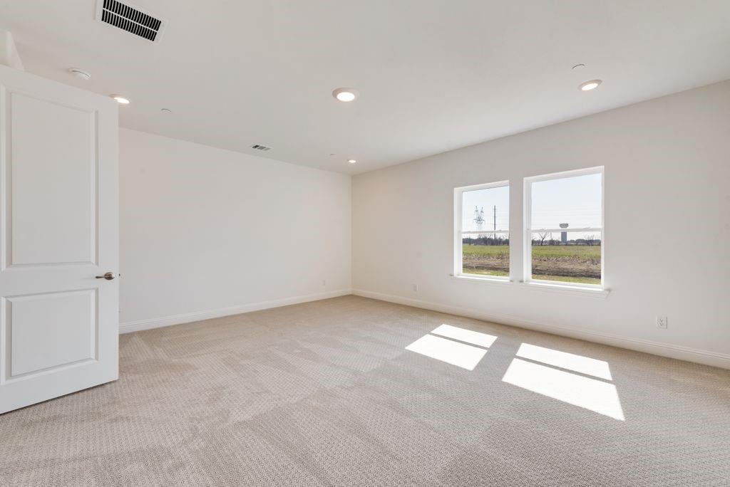 The spacious Formal Living or Den offers an inviting atmosphere, perfect for both quiet relaxation or lively gatherings. The luxurious Primary Suite overlooks serene neighborhood pond with tranquil fountain, & adjoining bath is a retreat with a freestanding tub, separate vanities with rectangle sinks, a frameless glass shower, a window seat, & a spacious walk-in closet with island.