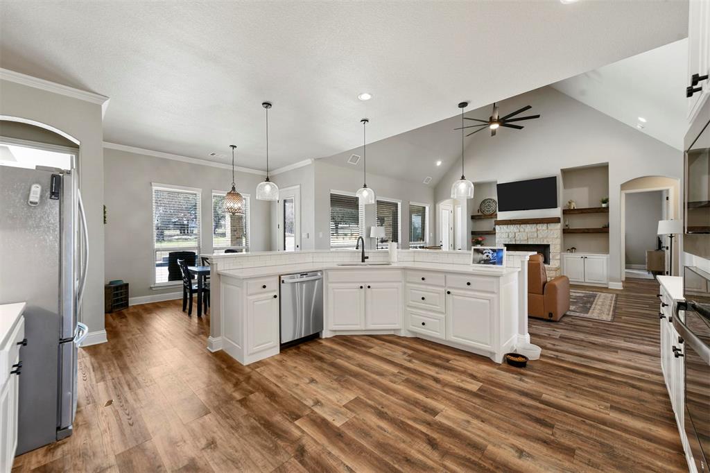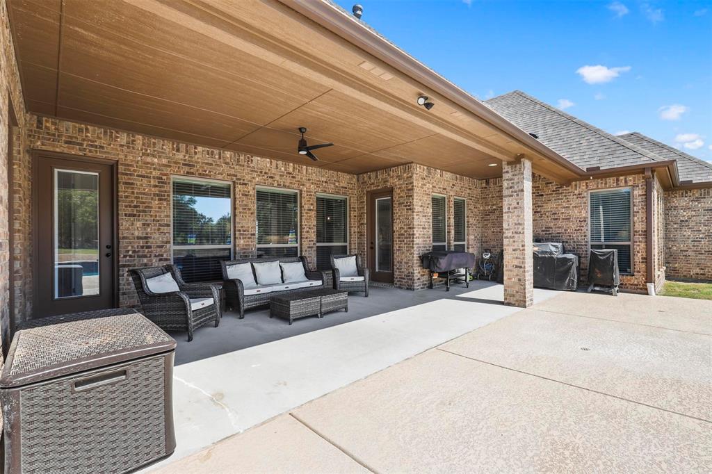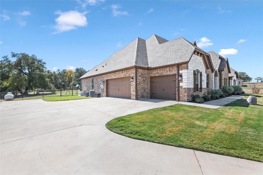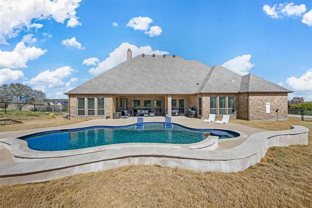 ** SPECIAL BELOW MARKET INTEREST RATE FINANCING OPTIONS AVAILABLE! UP TO $20,000 SELLER CONTRIBUTION TOWARDS BUYER'S LENDING INTEREST RATE BUY DOWN OR TOWARDS BUYER'S CLOSING COSTS. EXISTING 3.125% VA LOAN IS POTENTIALLY ASSUMABLE FOR QUALIFYING VETERANS! Beautiful brick and stone home, perfectly situated high on an elevated lot with amazing sunsets and incredible long range views. Very well kept and showing as next to new, this wonderful home has a terrific open concept floor plan of hard surfaces throughout flowing seamlessly kitchen to living to dining, the perfect layout for living and entertaining! Large living room with a soaring cathedral ceiling with wood beams and a gas fireplace in stone, flanked by built in shelving gives a sense of immediate warmth and welcoming. Chef's dream kitchen with gleaming stainless appliance suite, loads of cabinetry, miles of quartz counters, extended bar and eat in breakfast nook. A formal dining room elevates the dining experience. Primary bedroom with ensuite spa like bath of dual vanities, soaking tub and dual entry walk in shower. Large game or media room can also serve as an office area. Mud room area with built-in bench. The large covered back patio leads to the all season, heated pool in the fenced back yard. Owned propane tank serves gas cooktop, water heater, fireplace generator and pool heater. Whole home backup generator, tankless water heater, programmable irrigation system, full rain gutters and well with whole home water filtration and softener. Brock ISD.