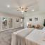 The open-concept design is ideal for modern living, seamlessly connecting the kitchen, dining, and living areas under a high sloped ceiling to create an expansive and inviting space for entertaining. The oversized primary bedroom is a true sanctuary with a cathedral ceiling that adds to its spacious feel with room for a sitting area, and is tucked far away from other bedrooms and living areas, yet has direct access to the back yard through french doors.