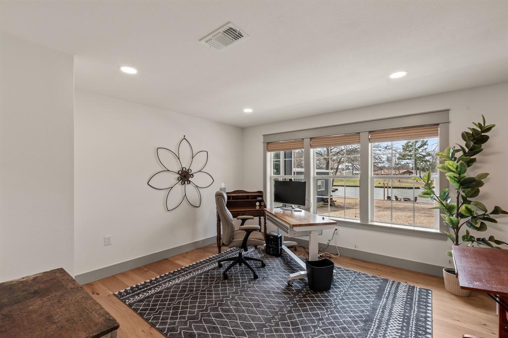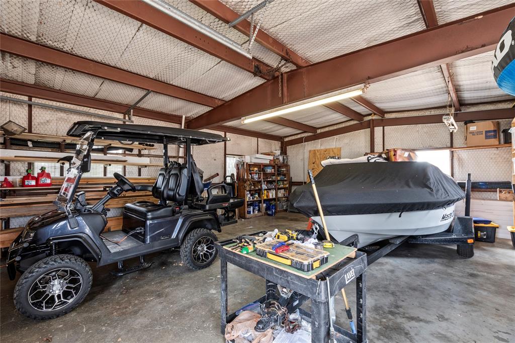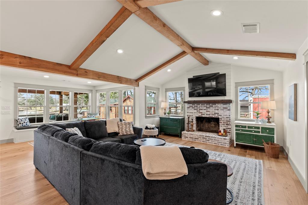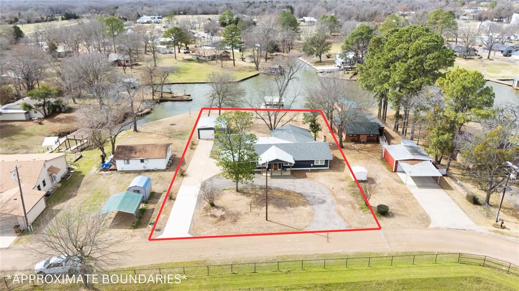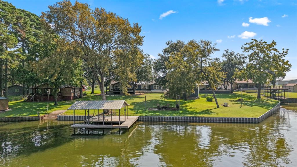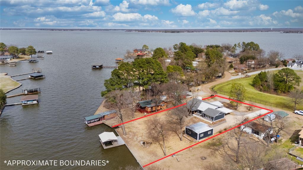 This stunning lake house, fully gutted and expanded in 2023, blends modern farmhouse charm with easy lakefront living. Boasting wood beam vaulted ceilings, shiplap walls, and real wood floors, the open-concept design creates an inviting and spacious atmosphere throughout. The cozy wood-burning fireplace adds a touch of warmth, while the sliding barn doors provide a nod to rustic elegance. With 14 windows across the back of the home, the views are nothing short of spectacular, offering panoramic water vistas from every angle. A corner nook with a window seat creates the perfect spot for family game nights. The gorgeous kitchen is a chef's dream, featuring high-end appliances, including a Sub Zero refrigerator and freezer, quartz countertops, a beverage refrigerator, and an ice machine. The large island offers plenty of seating and a prep sink, making this space perfect for both entertaining and everyday living. The 550 sq. ft. covered porch overlooks a flat, gently sloping half-acre lot with 125 feet of prime waterfront on a peaceful cove. Enjoy outdoor living by the firepit or under the shade of magnificent magnolia and pecan trees. A circle driveway and ample parking space for multiple vehicles, along with a carport, ensure convenience for guests. A detached 30x24 metal building offers additional parking and storage for vehicles, boat, water toys, golf carts, or could be transformed into a fun waterside game room or workshop. There's plenty of space to add a pool if desired. The new boathouse decking and electric were updated in 2023. Located on the west side of the lake close to Lone Star Marina, Tiki Hut, Figs Steakhouse, Triple N Ranch Winery, and more. Furnishings and watercraft available separately. While the exterior of the home has been beautifully remodeled, you truly have to step inside to appreciate its full beauty.
