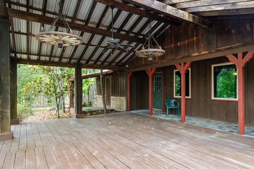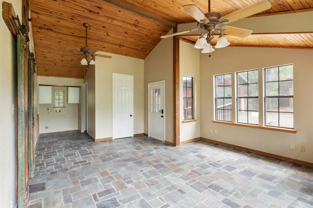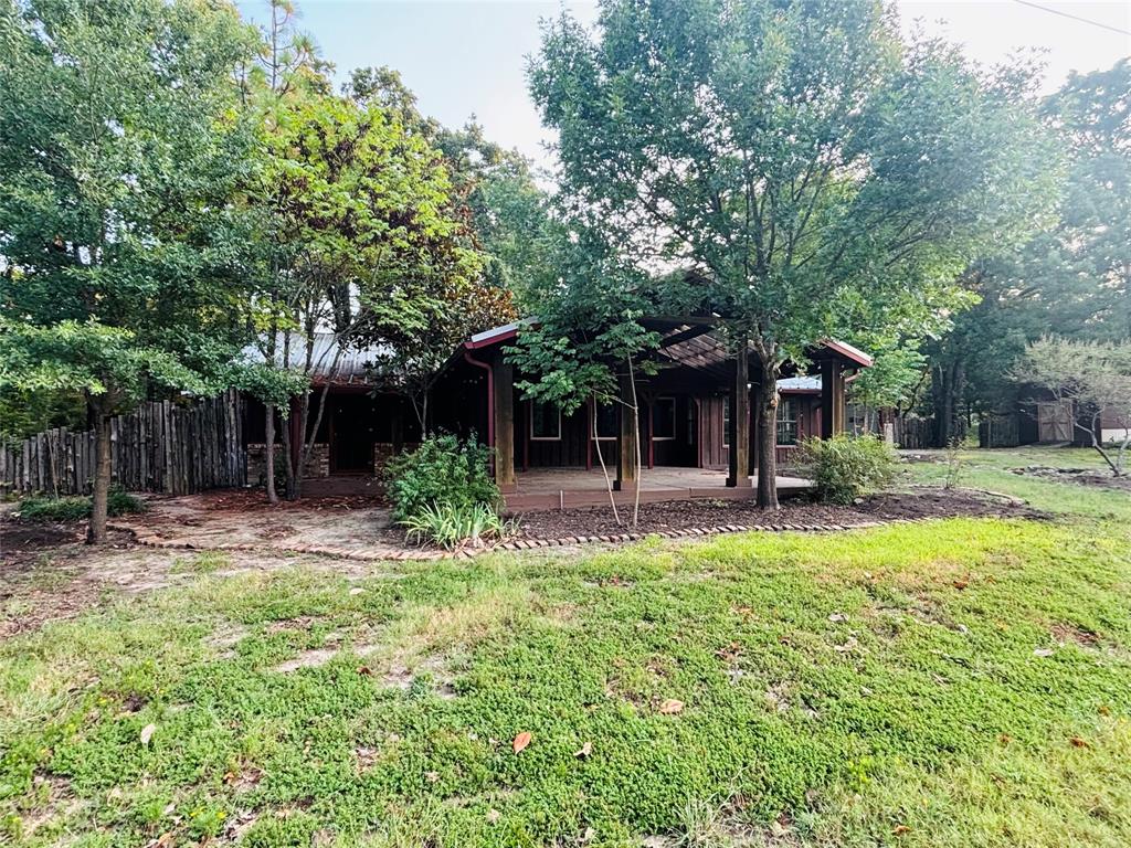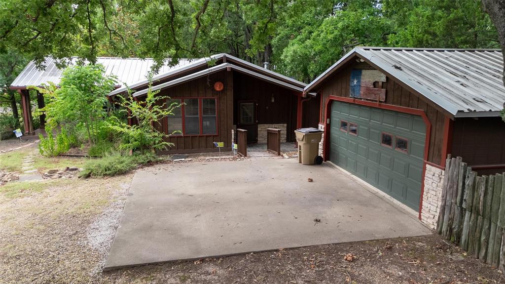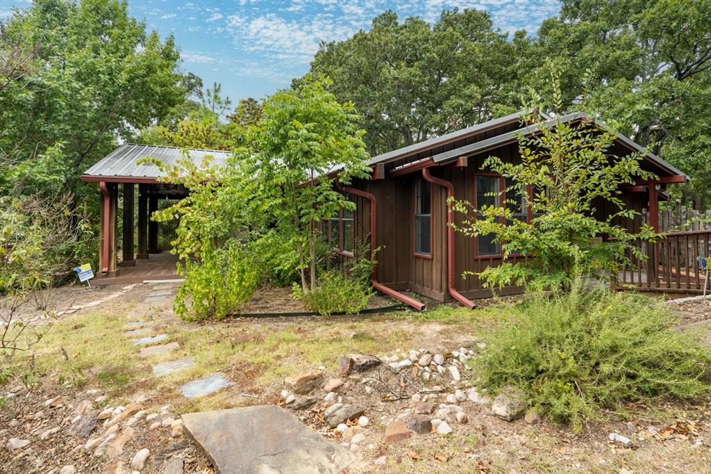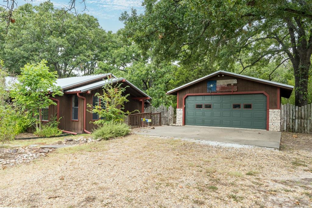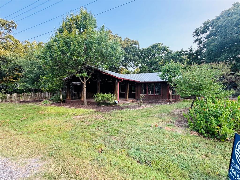 This cedar cabin sits across from waterfront homes on a double lot with fenced back yard. First thing you notice is this charming curb appeal! There is a large open beam covered patio covering this breezy front porch where you can take in the lake views! Step inside to an open, split bedroom design. The island kitchen has 5 burner gas cooktop, all stainless appliances including built in microwave. There are barn doors that open to a vaulted, tongue and groove ceiling master with lots of natural light and views to the lake. The guest bedrooms are off on the other side, one with a direct patio entry of it's own. The baths have heated floors for those crisp, winter mornings, what more can you ask for in this cozy layout? Natural slate floors, dramatic country red cabinets in the kitchen with granite countertop. Lots of room to grow a garden on the second lot, ample privacy and certainly plenty of room to park if you have an RV or a boat. The detached oversized two car garage is a drive through, dual door design. Freshly painted throughout.