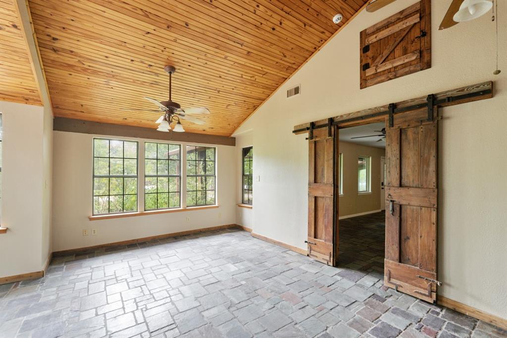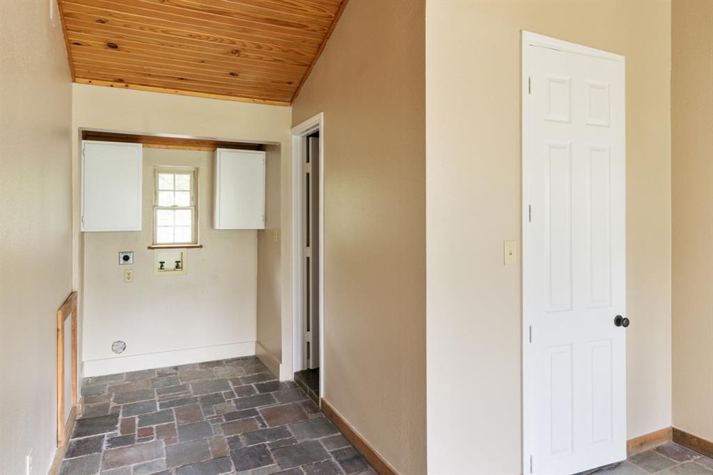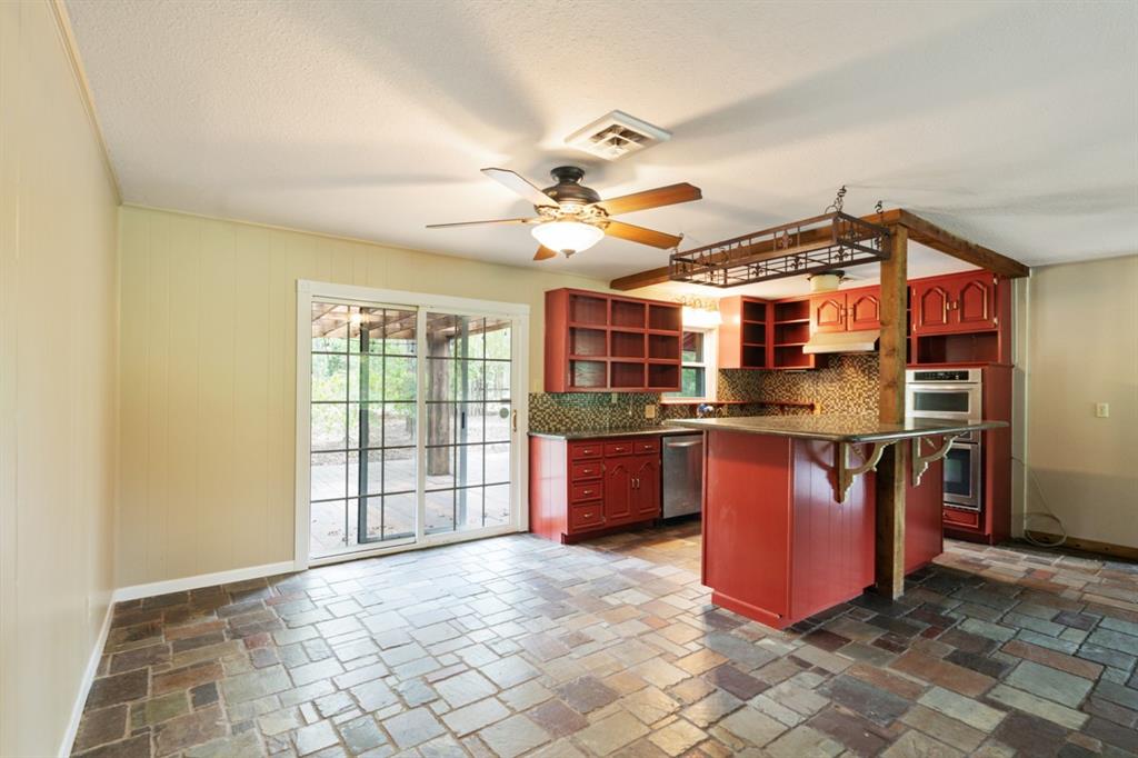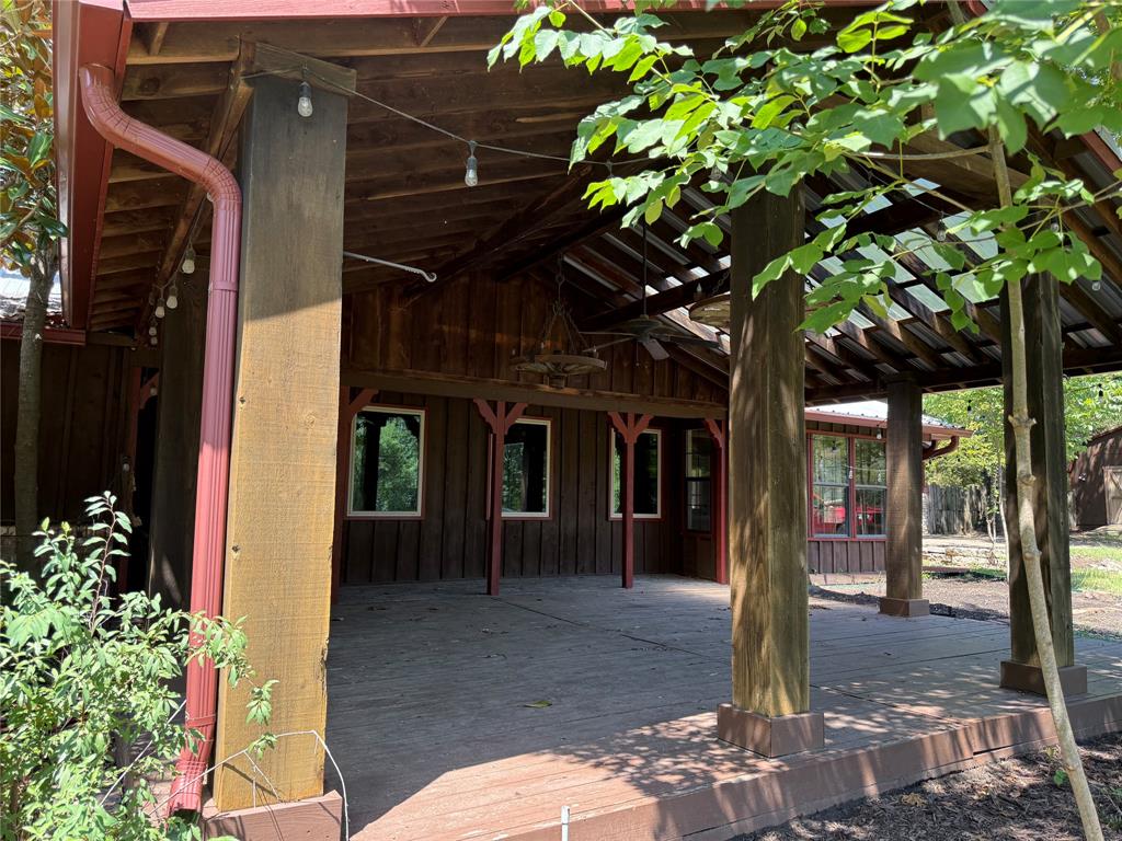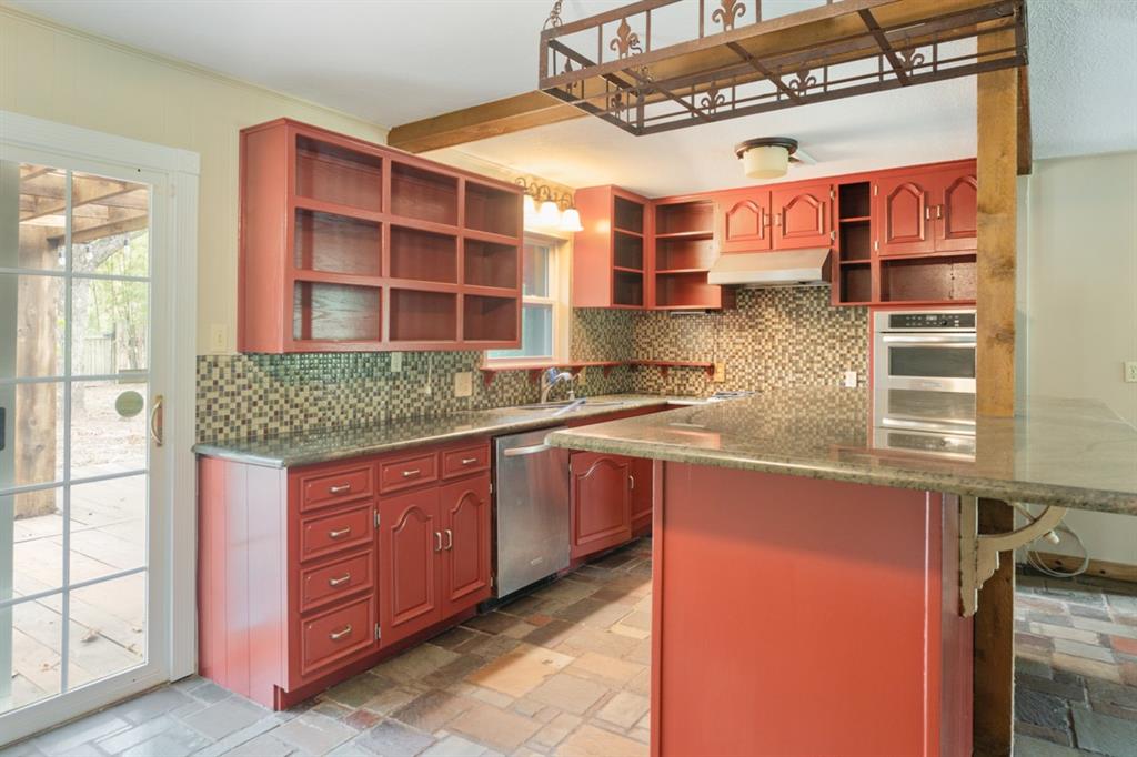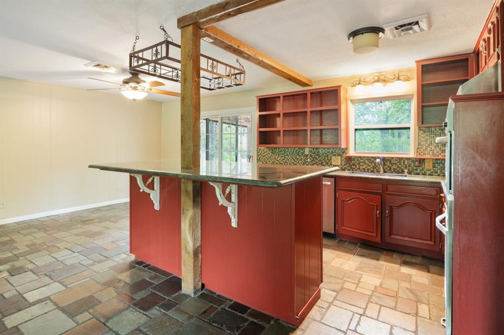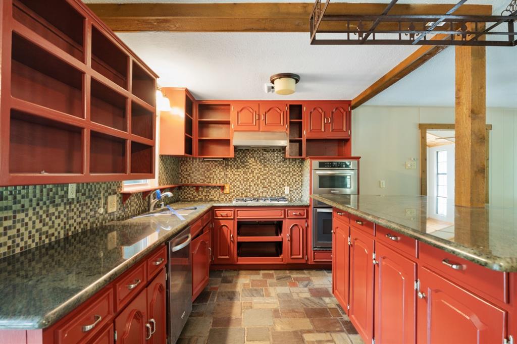 This cedar cabin sits across from waterfront homes on a double lot with fenced back yard. First thing you notice is this charming curb appeal! There is a large open beam covered patio covering this breezy front porch where you can take in the lake views! Step inside to an open, split bedroom design. The island kitchen has 5 burner gas cooktop, all stainless appliances including built in microwave. There are barn doors that open to a vaulted, tongue and groove ceiling master with lots of natural light and views to the lake. The guest bedrooms are off on the other side, one with a direct patio entry of it's own. The baths have heated floors for those crisp, winter mornings, what more can you ask for in this cozy layout? Natural slate floors, dramatic country red cabinets in the kitchen with granite countertop. Lots of room to grow a garden on the second lot, ample privacy and certainly plenty of room to park if you have an RV or a boat. The detached oversized two car garage is a drive through, dual door design. Freshly painted throughout.