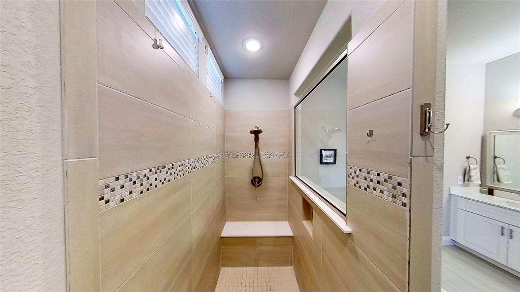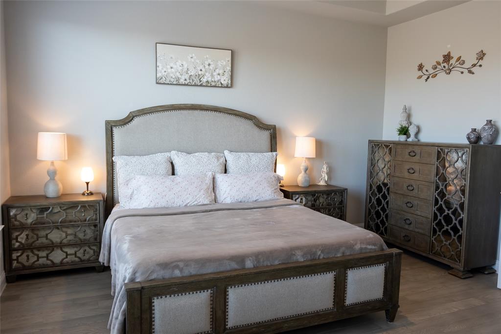The primary suite, located on the main floor, is a true retreat. It boasts a spa-like en-suite bath featuring an oversized walk-in shower with a stunning designer tile surround, a soaking tub, dual vanities with quartz countertops, and a spacious walk-in closet. A guest suite with a private bath is also conveniently located on the main level, perfect for visitors or multigenerational living.