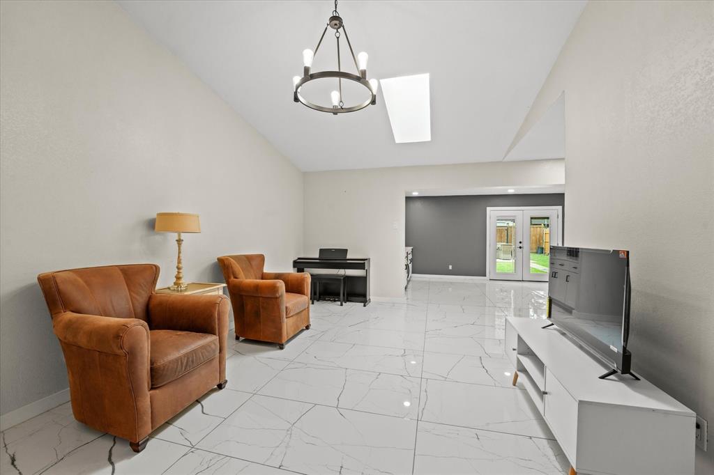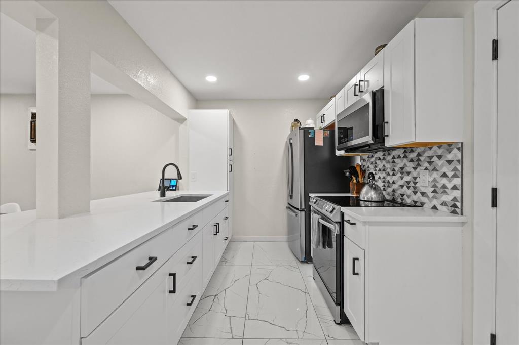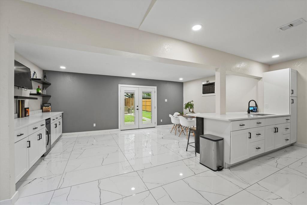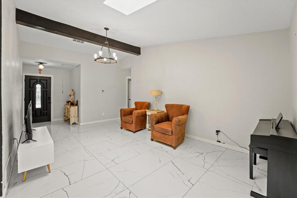 Discover this beautifully renovated ranch-style home's perfect blend of comfort and style. Featuring 3 bedrooms, 2 bathrooms, and spacious living areas, this property offers a seamless combination of classic design and contemporary upgrades. Enjoy the expansive living room with gleaming marble-like tile flooring, modern lighting fixtures, and a neutral color palette that enhances the natural light—a stunning kitchen equipped with stainless steel appliances, sleek white cabinetry, and a central island with bar seating. A perfect bar area with built-in shelves and a wine cooler adds a touch of luxury, which is ideal for entertaining. The fenced backyard is a private oasis with a covered patio area and plenty of green space for outdoor activities. Make this beautiful property your new home and enjoy its blend of lifestyle and comfort! Washer and dryer included. The house is sold as-is. The seller will not make any repairs.