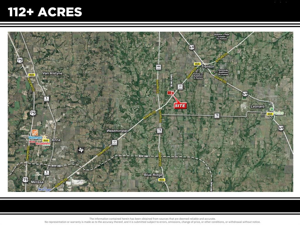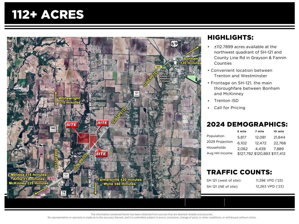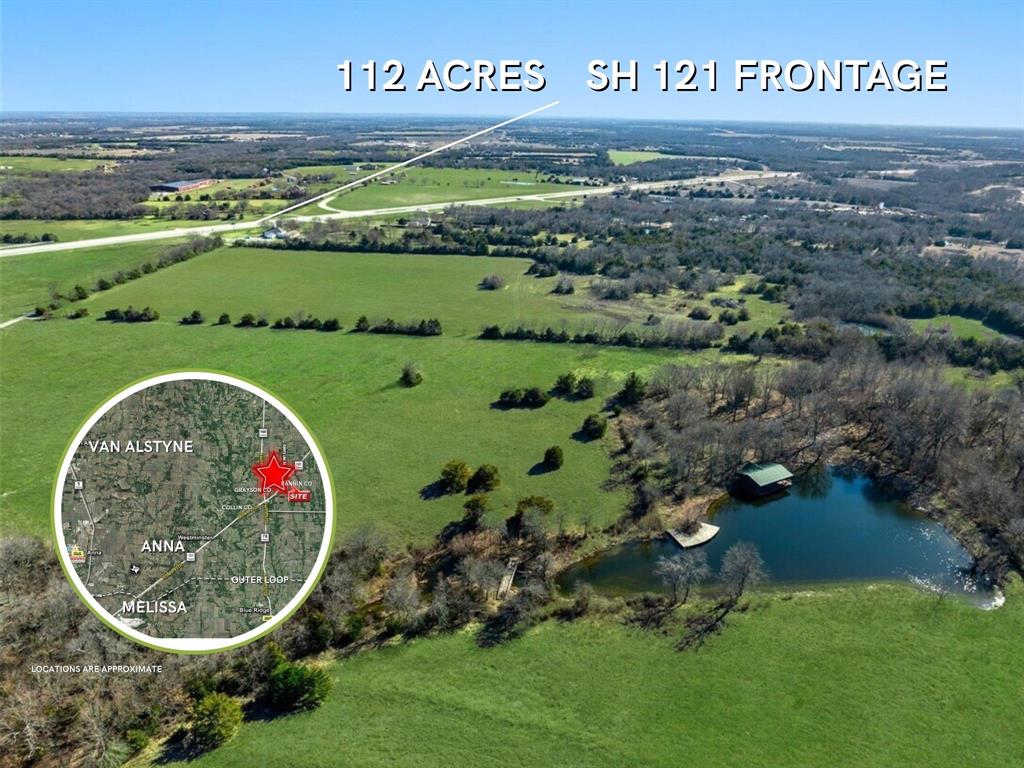 112+ ACRES with SH 121 frontage near the hub where Grayson, Fannin and Collin Counties connect. Within the high growth corridor, three combined parcels offer generous SH 121 frontage plus additional frontage on Eastline Rd. Great location, incredible road frontage and beautiful land with a large tank and large covered dock, a hard combination to find but here it is! Prime investment opportunity, multiple developments in the area with some of today's most recognized builders. Develop today or hold for investment. Minutes to Anna, Melissa and McKinney. Approximately 50 miles North of Dallas and Dallas Fort Worth Airport.