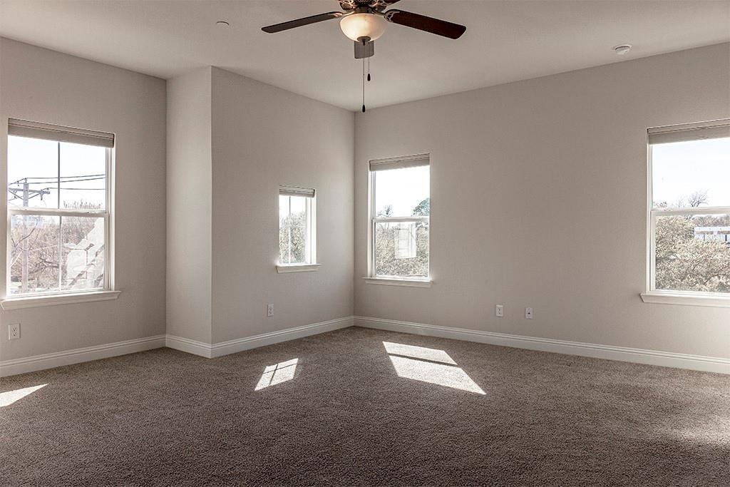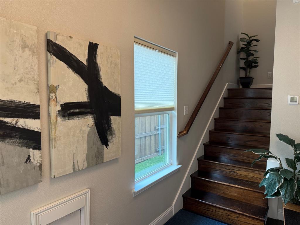 Desirable end unit 3-story townhome in the heart of Old Town Lewisville! 3 BR + Study, 3.5 Bath with an inviting front porch, covered back patio & small fenced backyard w green artificial turf! Light & bright open plan! Wood floors! Ground floor has a welcoming Foyer & a private BR w French door to covered patio & open courtyard w green artificial turf & stained wood privacy fence! 2nd floor has open spacious kitchen w SS appls including fridge, walkin pantry, white shaker cabinets, quartz counter, and a large open living-dining space, private Study & half bath! All BRs have ensuite baths! 3rd floor features Primary BR w tiled sep shower, free-standing tub, 2 sinks & big walkin closet! There's another 3rd floor BR w full bath & WIC! Laundry closet conveniently located in hall between BRs - includes full size washer & dryer! Top down bottom up window shades! Modern living, energy-saving features! 2 car garage. Great location! Walk to shops, restaurants & concerts in the park! Lewisville ISD. Minutes to DFW Airport, easy access to I35 & Hwy 121. You'll love the walkable lifestyle!