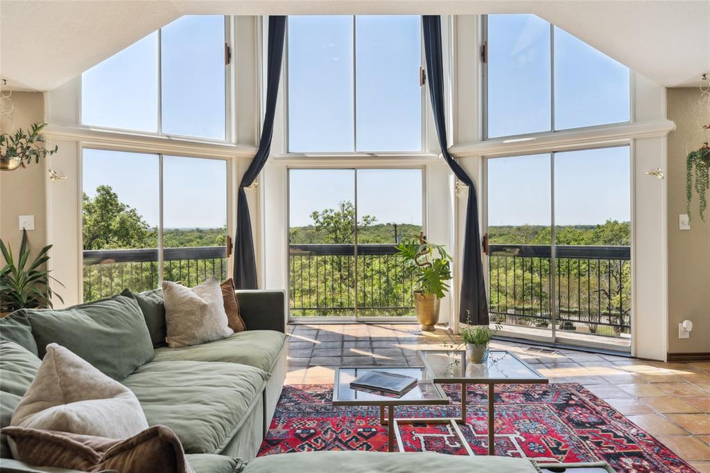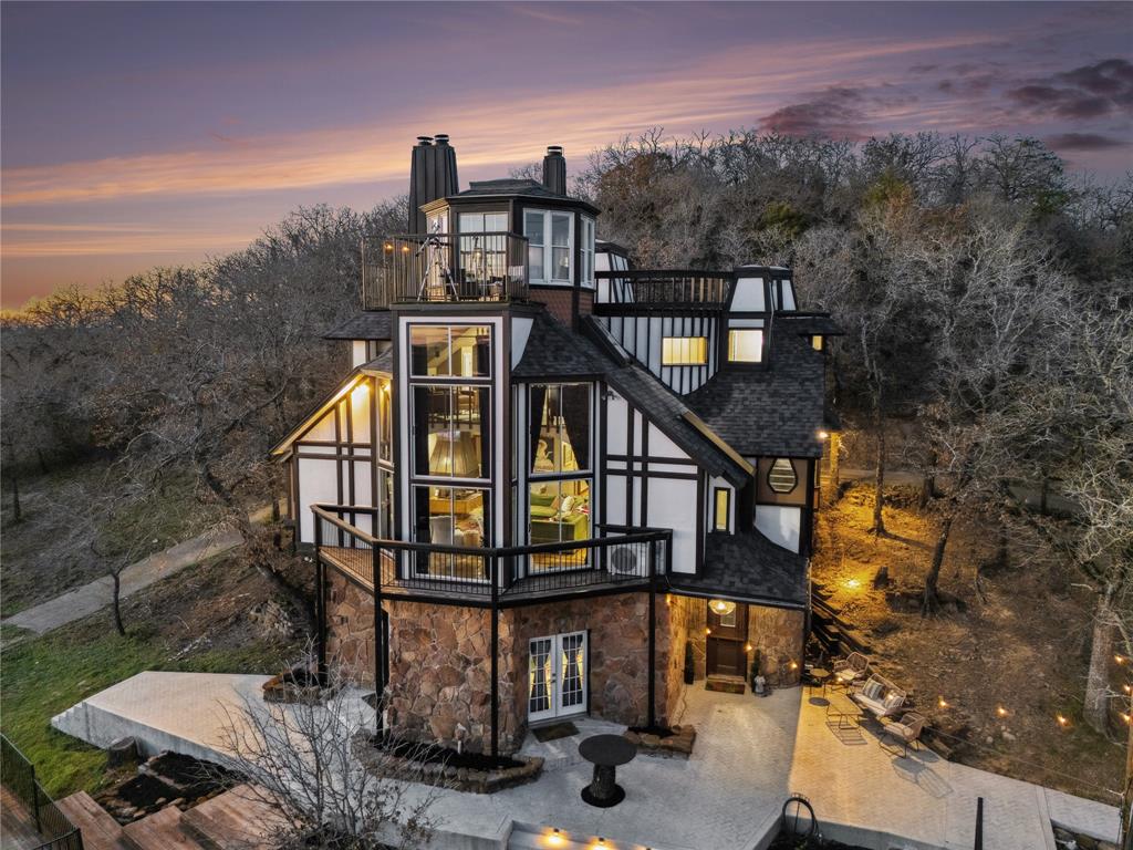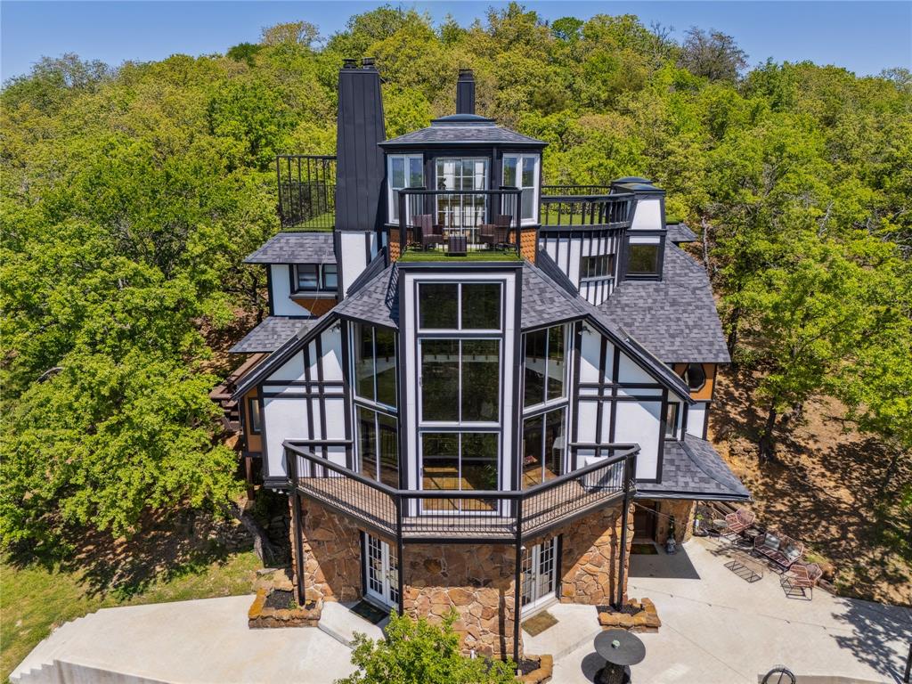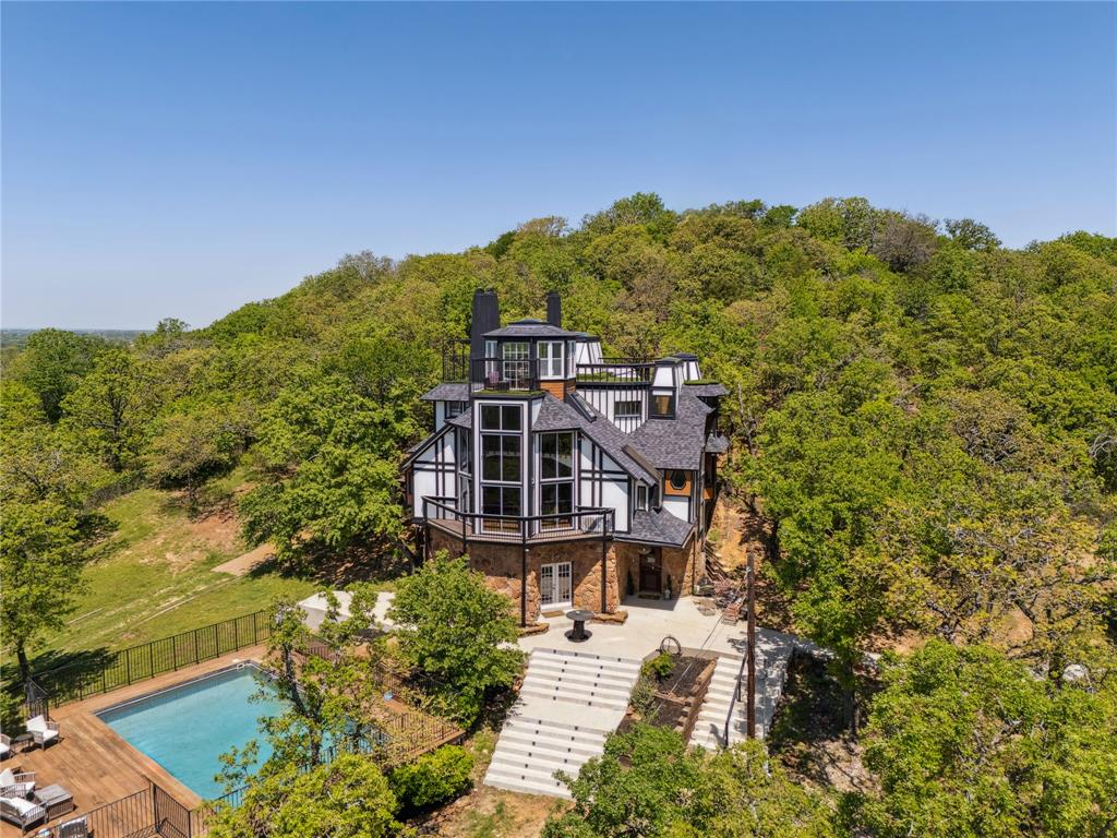Welcome to 1412 Apache Court—an architectural masterpiece inspired by Frank Lloyd Wright. Perched atop Caddo Peak, the highest point in Johnson County, this custom three-story home offers unparalleled privacy and panoramic views. It's design evokes the charm of a unique treehouse while celebrating bold and timeless style.