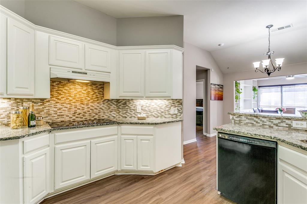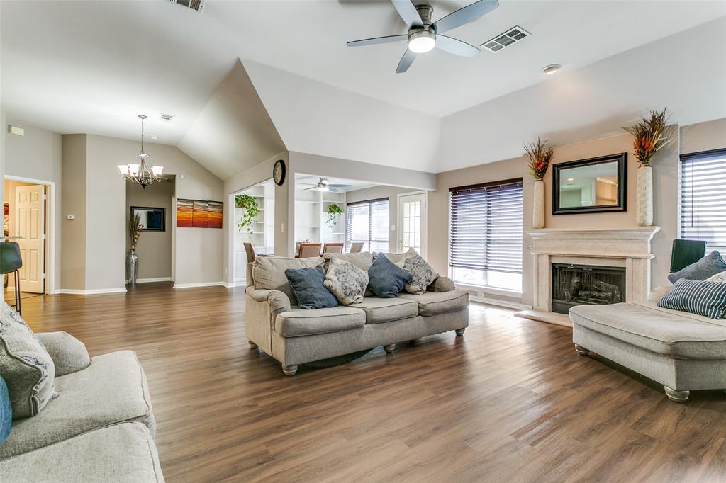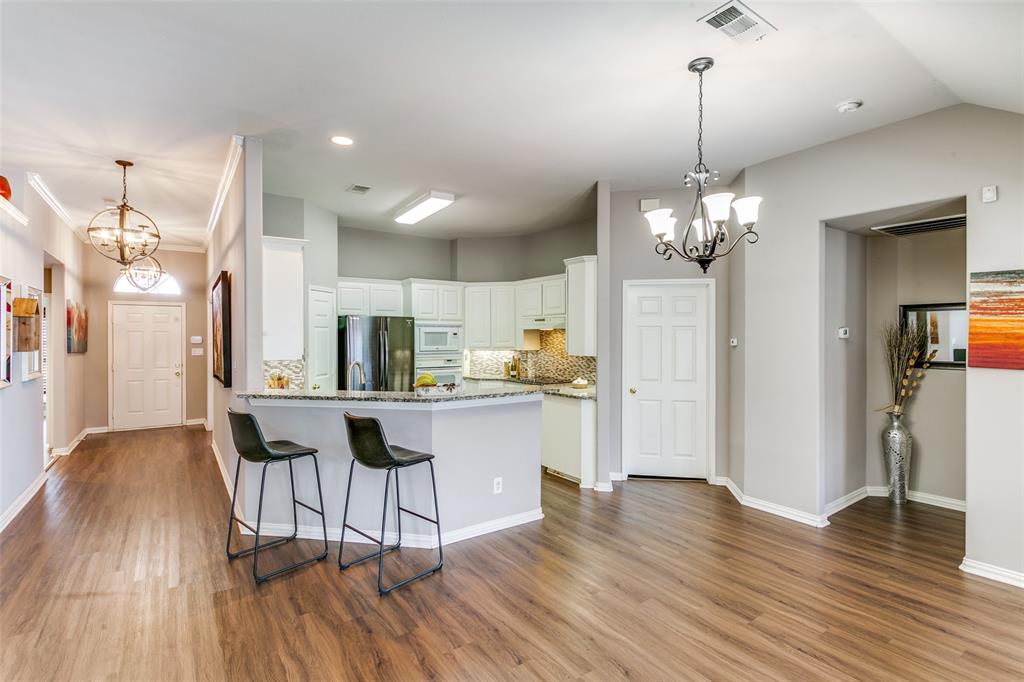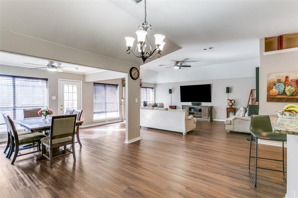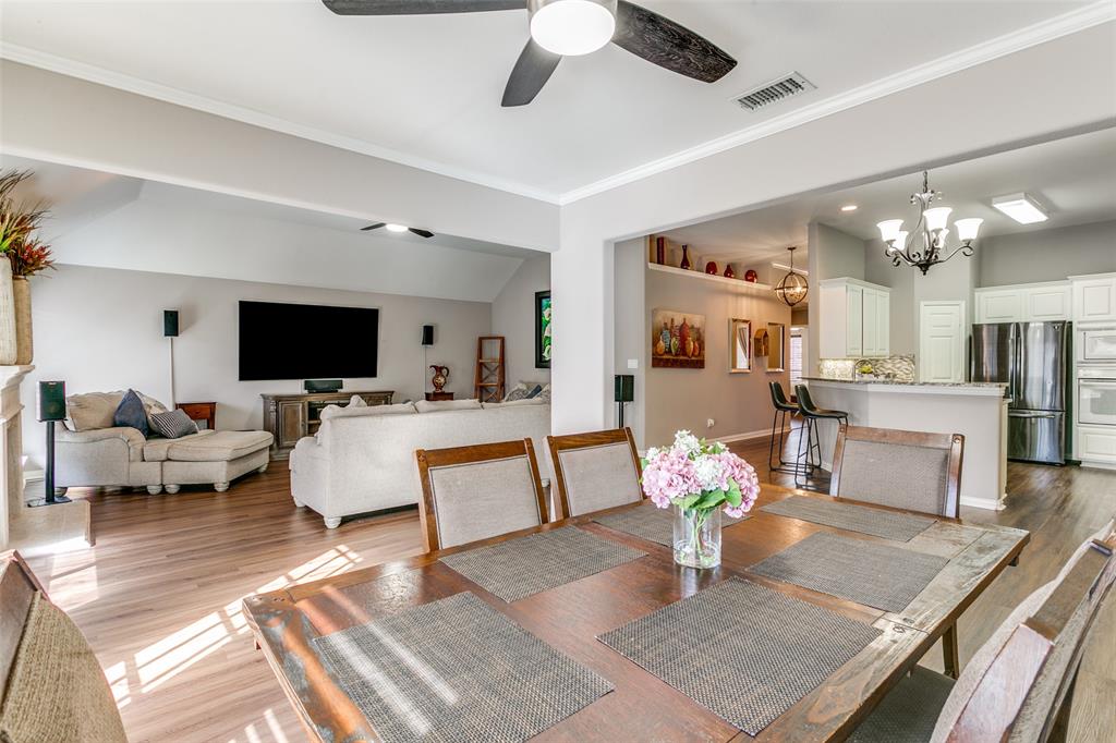 The open-concept living, dining, and kitchen area is ideal for everyday living and entertaining. The kitchen includes granite countertops, plenty of workspace, and flows into a dining area with custom built-ins for storage and display.